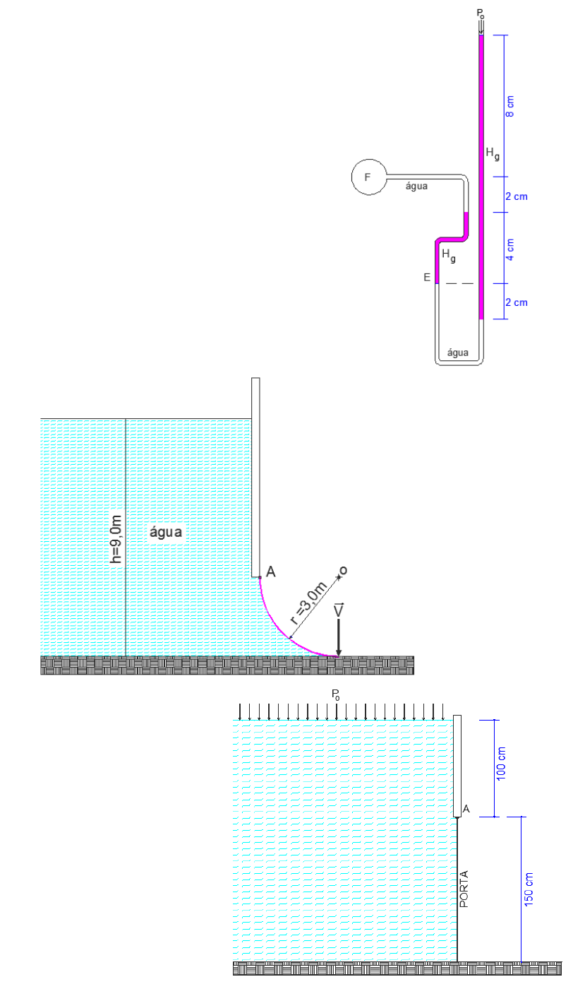 1ª Avaliação Bimestral - Período Letivo: 2016/I - Data: 07 de abril de 2016. Questão 01 (1,5 pontos). Calcular qual o valor da pressão relativa que estará ocorrendo no ponto F da tubulação que conduz agua mostrada na figura. Adotar como peso especifico do mercúrio Hg sendo de γ=13600 kgf/m3. Resposta em kgf/m2. Questão 02 (1,2 ponto). Faça a conversão, isto é, calcule qual o valor da pressão de 25,825 mca em: atmosferas, mm de Hg, kgf/cm2, kgf/m2, bar, pascal (Pa). Usar g=9,81 m/s2 Questão 03 ( 1,3 ponto). A tensão de cisalhamento, σw , num camada depende da distância (x) em relação à borda de ataque do objeto, da massa especifica (ρ), da viscosidade (μ) do fluido e da velocidade de corrente do escoamento U. Obtenha os grupos adimensionais que se vinculam a essa força de cisalhamento. Questão 04 ( 3,0 ponto). Qual será o valor da força Vertical (V) resultante necessária que deverá ser aplicada na comporta do desenho para ela permanecer fechada, cuja extensão tem um total de 4,0 m? A articulação da comporta fica no ponto A. (Resposta em kgf). Questão 05 (2,5 ponto): Uma porta com 1,00m de largura e 1,50m de altura localiza-se numa das paredes verticais plana de um grande tanque dágua. A porta tem uma articulação na sua borda superior, a qual ficará a 1,00 de profundidade abaixo do nível dágua do tanque. A pressão atmosférica atua na parte externa da porta e na superfície dágua. Determinar qual a resultante das forças hidrostáticas em kN que age nessa porta e qual a profundidade em que se encontra o seu ponto de atuação.