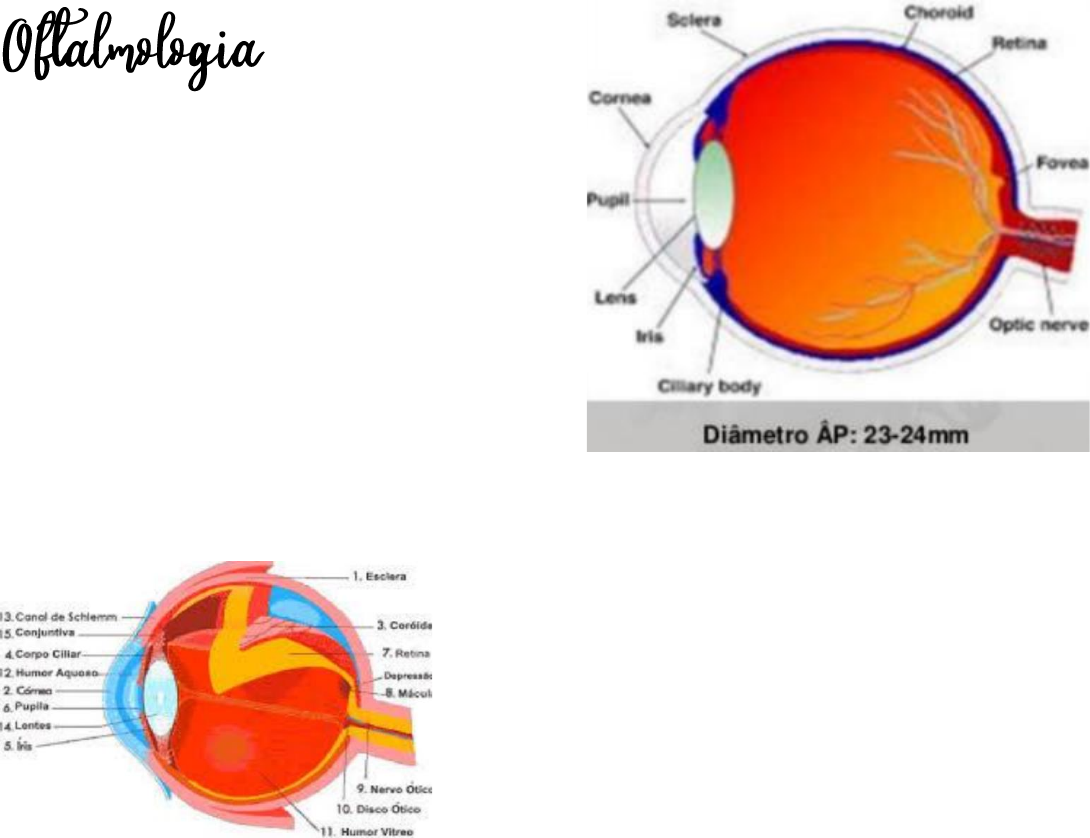 Semiologia em Oftalmologia Pamela Barbieri – T23 – FMBM Profª Dra. Daniela Felipe Revisão Anatomia do Globo Ocular: ✓ Olho, globo ocular, bulbo ocular: Apresenta 3 túnicas: interna, média, externa Apresenta 2 segmentos: anterior e posterior Túnica fibrosa (garante forma e resistência): esclera, córnea. Túnica vascular: úvea → coroide, corpo ciliar, íris Túnica interna: retina Túnica externa – fibrosa: mantém o formato de globo. Tem que ser uma estrutura mais firme. Esclera (branco do olho): tecido conjuntivo denso, pouco vascularizado, branco, opaco. Córnea: transparente, muito inervada, nutrida pelo humor aquoso, e é subdivida em 5 camadas, é avascularizada; (3 camadas celulares e 2 membranas que separam essas camadas. → Esclera: ● Constitui a membrana mais externa do olho, a membrana fibrosa ou externa. ● A esclerótica constitui os 5/6 posteriores desta membrana e tem uma superfície externa, lisa e branca, que possui as inserções tendinosas dos músculos motores do olho, e apresenta vários orifícios: posteriores, encontramos na parte mais interna do olho, o orifício do nervo óptico (que possui, anteriormente, a lâmina crivada, através da qual passam os feixes do nervo ótico e da artéria central da retina) e orifícios em redor da lâmina crivada, que rodeiam o orifício do nervo ótico e que são para as veias e artérias ciliares curtas e longas posteriores e para os nervos ciliares. ● Na zona equatorial da membrana existem 4 orifícios à mesma distância uns dos outros e que são atravessados pelas veias vorticosas. ● Em relação aos orifícios anteriores, são menores e situam-se em torno da córnea, dando passagem aos vasos ciliares anteriores. ● A esclerótica está unida à Coroide através de uma lâmina de tecido celular rica em pigmentos, a Lâmina Fusca, o que confere à superfície interna da esclerótica uma cor acastanhada. ● A esclerótica continua-se, anteriormente, com a córnea, designando-se esta região de Limbo Esclero-Corneano. → Irrigação: ●A. oftálmica (ramo da carótida interna, penetra o olho pelo canal óptico), se divide em: ●A. etmoidal anterior ●A. dorsal nasal ●A. supratrocelar ●A. supraorbital ●A. etmoidal ●A. ciliares: curta posterior, longa posterior ●A. lacrimal ●A. central da retina (irriga dentro do olho) Semiologia em Oftalmologia Pamela Barbieri – T23 – FMBM Profª Dra. Daniela Felipe ● Veias: Vorticosas, central da retina, desembocam e se dividem em oftálmicas inferior e superior, juntas, desembocam na v. oftálmica, drenando seio cavernoso e desembocam na cava. Semiologia em Oftalmologia Pamela Barbieri – T23 – FMBM Profª Dra. Daniela Felipe Inervação: A parte motora do olho, movimentação do olho é feita através dos mm. extrínsecos do olho. Essa musculatura extrínseca é inervada pelo oculomotor, pelo troclear e pelo abducente. A inervação sensitiva do olho é através do Trigêmeo. Trigêmeo se divide em oftálmico, maxilar e mandiular. O ramo oftálmico tem a maior função sensitiva. O que vai pra dentro do olho é o nervo oftálmico (em verde). Se divide em supraorbital (inerva parte superior da órbita), nervo supratroclear, nervo lacrimal (inerva glândula lacrimal), nervo infratroclear, ramo nasal externo (parte inferior da pálpebra e assoalho da órbita). Penetra pela fissura orbitária. Semiologia em Oftalmologia Pamela Barbieri – T23 – FMBM Profª Dra. Daniela Felipe Esclera: ●Irrigada pelas artérias: artérias ciliares curtas posteriores e artérias ciliares anteriores. ●Veias: anteriormente veias ciliares anteriores, e, posteriormente, veias coroideias, que acabam por confluir para as veias vorticosas. ●Linfáticos: não tem. ●Nervos: nervos ciliares (provenientes do nervo nasal). ✓ Córnea: ●A córnea é a porção anterior da túnica externa, continua posteriormente com a esclera. A região do Limbo é a parte de transição entre córnea e esclera. Essa região é por onde penetram os nervos e vasos. ●É uma estrutura convexa, avascular, transparente (varia de acordo com fibras colágeno e grau de hidratação). Precisa ser bem transparente para uma boa visão; cicatrizações (leucoma), por ex, podem atrapalhar a visão, porque quando a luz entra, não reflete bem dentro do olho, já que a córnea não estará transparente. Camadas: ●Nutrição – nutrida internamente pelo humor aquoso, externamente pelo filme lacrimal e vasos do limbo (a. oftálmica → a. ciliar longa → vasos da região do limbo). ●A inervação é pelos nervos ciliares longos e curtos (muito sensíveis ao toque). ●A função é refratar a luz e proteger contra microrganismos. ●Espessura: central 0,5 mm; periferia 0,7-1,0 mm ●Diâmetro: horizontal 11,7; vertical 10,6 mm ●Poder refracional: 43-44 dioptrias. Semiologia em Oftalmologia Pamela Barbieri – T23 – FMBM Profª Dra. Daniela Felipe Camadas da córnea: 5 3 camadas celulares e 2 membranas: ✓ Segmento anterior ●Câmara anterior: entre a córnea e a íris (transparente) ●Câmara posterior: entre a íris e face anterior do cristalino, local de produção do humor aquoso. ●LIMBO: zona de transição entre córnea e esclera. Possui muitos vasos sanguíneos (perilímbicos, em processos de inflamações corneanas, esses vasos ficam muito avermelhados – hiperemia perilímbica). Canal de Schlemm: seio venoso na esclera que atua na drenagem aquoso. ✓ Conjuntiva ●Mucosa que recobre as pálpebras internamente refletindo até o globo ocular, formando o fornix (fundo saco) indo até o limbo. ●Tem células caliciformes responsáveis por produzir mucina (filme lacrimal – líquidos produzidos pela glândula lacrimal + mucina). ●FUNÇÃO - facilita por ser superfície lisa o movimento ocular (pálpebra sobre a córnea) e tem função barreira. ●NUTRIÇÃO - artérias ciliares posteriores e anteriores. ●INERVAÇÃO - nervo oftálmico Maioria das queixas são devido in