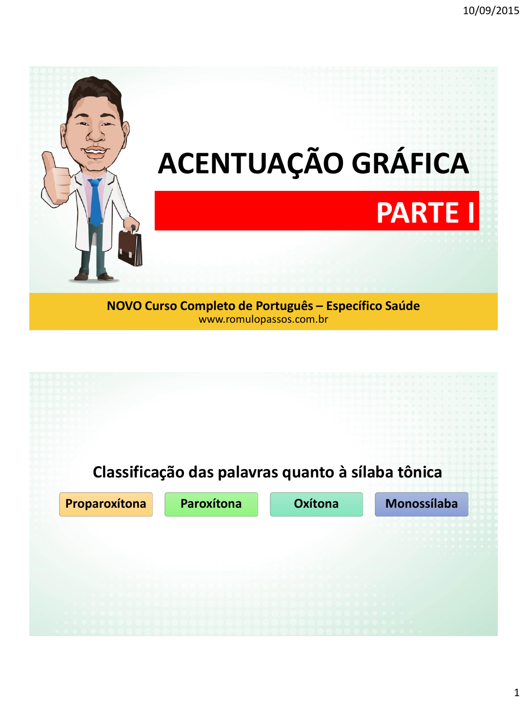 10/09/2015 1 ACENTUAÇÃO GRÁFICA PARTE I NOVO Curso Completo de Português – Específico Saúde www.romulopassos.com.br Proparoxítona Paroxítona Oxítona Monossílaba Classificação das palavras quanto à sílaba tônica Glaucio Giscard Ribeiro Coutinho - 055.032.437-22 10/09/2015 2 Proparoxítona Sílaba tônica na antepenúltima sílaba. His-té-ri-co Pró-xi-mo Rús-ti-co Paroxítona Sílaba tônica na penúltima sílaba Côn-sul Vul-ne-rá-vel Jú-ri Oxítona Sílaba tônica na última sílaba Ca-fé Pi-co-lé Vo-cê Pa-ra-béns Monossílaba Vocábulo formado por uma só sílaba Átono ou Tônico Tônicos são acentuados: nós, fé, já. Quanto à sílaba tônica Proparoxítonas Todas as proparoxítonas são acentuadas. Máquina Página Tímido Proparoxítona Matemática Público Límpido Úmido Problemática Glaucio Giscard Ribeiro Coutinho - 055.032.437-22 10/09/2015 3 (Enfermeiro, HU-UFPB-2014 |AOCP) 1. Assinale a alternativa que apresenta a palavra que segue a mesma regra de acentuação que “catastróficos”. (A) relatório. (B) advertência. (C) consequências. (D) benefícios. (E) páginas. Paroxítonas Terminadas em l, n, r, x, i(s), u(s), ps, ã(s), ão(s), um(uns), om (ons) e ditongos. Pônei Tênis Cadáver Amável Lápis Tórax Glaucio Giscard Ribeiro Coutinho - 055.032.437-22 10/09/2015 4 (Enfermeiro, HU-UFMA-2015 |AOCP) 2. Todas as palavras a seguir foram acentuadas seguindo a mesma regra gramatical, EXCETO (A) décadas. (B) eclético. (C) responsável. (D)fenômeno. (E) técnicas. ____________________ ______________ ______________ _____________ ______________ (Advogado, HU-UFJF-2015 |AOCP) 3. Assinale a alternativa correta quanto à acentuação dos pares. (A) Política – politicágem. (B) Partidário – partído. (C) Própria – propriedáde. (D) Família – familiár. (E) Único – unívoco. Quanto às regras de acentuação Glaucio Giscard Ribeiro Coutinho - 055.032.437-22 10/09/2015 5 (Enfermeiro, EBSERH Nacional - 2015|AOCP) 4. Assinale a alternativa correta quanto à acentuação dos pares. (A) Científica – ciência. (B) Impossível – impossibilidáde. (C) Romântica – românce. (D) Público – publicidáde. (E) Aparência – aparênte. Quanto às regras de acentuação Oxítonas Tônicas Oxítonas terminadas em a(s), e(s), o(s), em/ens. Parabéns Judô Sabiá Também Atrás Filé Observação: Os verbos são acentuados pelas mesmas regras. Intervém Intervêm Detém Detêm Obtém Obtêm Só não acentuamos oxítonas terminadas em “I” ou “U”, a não ser que seja um caso de hiato. Caju Mingau Jirau Canapi Gra-ja-ú Ba-ú A-í Glaucio Giscard Ribeiro Coutinho - 055.032.437-22 10/09/2015 6 (Advogado, HU-UFPEL-2015 |AOCP) 5. Assinale a alternativa cuja palavra NÃO apresenta a mesma regra de acentuação gráfica da palavra “música”. (A) Mínima. (B) Drástico. (C) Também. (D) Pública. (E) Informática. Cultivar AMIZADES VERDADEIRAS ajuda a recarregar a vida com ânimo e otimismo. Thiago Saraiva Glaucio Giscard Ribeiro Coutinho - 055.032.437-22 10/09/2015 7 ACENTUAÇÃO GRÁFICA PARTE II Professor Ciro Passos Monossílabos tônicas Monossílabos tônicos terminados em "a", "e", "o", seguidos ou não de “s”. Chá Gás Mês Nós Só Fé Pá Dó Há Cuidado! Paz Os palestinos israelenses querem a paz? Noz Você comeu a noz? Traz Você traz a cerveja. Vez Agora chegou a sua vez de passar. Glaucio Giscard Ribeiro Coutinho - 055.032.437-22 10/09/2015 8 (Téc. em Enfermagem, HC-UFTM-2014 |IADES) 6 - De acordo com a norma padrão da língua portuguesa, julgue a afirmativa seguinte: A acentuação gráfica dos vocábulos “purê” e “dá” justifica-se pela mesma regra. Quanto às regras de acentuação Purê Dá Ditongos abertos Todos os ditongos abertos ÉI(s), ÉU(s) e ÓI(s) eram acentuados. Com a revisão ortográfica, apenas os ditongos presentes na silaba tônica de uma oxítona, mantêm o acento. Céu Véu Tro-féu Car-re-téis Len-çóis Pa-péis Perderam o acento os ditongos na silaba tônica das paroxítonas Idei-a Joi-a Assemblei-a Boi-a Europei-a Glaucio Giscard Ribeiro Coutinho - 055.032.437-22 10/09/2015 9 ACENTUAÇÃO GRÁFICA PARTE III Professor Ciro Passos Hiatos i/u 1. Quando I ou U formar um hiato com a vogal anterior; 2. For tônico; 3. Estiver sozinho na sílaba ou seguido de S, não precedidos de nh. Ego-ís-ta Re-ú-ne Sa-ú-de Pre-ju-í-zo He-ro-í-na Ca-ís-te Ju-í-zo Sa-í-mos Nem todos os hiatos com i e u são acentuados Sa-in-do Ra-i-nha Mo-i-nho Ba-i-nha Fei-u-ra Ju-iz CUIDADO Po-é-ti-co Bo-ê-mio Ja-ó Glaucio Giscard Ribeiro Coutinho - 055.032.437-22 10/09/2015 10 (Téc. em Enfermagem, HUPES-UFBA-2014 |IADES) 7. De acordo com a norma padrão da língua portuguesa, julgue a afirmativa seguinte: A palavra “saúde” é acentuada por se tratar de palavra paroxítona. (Enfermeiro, HU-UFPEL-2015 |AOCP) 8. Assinale a alternativa cuja palavra NÃO recebe a mesma regra de acentuação gráfica da palavra “física”. (A) Países. (B) Prática. (C) Hábitos. (D) Periódico. (E) Crônica Quanto às regras de acentuação Glaucio Giscard Ribeiro Coutinho - 055.032.437-22 10/09/2015 11 (Enfermeiro, HU-UFSM-2014 |AOCP) 9. Assinale a alternativa correta quanto à acentuação dos pares. (A) Princípio – principiânte. (B) Urgência – urgênte. (C) Democrático – democrácia. (D) Egoísmo – egoísta. (E) Responsável – responsábilidade. Quanto às regras de acentuação (Enfermeiro, HC-UFMG-2014 |AOCP) 10. Assinale a alternativa em que a palavra acentuada NÃO apresenta a mesma regra de acentuação da palavra “farmacêutico”. (A) Formaldeído. (B) Dúvida. (C) Hipoalergênico. (D) Cosméticos. (E) Cutícula. Glaucio Giscard Ribeiro Coutinho - 055.032.437-22 10/09/2015 12 Hiatos com vogais repetidas Importante: Mudança ocorrida com a revisão ortográfica Os hiatos de vogais iguais perderam o acento Vo-o Em-jo-o Ve-em Per-do-o Le-em Cre-em Importante O trema também caiu com a revisão Qü