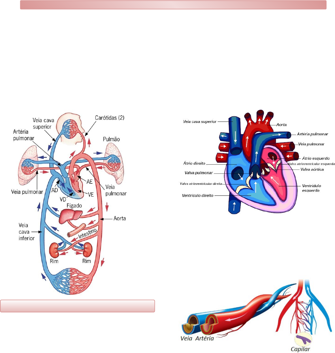 Sistema circulatório O sistema circulatório do mamífero consiste em um órgão central de impulsão, dividido em quatro compartimentos, o coração, e em um sistema de vasos para a circulação do sangue. Os vasos que levam sangue do coração para os órgãos são chamados artérias e aqueles que trazem sangue dos órgãos para o coração, veias. Outro sistema recolhe parte do fluído tissular, que constitui a linfa, e o transporta em direção às veias, são os vasos linfáticos. Estruturas ↪ Coração: é um órgão musculoso oco, em forma de cone, cuja base se prende a outras estruturas torácicas por meio das grandes artérias, e cujo ápice se encontra inteiramente livre. É constituído pelo lado direito e esquerdo. Cada uma dessas porções é formada pelo átrio e pelo ventrículo que se comunicam por uma abertura átrio-ventricular. O volume do átrio é cerca de dois terços do volume do ventrículo. Ao átrio direito chegam às veias cava cranial e caudal e a veia coronária. Do ventrículo direito sai à artéria pulmonar. Ao átrio esquerdo chegam às veias pulmonares. Do ventrículo esquerdo sai à artéria aorta. O sangue deixa o coração através de tubos fechados chamados artérias, que se ramificam repetidamente até que artérias finas (arteríolas) medindo cerca de 0,1mm de diâmetro, sejam formadas. As arteríolas levam o sangue até tubos extremamente pequenos chamados capilares. O sangue inicia seu retorno ao coração, passando através de pequenas veias chamadas vênulas, que se juntam para formar veias. As veias maiores finalmente trazem o sangue de volta ao coração. ↪ Vasos: Os vasos sanguíneos lembram as ramificações de uma árvore. As artérias se dividem em ramos menores, as arteríolas que por sua vez se dividem em ramos menores, os capilares. Estes se unem para formar as vênulas, que por sua vez formam as veias que desembocam no átrio direito do coração. ↪ Artérias: São estruturas tubulares que levam sangue do coração para os órgãos. As maiores artérias são conhecidas como artérias elásticas porque uma grande porção de sua parede se compõe de tecido elástico. As artérias menores contêm maior quantidade de músculo liso em suas paredes, o que controla o calibre dos vasos. ↪ Capilares: são tubos de diâmetro minúsculo, compostos quase que exclusivamente de endotélio. A parede do capilar atua como uma membrana semipermeável permitindo que água, oxigênio e nutrientes deixem a corrente sanguínea. ↪ Veias: os capilares se unem para formar vênulas, que por sua vez, formam veias cada vez maiores. As veias apresentam um diâmetro interno maior do que as artérias que acompanham, tendo paredes mais finas, com apenas pequena quantidade de tecido muscular. O sistema vascular linfático inicia-se pôr túbulos de fundo cego, os capilares linfáticos, que gradualmente se anastomosam em vasos de calibre cada vez maior e terminam atingindo o sistema vascular sangüíneo, desembocando em grandes veias perto do coração. A função do sistema linfático é devolver ao sangue o fluído dos espaços teciduais que, ao penetrar nos capilares linfáticos, contribui para formar a linfa. Estrutura geral dos vasos sanguíneos. Todos os vasos sangüíneos acima de certo calibre apresentam um plano geral comum de construção. De um modo geral, um vaso sangüíneo apresenta as seguintes camadas constituintes: a) Túnica íntima; b) Túnica média; c) Túnica adventícia; d) Vasa Vasorum; a) Túnica Íntima: É constituída por: 1. Uma camada de células achatadas (células endoteliais), revestindo internamente o vaso; caracterizando o epitélio simples pavimentoso, chamado de endotélio. 2. Um delicado estrato subendotelial constituído por tecido conjuntivo frouxo; 3. Lâmina elástica interna, o qual é o componente mais interno da íntima, constituída principalmente de elastina, possui aberturas (fenestras que permitem a difusão de substancias para nutrir células situadas mais profundamente na parede do vaso. Devido a contração do vaso, esta membrana geralmente se apresenta em corte, com seu trajeto ondulado e sinuoso. b) Túnica Média: Formada principalmente por camadas concêntricas de células musculares lisas helicoidalmente. Interpostas entre as células musculares lisas existem quantidades variáveis de lâminas elásticas, fibras reticulares (colágeno tipo III), proteoglicanas e glicoproteínas. As células musculares lisas são as responsáveis pela produção destas moléculas da matriz extracelular. Em artérias, a túnica média possui uma lâmina elástica externa mais delgada que separa esta da túnica adventícia. c) Túnica Adventícia: Constituída por tecido conjuntivo frouxo. A camada adventícia torna-se gradualmente contínua com o tecido conjuntivo do órgão pelo qual o vaso sanguíneo está passando. d) Vasa Vasorum: Vasos grandes normalmente possuem “vasa vasorum” que são arteríolas, capilares, e vênulas que se ramificam profusamente na adventícia e na porção externa da média. Os “vasa vasorum” provê a adventícia e a média de metabólitos, uma vez que em vasos maiores as camadas são muito espessas para serem nutridas somente por difusão a partir do sangue na luz. “Vasa vasorum” são mais frequentes em veias que em artérias. Em artérias de diâmetro intermediário e grande, a íntima e a região mais interna da média são destituídas de vasa vasorum. Estas camadas recebem oxigênio e nutrição por difusão do sangue que circula na luz do vaso.