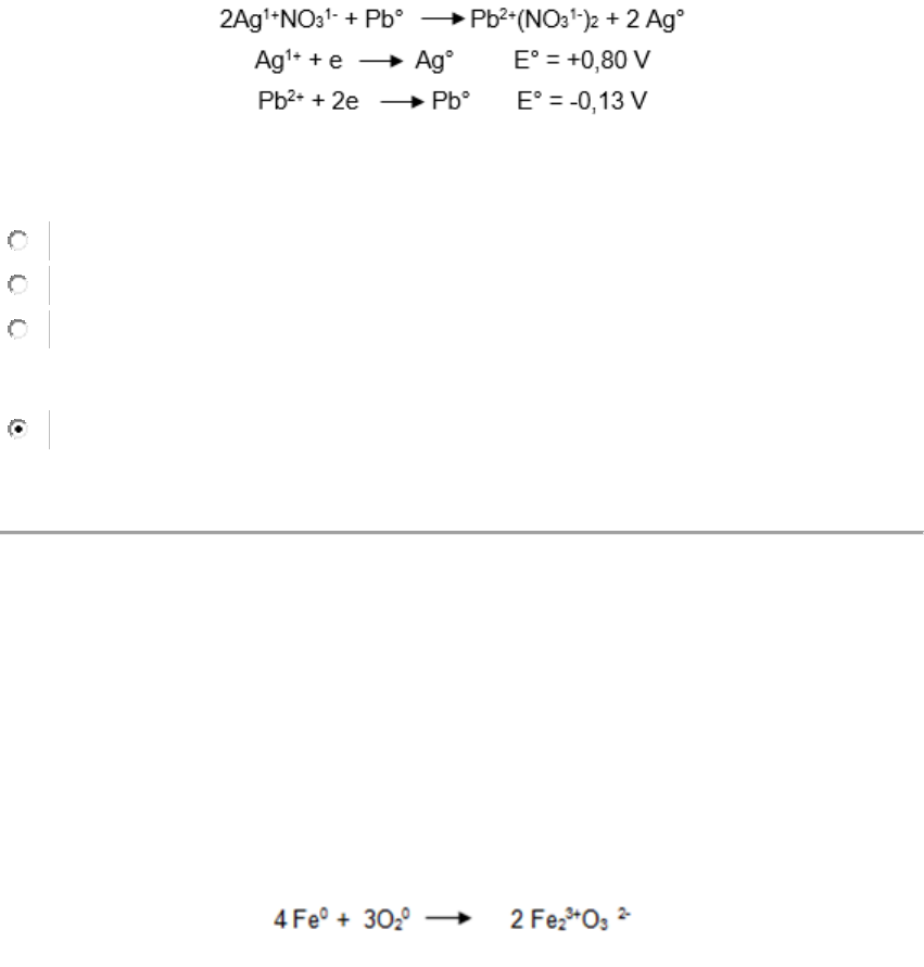 1. Curso: BACHARELADO EM ENGENHARIA CIVIL - DISTÂNCIA Química Geral Nota: 100 Disciplina(s): Química Geral Questão 1/10 - Química Geral Determinar o potencial padrão de uma célula eletroquímica contendo Chumbo metálico imerso em uma solução de Nitrato de Prata, tendo como dados a reação de oxirredução e os potenciais padrão das semi-reações de redução abaixo: Nota: 10.0 A E° = + 0,80 V B E° = - 0,13 V C E° = - 1,06 V D E° = + 0,93 V Você acertou! ALTERNATIVA CORRETA (Conforme Aula 5, Tema 3, Item 3.2) Questão 2/10 - Química Geral A reação de oxirredução, também conhecida como reação redox, é na verdade uma interação entre duas reações concomitantes e dependentes uma da outra, que são a reação de oxidação e a reação de redução. A reação de oxidação é aquela na qual um elemento perde elétrons, adquirindo carga positiva se transformando em um cátion. A reação de redução é aquela na qual um elemento recebe elétrons, adquirindo carga negativa e se transformando em um ânion. Um elemento só oxida por que há outro elemento reduzindo e só reduz porque há outro elemento oxidando. Portanto, na reação de oxirredução envolvendo a produção de ferrugem abaixo: Nota: 10.0 A O Ferro reduz e é agente oxidante do Oxigênio. B O Ferro oxida e é agente redutor do Oxigênio. Você acertou! ALTERNATIVA CORRETA (Conforme Aula 5, Tema 1, Item 1.2.1) C O Ferro reduz e é agente redutor do Oxigênio. D O Ferro oxida e é agente oxidante do Oxigênio. Questão 3/10 - Química Geral O conceito do número de oxidação, de forma abreviada nox, foi desenvolvido para que se possa identificar facilmente a quantidade de elétrons perdidos pelo elemento que oxida ou a quantidade de elétrons recebidos pelo elemento que reduz em uma reação de oxirredução. Pode ser definido como a carga que um elemento adquire em uma reação de oxirredução, podendo ser uma carga real quando o elemento participante da reação for monoatômico, ou hipotética quando este elemento estiver presente em uma molécula de substância ou material. Assim, Para a molécula de Ácido Fosfórico, qual será o NOX do Fósforo (P)? Nota: 10.0 A -1 B +1 C -4 D +5 Você acertou! ALTERNATIVA CORRETA (Conforme Aula 5, Tema 1, Item 1.2.2) Questão 4/10 - Química Geral Resolvendo a equação química da reação do sulfato de prata com Cobre, gerando sulfato de cobre mais prata, representada abaixo: Pelo método íon-elétron, teremos como reações intermediárias e resultado final: Nota: 10.0 A B C Você acertou! ALTERNATIVA CORRETA (Conforme Aula 4, Tema 2, Item 2.2.1.2) D Questão 5/10 - Química Geral O conceito do número de oxidação, de forma abreviada nox, foi desenvolvido para que se possa identificar facilmente a quantidade de elétrons perdidos pelo elemento que oxida ou a quantidade de elétrons recebidos pelo elemento que reduz em uma reação de oxirredução. Pode ser definido como a carga que um elemento adquire em uma reação de oxirredução, podendo ser uma carga real quando o elemento participante da reação for monoatômico, ou hipotética quando este elemento estiver presente em uma molécula de substância ou material. Assim, Para a molécula de Sulfito de Sódio, qual será o nox do Enxofre (S)? Nota: 10.0 A +1 B +4 Você acertou! ALTERNATIVA CORRETA (Conforme Aula 5, Tema 1, Item 1.2.2) C -1 D -4 Questão 6/10 - Química Geral Na reação de oxirredução, na qual o Ferro (Fe) reage com o Oxigênio (O) presente no ar, tendo a ferrugem sendo gerada conforme a reação: Nota: 10.0 A O Ferro reduziu, tendo perdido três elétrons e virando cátion e o oxigênio oxidou, tendo recebido dois elétrons e virando ânion. B O Ferro oxidou, tendo perdido três elétrons e virando cátion e o oxigênio reduziu, tendo recebido dois elétrons e virando ânion. Você acertou! ALTERNATIVA CORRETA (Conforme Aula 5, Tema 1, Item 1.2.1) C O Ferro oxidou, tendo perdido três elétrons e virando ânion e o oxigênio reduziu, tendo recebido dois elétrons e virando cátion. D O Ferro reduziu, tendo perdido três elétrons e virando ânion e o oxigênio oxidou, tendo recebido dois elétrons e virando cátion. Questão 7/10 - Química Geral Eletroquímica é o estudo da relação entre a eletricidade e a química. Assim, é uma área de estudos da química que engloba conceitos de física e de química integrados (físico- química) no estudo de reações químicas de transferência de elétrons para gerar energia elétrica, ou a aplicação da energia elétrica para gerar ou inibir reações químicas de transferência de elétrons. Como são chamadas estas reações? Nota: 10.0 A Reações de adição. B Reações de condensação. C Reações de combustão. D Reações de oxirredução. Você acertou! ALTERNATIVA CORRETA (Conforme Aula 5, Tema 1, Item 1.2.1) Questão 8/10 - Química Geral Coeficientes estequiométricos representam as quantidades de matéria dos reagentes e dos produtos gerados, em uma equação química, dada em mol. São obtidos quando são determinadas as quantidades de reagentes em uma reação química que resultarão em quantidades de produtos. Portanto, fornece uma relação de proporcionalidade entre reagentes e produtos para uma reação. Isto posto, na reação representada abaixo, quais são os coeficientes estequiométricos? Nota: 10.0 A A, B, C e D B a, b, c, e d C N1, N2, N3 e N4 Você acertou! ALTERNATIVA CORRETA (Conforme Aula 4, Tema 1, Item 1.2.1.4) D N1 Aa +N2 Bb Questão 9/10 - Química Geral Um dos problemas enfrentados hoje é o aquecimento global provocado pelo excesso de emissão de gases como o CO2. Analisando estequiometricamente, uma vez que a massa molar de 1 mol do gás carbônico (CO2) é de 44g/mol, qual será a massa de 120 mol deste gás? Nota: 10.0 A 5280 g Você acertou! ALTERNATIVA CORRETA (Conforme Aula 4, Tema 1, Item 1.2.1.1) m = M.n = 44 . 120 = 5280 g B 2,73 g C 0,37 g D 164 g Questão 10/10 - Química Geral O conc