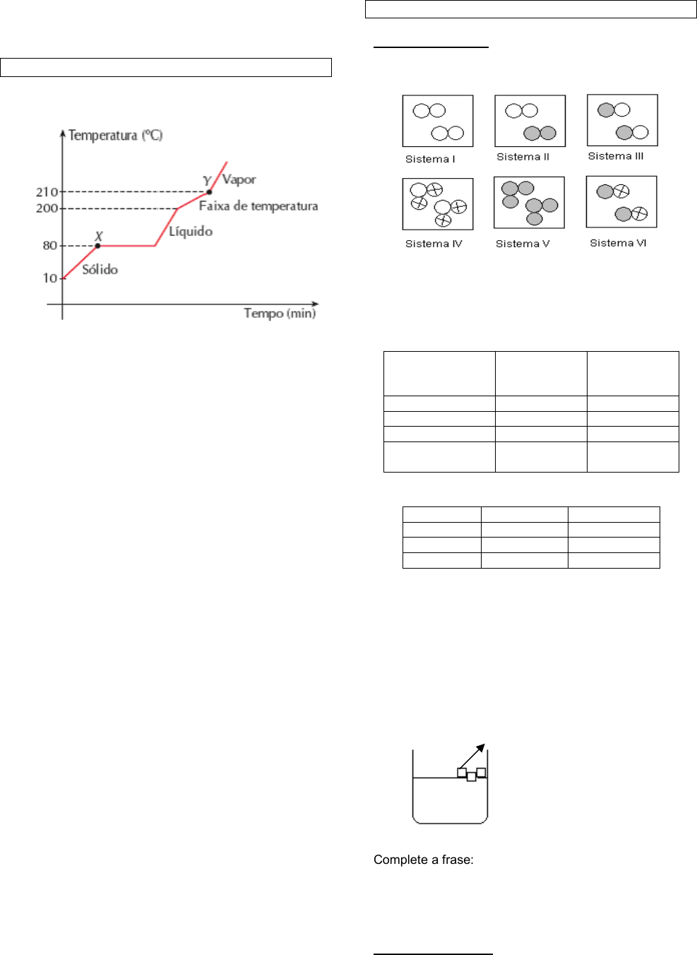 1 UNIVESIDADE PAULISTA – UNIP ANÁLISE FÍSICO-QUÍMICA Profa. Mari Muler QUESTÕES SISTEMA ONLINE 1. Considere o diagrama de aquecimento de um material abaixo representado Assinale a alternativa correta: a) O diagrama representa o aquecimento de uma substância pura. b) A temperatura no tempo zero representa o aquecimento de um líquido. c) 210°C é a temperatura de fusão do material. d) A transformação de X para Y é um fenômeno químico. e) 80°C é a temperatura de fusão do material. 2. O ponto de fusão do cobre é igual a 1083ºC e o ponto de ebulição é de 2310ºC. Assinale a alternativa que indica corretamente o estado físico do cobre em 20ºC, 100ºC, 1000ºC e 2500ºC, respectivamente: a) sólido, sólido, líquido, gasoso. b) sólido, sólido, sólido, sólido. c) sólido, sólido, sólido, gasoso. d) sólido, sólido, sólido, líquido. e) sólido, líquido, líquido, gasoso. 3. (UFSM) Quando se está ao nível do mar, observa-se que a água ferve a uma temperatura de 100 °C. Subindo uma montanha de 1 000 m de altitude, observa-se que: a) a água ferve numa temperatura maior, pois seu calor específico aumenta. b) a água ferve numa temperatura maior, pois a pressão atmosférica é maior. c) a água ferve numa temperatura menor, pois a pressão atmosférica é menor. d) a água ferve na mesma temperatura de 100 °C, independente da pressão atmosférica. e) a água não consegue ferver nessa altitude. Estados de Agregação da Matéria Exercícios em Sala 1) Nos esquemas abaixo, cada tipo de esfera corresponde a um tipo de átomo. Classifique cada sistema de acordo com o código. S = Substância simples C = Substância composta M = mistura 2) Complete o quadro: Sistema Número de componentes Número de elementos químicos H2O2 H2 + O2 Ar (N2 + O2) Latão (Cu + Zn) 3) Observe a tabela, válida para P=1 atm Substância TF(°C) TE(°C) X -200 -90 Y -30 +45 Z +75 +320 Indique o estado físico de cada substância em condição ambiente (25°C, 1 atm) 4) Faça o esboço de um diagrama (temperatura X tempo) para o aquecimento da água, de -5°C até 120°C (P=1atm). 5) A figura abaixo representa um frasco fechado contendo apenas água. Complete a frase: “O sistema no interior do frasco apresenta_____ componente(s) _____ fase(s). Portanto é um sistema _____________. (homogêneo; heterogêneo) Exercícios em Casa As questões de 1 a 3 são referentes aos seguintes sistemas: a) água +gelo b) água + 3 cubos de gelo H2O (g) H2O (s) H2O (l) s = estado sólido l = estado líquido g = estado gasoso 2 c) açúcar + sal d) areia + enxofre + sal e) granito f) água + gasolina g) água do mar filtrada h) ar filtrado i) ar e poeira j) água + açúcar + sal(dissolvidos) l) água destilada 1) Quais dos sistemas são homogêneos? 2) Qual o número de fases de cada sistema? 3) Qual o número de componentes dos sistemas (a), (b), (e), (j), e (k)? 4) (FGV-SP) Na lista: 1. Gasolina 2. Manteiga 3. Hidróxido de cálcio 4. Nitrogênio São substâncias puras apenas: a) 1, 2 e 4 b) 2, 3 e 4 c) 3 e 4 d) 1, 2, 3 e 4 e) 2 e 4 5) (UFSC) O gás carbônico (CO2) é um(a) 01)substância simples 02)mistura homogênea 04)elemento químico 08)composto binário 16)mistura heterogênea 32)variedade alotrópica do carbono Dê como resposta a soma dos números associados às afirmações corretas. 6) (UEL/2000) Uma diferença que se observa, sob mesmas condições, entre água potável e água destilada está na I.condutibilidade elétrica II.densidade III. temperatura de ebulição Dessas afirmações, a) somente I é correta b) somente II é correta c) somente III é correta d) I e II são corretas e) I, II e III são corretas 7) Considere a tabela a seguir: Substância Ponto de fusão (1 atm) Ponto de ebulição (1atm) A -180°C -45°C B -35°C 30°C C 10°C 120°C D -60°C 15°C E 70°C 320°C Qual o estado físico de cada substância: a) nas condições ambientais (25°C, 1 atm)? b) num dia frio, cuja temperatura é de 5°C? c) num dia quente, cuja temperatura é de 35°C? 8) (UEL/2004) Propriedades físicas como densidade, ponto de fusão e ponto de ebulição são importantes para identificar e diferenciar quando um sistema é composto por uma substância pura ou por uma mistura. Analise os gráficos, a seguir, que representam mudanças de estado físico. Em relação às mudanças de estado físico, é correto afirmar: a) O segmento T1 T1’no gráfico B caracteriza uma substância pura. b) O gráfico A representa a mudança de estado físico de uma mistura eutética. c) O gráfico B representa a mudança de estado físico de uma mistura azeotrópica. d) O gráfico A representa a mudança de estado físico de uma mistura trifásica. e) O gráfico B representa a mudança de estado físico de uma mistura que apresenta ponto de ebulição não definido. 9) (UNESP/2008) Uma amostra de água do rio Tietê, que apresentava partículas em suspensão, foi submetida a processos de purificação obtendo-se, ao final do tratamento, uma solução límpida e cristalina. Em relação às amostras de água antes e após o tratamento, podemos afirmar que correspondem, respectivamente, a: a) substâncias composta e simples. b) substâncias simples e composta. c) misturas homogênea e heterogênea. d) misturas heterogênea e homogênea. e) mistura heterogênea e substância simples. Separação de Misturas Exercícios em Sala 1) Escreva o nome de cada aparelho de laboratório. 2) Uma mistura gasosa das substâncias A(tE = -10°C), B(tE = -20°C) e C (tE = -30°C), sofre liquefação total, originando uma solução líquida. A seguir, realizou-se uma destilação fracionada. Qual a ordem de saída das substâncias no condensador? 3) Faça a associação de 1, 2, 3, 4, 5 com a, b, c, d, e. 3 1. Separação de (ouro + areia) das areias auríferas pela água. A água arrasta a areia (mais leve). 2. Separação de (serragem + enxofre) pela água. A serragem flutua, e o enxofre precipita. 3. Separação de (salitre 