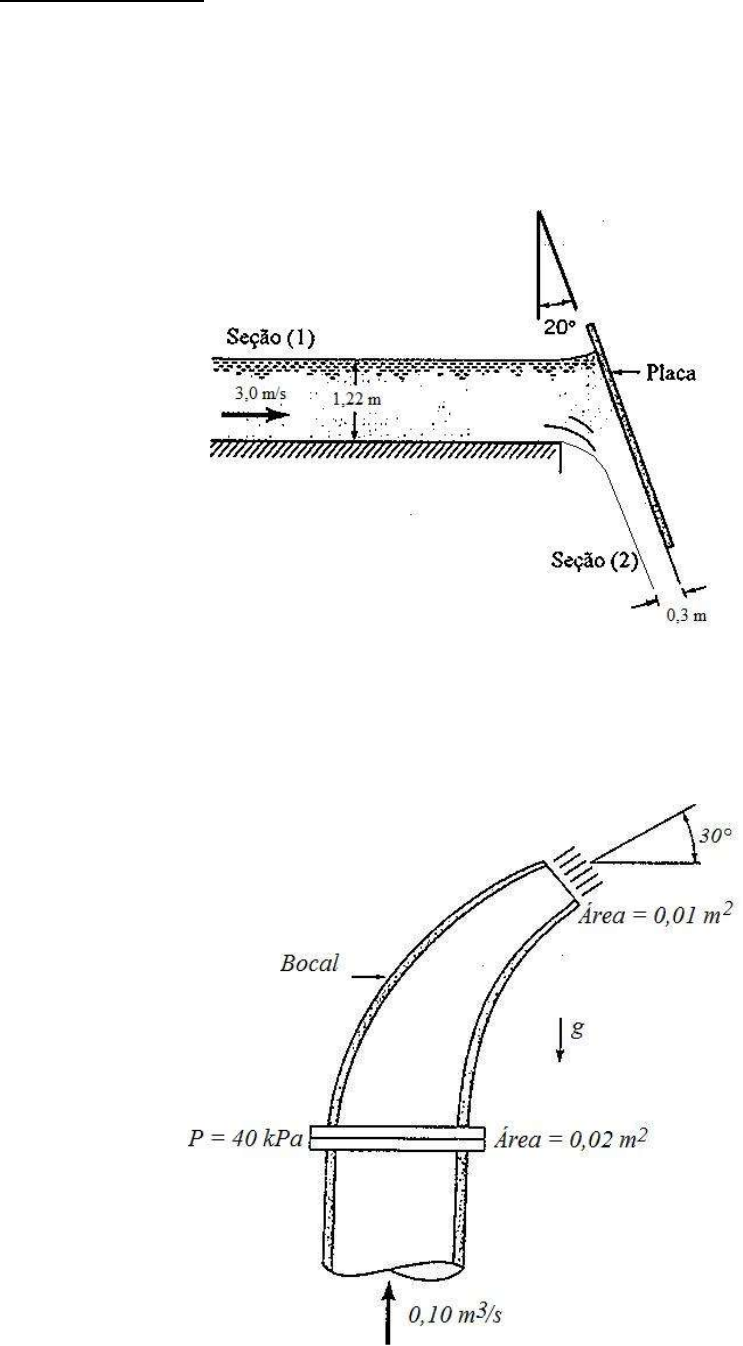 6ª Lista de exercício 1. A Figura abaixo mostra o escoamento de água num canal aberto que é defletido por uma placa inclinada. Qual é a força horizontal exercida pelo fluido sobre a placa se a velocidade na seção (1) for igual a 3 m/s? A distribuição de pressão na seção (1) é hidrostática e o fluido se comporta como um jato livre na seção (2). Despreze o atrito no fundo do canal e considere uma largura unitária. 2. O bocal curvo mostrado na Figura abaixo está instalado num tubo vertical e descarrega água na atmosfera. Quando a vazão é igual a 0,1 m 3 /s a pressão relativa na flange é 40 kPa. Determine a componente vertical da força necessária para imobilizar o bocal. O peso do bocal é 200 N e o seu volume interno é 0,012 m 3 . O sentido da força vertical é para cima ou para baixo? Dados: ρágua = 998 kg/m 3 , g = 9,8 m/s 2 . 3. Um jato livre de álcool atinge uma placa vertical conforme figura abaixo. Uma força F = 425 N é requerida para manter a placa estacionária. Assuma que não existem perdas devido ao impacto e calcule a vazão em massa de álcool. Dados: ρágua = 998 kg/m 3 , dálcool = 0,79. 4. Água escoa através de uma seção de tubo em U conectada a tubulação por meio de flanges, como mostra a figura abaixo. No flange (1), a pressão absoluta é de 200 kPa e a água escoa a uma vazão de 30 kg/s para dentro do tubo. No flange (2), a pressão absoluta é de 150 kPa. Em (3), 8 kg/s de água são descarregados para a atmosfera, que encontra-se a 100 kPa. Determine as forças (horizontal e vertical) que atuam sob os flanges. Despreze o peso da seção de tubo em U. Dados: água = 998 kg/m 3 , g = 9,8 m/s 2 . 5. O cotovelo mostrado na Figura abaixo descarrega água na atmosfera. A componente na direção x necessária para imobilizar o cotovelo, FAx, vale 6405 N quando o manômetro indica uma pressão relativa de 69 KPa. Determine, nestas condições, a vazão em volume no cotovelo e a componente na direção y da força necessária para imobilizar o cotovelo. Desconsidere os efeitos viscosos e gravitacionais no escoamento em questão. Dados: ρágua = 998 kg/m 3 ; g = 9,8 m/s 2 . 6. Água a 20 ºC flui em regime permanente através de uma curva redutora de 180 º, conforme apresentado na figura abaixo. Sabendo que p1 = 350 kPa (absoluta), D1 = 25 cm, V1 = 2,2 m/s, p2 = 120 kpa (absoluta) e D2 = 8cm e negligenciando o peso da curva e da água, estime a força que deve atuar nas flanges para manter a curva imóvel. Dados: ρágua = 998 kg/m 3 , g = 9,8 m/s 2 ; patm = 101 kPa. 7. Água flui através de uma torneira parcialmente aberta a uma vazão de 0,0412 ft 3 /s conforme figura abaixo. O diâmetro do tubo na entrada e saída da torneira é de 0,78 in (0,065 ft). A torneira é fixada a tubulação por um sistema de flange sendo a pressão na sua entrada (flange) de 13 lbf/in 2 . O peso total do conjunto torneira + água (que encontra-se no interior da torneira) é de 12,8 lbf. Calcule a força exercida pelo escoamento sobre a torneira. Dados: ρágua = 1,95 slug/ft 3 ; 1slug = 1 lbf.s 2 /ft; 1 ft = 12 in. 8. Um cotovelo redutor é usado para defletir de 30º o escoamento de água a uma taxa de 14 kg/s em um tubo horizontal (ver figura abaixo). O cotovelo descarrega água na atmosfera. A área da seção transversal do cotovelo é de 113 cm 2 na entrada e 7 cm 2 na saída. O peso do cotovelo e da água que há nele pode ser assumido desprezível. Determine a força necessária para manter o cotovelo no lugar (Fx e Fy). Dados: ρágua = 998 kg/m 3 , g = 9,8 m/s 2 . Considere que a pressão estática na seção 1 é de 201,77 kPa (relativa). Respostas: 1. F = 3012 N 2. 3. 4. FH = 1110 N e FV = 90,7 N 5. Q = 0,2 m3/s Fy = 3037 N 6. F = 14,87 N 7. Fx = 7,21 lbf Fy = 11,8 lbf 8. FH = 2055 N e FV = 140 N
