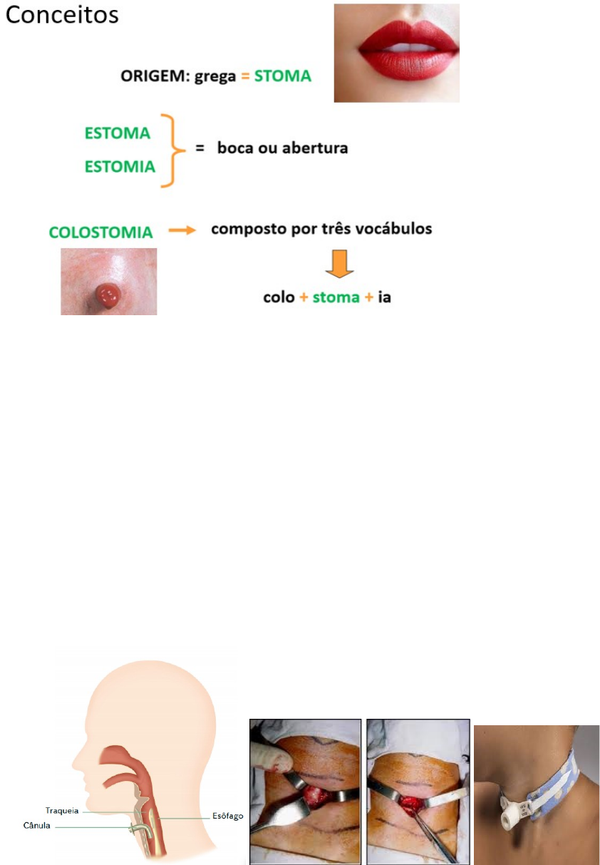 Aula 05- P4 Estomias · São orifícios abertos intencionalmente, através de intervenção cirúrgica; · Comunicam órgãos ocos à superfície corporal dos pacientes; · Favorece a administração de oxigênio, de alimentos e drenagem de efluentes; · Podem ser temporárias ou definitivas. Traqueostomia · Procedimento cirúrgico que consiste em uma abertura realizada na traqueia, com inserção de uma cânula (tubo), que permitirá a passagem do ar. · A traqueia é um tubo vertical cilíndrico, cartilaginoso e membranoso, localizado entre a laringe e os brônquios, fortalecido por anéis de cartilagem, que levam o ar inspirado até os pulmões. · O tubo de traqueostomia é colocado entre a segunda e terceira cartilagem traqueal Procedimento médico e pode ser necessária nos seguintes casos: • Em alguns tipos de cirurgias de cabeça e pescoço; • Em alguns pacientes com dificuldades para espirar (situação de emergência); • Em pacientes que necessitam de ventilação mecânica por tempo prolongado. LIMPEZA DE CÂNULA INTERNA (INTERMEDIÁRIO) As secreções acumuladas dentro da cânula interna precisam ser retiradas através de limpeza frequente (4 vezes ao dia), pois podem formar rolhas ou tampões endurecidos que impedem ou dificultam a passagem do ar pelo tubo • A limpeza deve ser feita, se possível, antes da alimentação (para não ocorrer acessos de tosse durante a retirada e colocação da cânula interna); • Lavar mãos antes e depois de realizar os cuidados com a traqueostomia para evitar infecções; • Usar luvas de procedimentos; • O paciente deve estar confortável, na posição sentada ou com a cabeceira da cama bem elevada durante a limpeza; • Retire a cânula interna: Algumas cânulas possuem um conector com uma trava giratória, sendo necessário girá-lo para desencaixá-lo da cânula externa; - Realize a limpeza com água corrente, usando sabão líquido ou degermante e uma pinça e gaze para retirar toda a secreção acumulada, tanto por dentro como por fora; • Enxague bem; • Não utilize produtos à base de cloro na cânula metálica (hipoclorito de sódio) pois podem danificá-la; • Seque a cânula interna com gaze; • Recoloque-a na cânula externa e gire o conector até travar (caso possua trava giratória). TROCA DO CURATIVO Finalidade: · Para prevenir danos à pele e infecções. • Lave bem as mãos; • Se o paciente estiver se alimentando por sonda, deve suspender a dieta por 1h; • O paciente deve estar confortável, na posição sentada ou com a cabeceira da cama elevada (70°); - Usar luvas de procedimentos; abrir material de curativo (conforme descrito na aula de Feridas); • Higienize a pele próxima à abertura da traqueostomia, atrás e ao redor da placa de fixação, usando gaze umedecida em SF 0,9%, sem deixar que ela escorra para dentro do estoma, retirando toda a sujidade; • Limpe da mesma maneira a placa de fixação, com cuidado para não deslocar a cânula. - Seque bem toda a pele, atrás e ao redor da placa, com gaze; • Para proteger a pele, coloque um curativo para traqueostomia* ou compressas de gaze dobradas, embaixo da placa de fixação. OBS.: Nunca corte as compressas de gaze para fazer o curativo, pois os pequenos fios que se soltam podem entrar na traqueia e pulmões, causando tosse e irritações; • Não utilize tecidos que possam soltar bolinhas ou fiapos próximos à traqueostomia; • Não utilize substâncias em spray ou em pó perto da traqueostomia; • É importante realizar a higiene da boca, mantendo-a sempre limpa. Estomas urinários As urostomias podem ser: · Ureterostomia (a partir do ureter); · Pielostomia (a partir da pelve); · Cistostomia A partir da bexiga). São aberturas cirúrgicas realizadas para construção de um novo trajeto urinário localizado no abdômen para saída de urina. A urina sai continuamente, ou seja, sem interrupção. Dispositivos coletores Esofagostomia · Desviar as secreções salivares impedindo a aspiração; · Local difícil de adaptar equipamento coletor; · Bastante umidade; · Sujeito à infecção fúngica. Gastrostomia · Descomprimir e alimentar · Doenças neurológicas · Incapacidade de alimentar · Atresia ou estonose de esôfago · Risco de aspiração Jejunostomia · Para alimentação quando não é possível que essa seja feita pela boca ou por uma gastrostomia; Cuidados com a gastrostomia e jejunostomia · Higienizar as mãos antes e depois da manipulação; · Higienizar a área periestoma de 02 a 03 vezes ao dia ou quando houver necessidade; · Manter seca a área ao redor do estoma; · Trocar a gaze que protege a pele do estoma; · Não utilizar óleos ao redor do orifício, pois pode facilitar a saída do dispositivo; · Manter cabeceira elevada sempre no momento que estiver administrando alimentação, água ou medicação, para não provocar enjoos e vômitos; · Após o término da administração, deixar o paciente com decubito elevado por aproximadamente 40 minutos; · Se houver programação de exames nos quais seja necessário abaixar o decúbito do paciente a infusão dieta deve ser interrompida 1h antes; · O mesmo deve ser feito antes do banho no leito. · Em caso de enjoos e vômitos suspender a administração da dieta; · Após a administração de alimentação e medicação realizar uma lavagem com 20 ml de água em jato utilizando a seringa; · Se houver vários medicamentos a serem administrados através da gastro ou da jejuno, é necessário realizar um flush de 20ml de água entre cada administração; · Em caso de dificuldade na passagem da alimentação ou medicação, utilizar água em jato com o auxílio de uma seringa; · Observar presença de Granuloma no orifício (Granuloma é uma inflamação do tecido no nosso organismo); · Em caso de escape do dispositivo de Gastrostomia do orifício, realizar higiene com água fria, manter o paciente deitado de barriga para cima e avisar o médico responsável; Exe