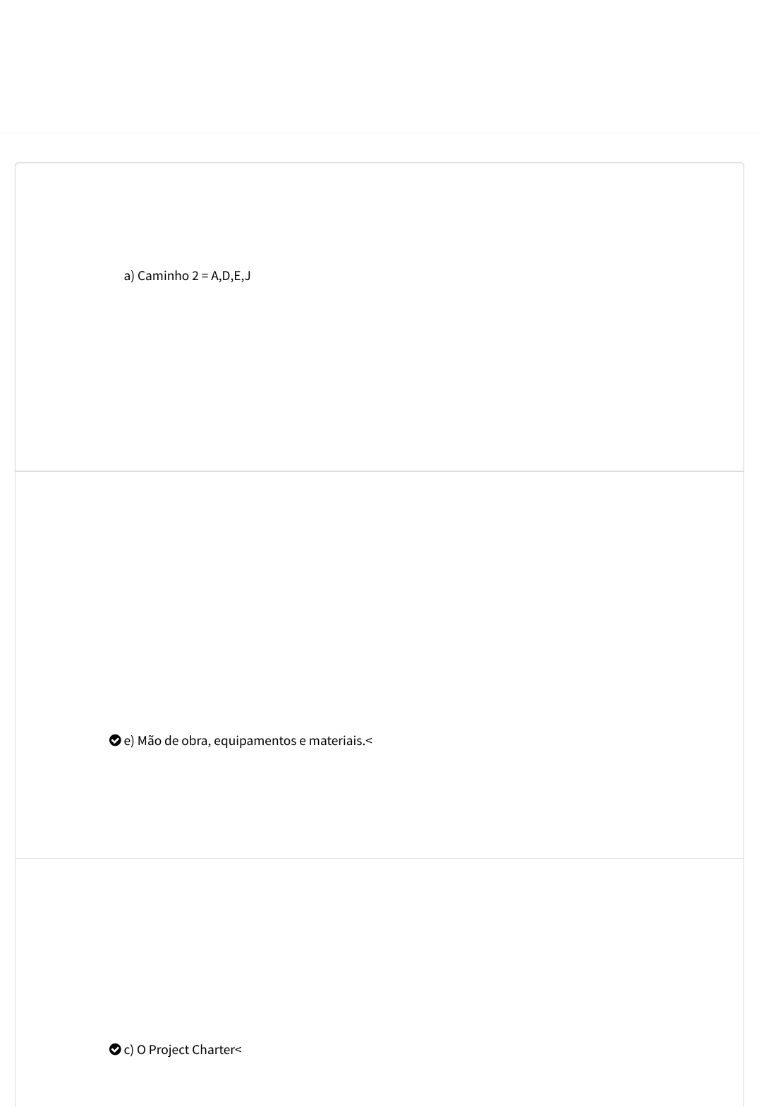 Local: Newton - Virtual / Newton - Carlos Luz 220 - Jucelino Kubistchek / Newton - Carlos Luz 220 / Newton - Filial Carlos Luz 220 Acadêmico: npG.FEV.GPROJ.1 Aluno: Danielli Priscila da Silva Melo Avaliação: AV2 - Online Matrícula: 4046854 Data: 16 de Maio de 2020 - 14:30 Finalizado 1 Código: 9665 - Enunciado: Considerando o CPM – Método do Caminho Crítico, analise a imagem da rede PERT e visualize os possíveis caminhos. Verificando a duração das atividades de cada um deles, você encontrará um caminho provável, um caminho otimista e o caminho crítico. Na sequência, marque a alternativa CORRETA para o trajeto que revela o caminho crítico. a) Caminho 2 = A,D,E,J b) Caminho 4 = A,C,I,L c) Caminho 3 = A,C,H,K d) Caminho 5 = A,C,G,J e) Caminho 1 = A,B,F,K Alternativa marcada: a) Caminho 2 = A,D,E,J --/-- 2 Código: 7881 - Enunciado: Quando abordamos o tema: Controle integrado de cronograma e custos, temos um sistema integrado de cronograma e custo baseado em cinco etapas, que acontecem em momentos específicos do ciclo de gerenciamento do projeto. Uma das principais razões para controle são as estimativas de fluxo de caixa. Portanto, os custos são colocados cronologicamente na linha de base, o que permite saber quando serão necessárias as alocações de recursos financeiros no projeto e em que volume elas serão necessárias. Normalmente esses custos são divididos dentro do cronograma em três grandes grupos. Deste modo, quais são os grupos classificados com custos diretos e de controle pelo Gerente de Projetos. a) Mão de obra, instalações e suprimentos.< b) Equipamentos, fornecedores e tributos.< c) Tributos, mão de obra e instalações.< d) Suprimentos, recursos financeiros e instalações.< e) Mão de obra, equipamentos e materiais.< Alternativa marcada: e) Mão de obra, equipamentos e materiais.< --/-- 3 Código: 1314 - Enunciado: A primeira fase do projeto de transferência de tecnologia militar em um país do norte da África que você está gerenciando está se encerrando, quando um secretário do Ministério de Defesa lhe requisita uma mudança na próxima fase do projeto, uma vez que as condições mudaram. Sua avaliação da mudança mostra que esta vai alterar completamente os principais objetivos do projeto. Se for tomada a decisão de aceitar essa mudança, qual documento deve ser alterado primeiro?< a) O Plano mestre do Projeto< b) O plano de gerenciamento do projeto< c) O Project Charter< d) A declaração do escopo do Projeto< e) O termo preliminar do escopo< --/-- F71339B Highlight F71339B Highlight F71339B Highlight Alternativa marcada: c) O Project Charter< 4 Código: 9607 - Enunciado: Quando discutimos sobre Indicadores de Desempenho nos projetos, é imperativo pensar no processo de controle. De modo geral, na visão de Larson e Gray (2016) um processo de controle de projetos envolve quatro grandes etapas. A saber: Estabelecer uma linha de base, que reflete a posição inicial do ambiente que cerca o projeto. Esses dados são retirados das informações de custo e tempo constantes na EAP (Estrutura Analítica do Projeto) e nos documentos de programação dos pacotes de trabalho. Medir o desempenho e o progresso do projeto, coletando informações quantitativas (tempo e custo, captados por sistemas de informação) e qualitativas (atendimento de especificações e funções de produto, obtidas por inspeção ou por testes). Comparar o realizado com o planejado, em intervalos que sejam frequentes o suficiente para permitir modificações em tempo hábil, e espaçados o suficiente para que os resultados das mudanças possam surtir efeito. Adotar medidas, quando o andamento do projeto estiver diferente do planejado originalmente. Há situações em que o escopo pode sofrer alterações, o que vai demandar ajustes na linha de base, para reconhecer o novo cenário. De acordo com as etapas descritas, qual (is) está (ão) CORRETA (s): a) I e III b) I, II, III e IV c) II e IV d) I e II e) II, III e IV Alternativa marcada: b) I, II, III e IV --/-- 5 Código: 10185 - Enunciado: De forma geral, a comunicação é um dos principais fatores de maior demanda de esforços, podendo ocupar até 90% do tempo do gerente de projeto em comunicação interpessoal interna com os integrantes das suas equipes. Em organizações cujo foco está estabelecido em projetos, o gerente de projeto consome seu maior tempo em comunicação: a) Externa com fornecedores e áreas de afinidade b) Externa com os fornecedores de soluções e interna com os clientes c) Interna com os stakeholders e externa com os shareholders d) Externa com clientes e departamentos governamentais e) Interna com clientes e departamentos governamentais Alternativa marcada: d) Externa com clientes e departamentos governamentais --/-- 6 Código: 16107 - Enunciado: As áreas de gerenciamento de projetos o descrevem em termos de seus processos componentes (VARGAS, 2009). Sobre os conceitos das áreas de gerenciamento de projetos, enumere a segunda coluna de acordo com a primeira.COLUNA I I - Gerenciamento de Escopo. II - Gerenciamento de Riscos. III - Gerenciamento de Custos. IV - Gerenciamento da Integração. --/-- F71339B Highlight F71339B Highlight V - Gerenciamento de Qualidade.COLUNA II ( ) Área que visa planejar, identificar, qualificar, quantificar, responder e monitorar os riscos do projeto. ( ) Área que engloba os processos requeridos para assegurar que um projeto seja concluído de acordo com seu orçamento previsto. ( ) Área que engloba os processos requeridos para assegurar que todos os elementos do projeto sejam adequadamente coordenados e integrados. ( ) Área que engloba os processos requeridos para assegurar que os produtos ou serviços do projeto estarão em conformidade com o solicitado pelo cliente ou contratante. ( ) Área que engloba os processos necessários para assegurar que, no projeto, esteja incluído todo o trabalho requerido para concluí-lo de maneira bem sucedida.A sequênc