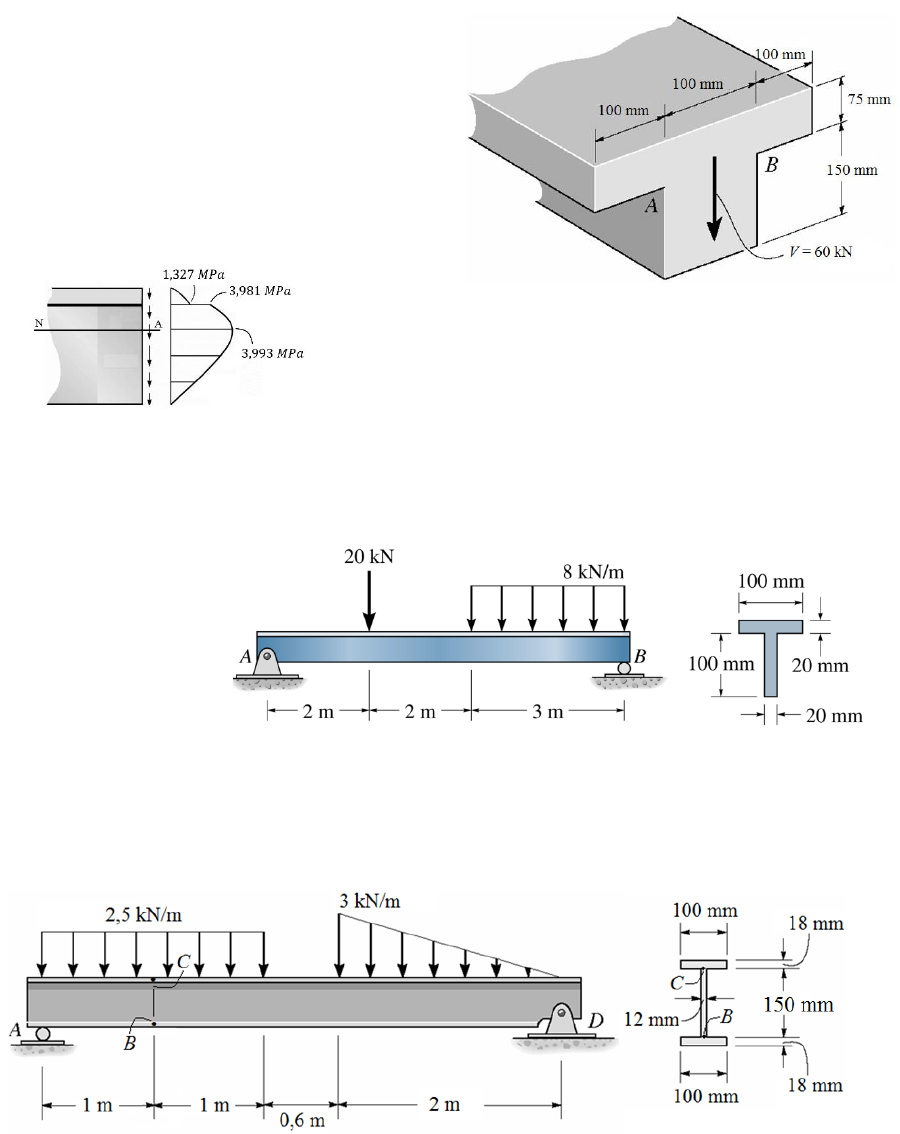 EXERCICIOS PROPOSTOS – CISALHAMENTO TRANSVERSAL 1) Se a viga T for submetida a um cisalhamento vertical V = 60 kN, determine a tensão de cisalhamento máxima na viga. Calcule também o salto da tensão de cisalhamento na junção aba-alma AB. Trace um rascunho da variação da intensidade da tensão de cisalhamento em toda a seção transversal Resposta: τmáx = 3,993 MPa τAB = 1,327 MPa (para t = 300 mm) τAB = 3,982 MPa (para t = 100 mm) 2) A viga T está sujeita ao carregamento na figura. Determine a tensão de cisalhamento transversal máxima na seção crítica da viga. Determinar as reações nos apoios, nas vigas. Resposta: τmáx = 14,74 MPa 3) Determine a tensão de cisalhamento nos postos B e C localizados na alma da viga de fibra de vidro e ainda a tensão de cisalhamento máxima que age na seção crítica da mesma. Resposta: τC = τB = 1 MPa τmáx = 2,55 MPa