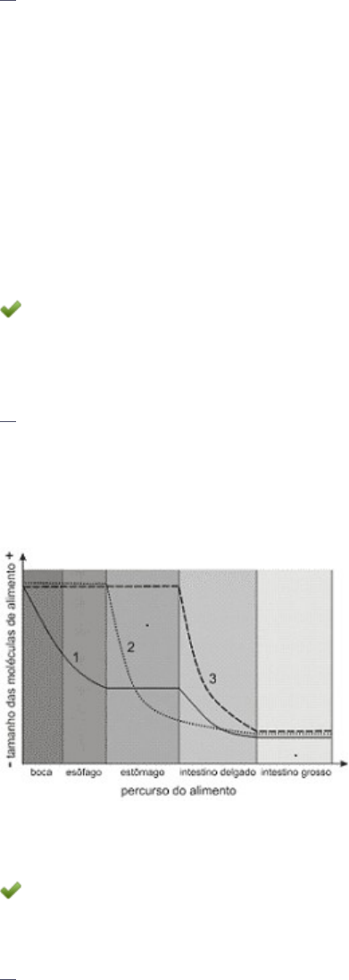 1. O ato de engolir deve ser devidamente coordenado para evitar que os alimentos e líquidos entrem na traqueia, causando engasgamento e a obstrução da traqueia. A resultante falta de fluxo de ar para os pulmões pode ser fatal, se o material não for deslocado por uma tossida vigorosa ou através de manobras de pressão, realizadas na altura do diafragma. Com relação ao processo de deglutição, assinale a alternativa CORRETA: a) Durante a fase esofágica, fase voluntária da deglutição, o alimento se move ao longo do esôfago até o estômago através de movimentos circulares. b) Na fase oral, em que o bolo alimentar é passado para a parte oral da faringe, ocorre através de movimentos involuntários, uma vez que não temos controle sobre este processo. c) A deglutição é facilitada pela secreção de gastrina, que auxilia a digestão dos alimentos durante a passagem pela boca, faringe e no esôfago. d) Durante a fase faríngea, a parte nasal da faringe é fechada, a laringe sobe, a epiglote veda a laringe e o bolo alimentar é passado para o esôfago. 2. Uma vez que o alimento se move ao longo do canal alimentar em direção única, o tubo pode ser organizado em compartimentos especializados que realizam a digestão e a absorção de nutrientes em etapas. No gráfico anexo, as curvas 1, 2 e 3 representam a digestão do alimento ao longo do aparelho digestório. É correto afirmar que a digestão das proteínas, dos lipídios e dos carboidratos está representada, respectivamente, pelas curvas: a) 1, 2 e 3. b) 2, 1 e 3. c) 3, 2 e 1. d) 2, 3 e 1. 3. O fígado é a maior glândula e o segundo maior órgão do corpo humano. Localiza-se sob o diafragma e seu peso aproximado é de 2,500 kg em um homem adulto e um pouco menos na mulher. Sobre esse órgão, analise as sentenças a seguir: I- O fígado armazena grandes quantidades de glicose, ferro, cobre e vitaminas. II- É no fígado que ocorre a secreção do suco pancreático. III- Dentre as diversas funções que o fígado exerce, uma delas é a de secretar a bile. IV- Pelo menos 1/3 do fígado deve estar funcionando para que não haja danos ao organismo. Assinale a alternativa CORRETA: a) As sentenças II, III e IV estão corretas. b) As sentenças I, III e IV estão corretas. c) As sentenças II e III estão corretas. d) As sentenças I, II e IV estão corretas. 4. Todos os componentes do trato digestivo apresentam características estruturais em comum. O canal alimentar, desde a região inferior do esôfago até o canal anal, é formado por um tubo oco, composto por um lúmen com diâmetro variável, circundado por uma parede formada por um arranjo básico de quatro camadas de tecido distintas. Sobre essas camadas, assinale a alternativa CORRETA: a) A tela ou camada submucosa é uma camada de tecido esquelético que envolve a túnica adventícia. São encontradas nesta camada grandes vasos sanguíneos e também glândulas endócrinas. b) A túnica serosa envolve a tela submucosa é uma camada dominada por fibras musculares lisas que desempenham uma importante função no processamento mecânico e na propulsão de materiais ao longo do trato digestório. c) A túnica mucosa representa o revestimento interno do trato digestório, ela consiste em uma camada de tecido conectivo frouxo, recoberta por um epitélio que é lubrificado por secreções glandulares. d) A túnica muscular é uma membrana composta por tecido conjuntivo areolar e epitélio escamoso simples. É também chamada peritônio visceral, porque forma uma parte do peritônio. 5. A deglutição resulta de um mecanismo neuromotor que tem por finalidade transportar o bolo alimentar da boca até o estômago de forma efetiva. É um procedimento complexo e dinâmico, fundamental para a nutrição e hidratação do organismo. Didaticamente, pode ser dividido nas seguintes fases: antecipatória, preparatória-oral e oral; faríngea e esofágica. Com relação ao processo de deglutição, classifique V para as sentenças verdadeiras e F para as falsas: ( ) A fase oral é uma fase voluntária, onde a língua, principal estrutura, é responsável por empurrar o alimento do seu ápice para trás, levando o bolo alimentar em direção a faringe. ( ) A fase faríngea é uma fase voluntária, nela, o bolo alimentar, através da pressão exercida pelo esôfago, culmina com a inibição da respiração. ( ) Fase esofagiana é uma fase involuntária, onde o bolo alimentar é transportado do esôfago até o estômago através de movimentos peristálticos. ( ) A fase preparatória é uma fase voluntária onde o alimento chega à boca, é triturado pelos dentes e misturado à saliva, passando a ser chamado bolo alimentar. Assinale a alternativa que apresenta a sequência CORRETA: FONTE: ALMEIDA, R. C. A.; HAQUETTE, R. C. B.; ANDRADE, I. S. N. de. Deglutição com e sem comando verbal: achados videofluoroscópicos. Revista da Sociedade Brasileira de Fonoaudiologia, v. 16, n. 3, p. 291-297, 2011. a) F - V - F - F. b) F - F - V - V. c) V - F - V - V. d) V - V - F - V. 6. O estômago é um órgão muscular em forma de bolsa, que apresenta duas válvulas. Dentre as suas funções, o estômago armazena o bolo alimentar e serve também de câmara de mistura para ele. É dividido em quatro regiões principais. Com relação à anatomia do estômago, classifique V para as sentenças verdadeiras e F para as falsas: ( ) A cárdia age como uma válvula, impedindo que o alimento que está no estômago volte para o esôfago. ( ) Fundo é a região inferior do estômago, na qual ocorre a junção do intestino delgado e o estômago. ( ) Corpo é a porção que corresponde a 2/3 do volume total do órgão. ( ) Piloro é a válvula que impede que o bolo alimentar passe ao intestino delgado prematuramente. Assinale a alternativa que apresenta a sequência CORRETA: a) F - V - V - V. b) V - V - F - V. c) V - F - V - V. d) F - F - V - F. 7. A digestão química ocorre através de diversas secreções contend