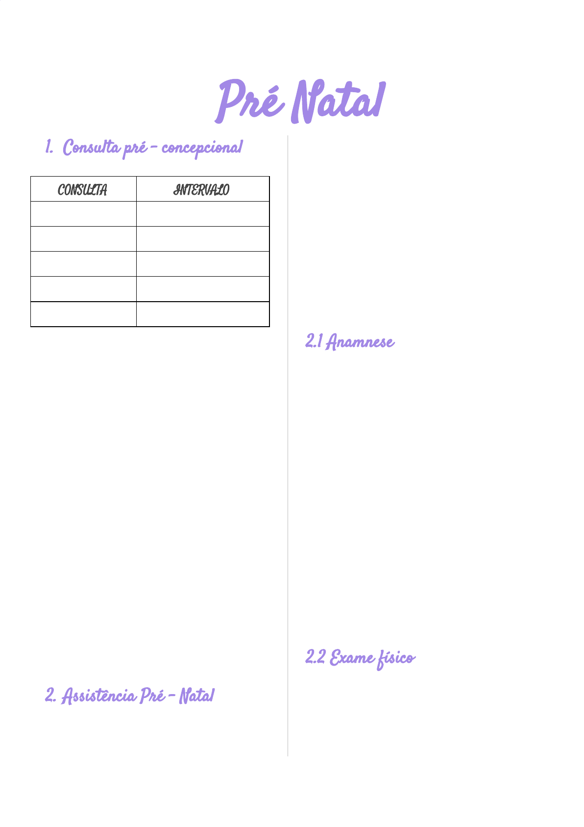 Pré Natal 1. Consulta pré - concepcional FONTE: FEBRASGO - 2014 > História clínica, exame físico e exame ginecológico > Exames complementares: - Hemograma, tipagem sanguínea do casal, glicemia de jejum - Sorologias - Parasitológico de fezes - Perfil hormonal (FSH, LH, prolactina, estradiol, TSH e T4 livre) > Orientar quanto ao momento ideal para que a gestação ocorra > Iniciar ácido fólico (é vitamina B9/folato) *O ácido fólico é essencial para formação e fechamento do tubo neural, que forma o sistema nervoso do feto. Determinação de risco gestacional: - Idade - Genética - Hábitos de vida - Peso - Atividade física e profissional - Ambiental, emocional e familiar - Comorbidades 2. Assistência Pré - Natal - Pré-natal = Prevenção - Assegurar o nascimento de uma criança saudável - Estabelecer riscos obstétricos - Conhecer o paciente - Definir os diagnósticos - Obstétricos > Normalidade > Patológicos -Clínicos e cirúrgicos - Programar sequência de exames posteriores; 2.1 Anamnese - Identificação; - Idade, queixa e duração; - Antecedentes pessoais Por exemplo - HAS, DM, cardiopatias, asma, cirurgias, etc - Antecedentes familiares Por exemplo - HAS, eclâmpsia, DM, cardiopatias, tireoidopatias, etc. - Hábitos Tabagismo, etilismo - Antecedentes ginecológicos > Clínicos (menarca, ciclos) e cirúrgicos; > Métodos contraceptivos (DIU, ACO, etc) 2.2 Exame físico - Geral - Especial: 1. Pele; 2. Mucosa Ocular; 3. Varizes; CONSULTA INTERVALO 1 + precoce possível Retorno Quando exames prontos Até 34 semanas Mensais Até 36 semanas Quinzenais Até o parto Semanais 4. Auscultas cardíacas e pulmonares; 5. Tireóide; 6. Aparelho locomotor; 7. Cavidade oral; - Obstétrico e ginecológico 1. Mamas e linfonodos axilares, supra e infraclaviculares; 2. Altura (ou fundo) uterino → C.U. em torno da 20 sem. 3. Avaliação da estática fetal (Manobra de Leopold - Zweifel); - 1 Tempo: Delimitação do fundo uterino (situação); - 2 Tempo: Determinação do dorso fetal (posição) - 3 Tempo: Determinação da apresentação; - 4 Tempo: Grau de insinuação da apresentação; 4. Batimento cardíaco fetal (BCF); - BCF NORMAL ENTRE 110 E 160 bpm; - Sonar a partir de 12 semana. - Pinnard a partir da 18 semana. 5. Exame especular; 6. Toque vaginal; - Último exame; 7. Pode-se realizar preventivo. 2.3 Orientações na 1ª consulta - Sinais de alerta: líquido, sangramento e MF; - Modificações do organismo, cloasma, varizes e estrias; - Higiene e vestes; - Mamas para amamentação; - Trabalho de parto; - Alimentares e ganho de peso; - Uso de drogas; - Vacinas e imunizações; - Dentes e gengivas; - Atividade física; - Atividade sexual; - Participação do parceiro ou da sua família;