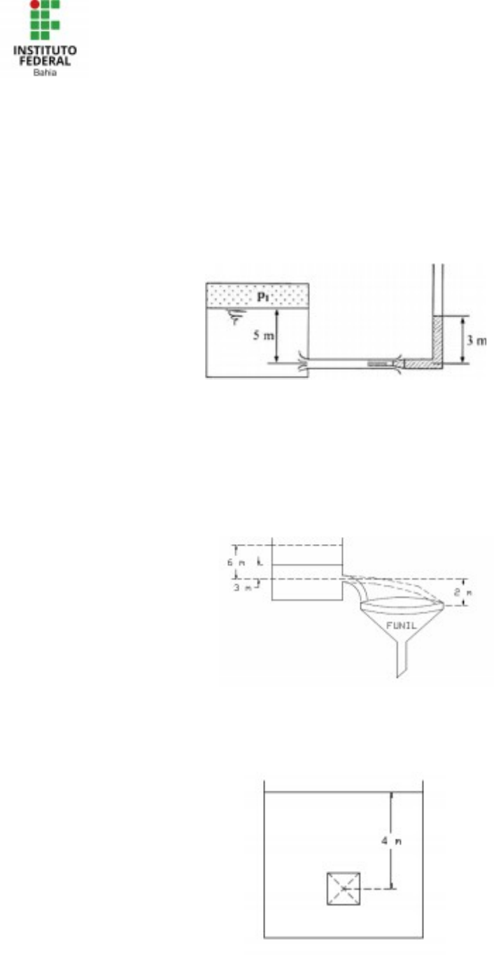 INSTITUTO FEDERAL DE CIÊNCIA, TECNOLOGIA E EDUCAÇÃO DISCIPLINA: HIDRÁULICA LISTA DE EXERCÍCIO II: HIDROMETRIA: orifícios, tubos de pitot e venturi LISTA DE EXERCÍCIOS 2: HIDROMETRIA: orifícios, tubos de pitot e venturi 1. Sendo ��v = 0.9 e ��c = 0.6, determine a pressão ��1, sabendo que o fluido é água e que sobe 3 �� no tubo de Pitot. Determine o caudal, sabendo que a área do orifício é 50 ����2. [23,2 L/s] Figura 1 – Reservatório com orifício e tubo de Pitot (Brunetti, 2008). 2. Qual o diâmetro que deve ser dado a uma comporta circular de coeficiente de vazão 0,62 e como centro a 2 m abaixo do nível do reservatório, para que a mesma dê escoamento de 500 L/s? 3. O nível d’água no reservatório do esquema abaixo oscila entre 3 e 5 metros a partir do centro de um orifício (cv = 0,98) na parede lateral. Qual deve ser o diâmetro do funil, situado a 2 metros abaixo do orifício, afim de que toda a água caia dentro do mesmo. [d=1,4m] Figura 3 – Reservatório com o funil 4. Que dimensões deve ter o orifício quadrado da figura abaixo para fornecer uma vazão de 500 l/s ? (Dado - cd = 0,61). [30,4 cm] Figura 4 – Reservatório com um orifício quadrado 5. Qual a vazão de uma comporta retangular com 0,60 m de largura e 1,00 m de altura, estando o nível da água a 0,20 m acima do seu bordo superior. A comporta tem descarga livre, e o seu coeficiente de vazão é 0,6. [1,3 m³/s] Prof. Lucas Farias de Sousa 1 INSTITUTO FEDERAL DE CIÊNCIA, TECNOLOGIA E EDUCAÇÃO DISCIPLINA: HIDRÁULICA LISTA DE EXERCÍCIO II: HIDROMETRIA: orifícios, tubos de pitot e venturi 6. Um tanque de 3,5 m de comprimento e 1,5 m de largura contém uma lâmina d’água de 1,2 m. Qual será o tempo necessário para abaixar a altura d’água para 30 cm, se um orifício de 75 mm de diâmetro for aberto no fundo do tanque. (Dado: cd = 0,61) [8 min e 2 seg] 7. Um tanque retangular de base 5 m x 1,2 m, contém uma lâmina d’água de 1,2 metros de altura. Sabendo-se que para esvaziar o tanque através de um orifício de 100 mm, localizado no fundo do mesmo, gasta-se 10 minutos, calcule o coeficiente de descarga desse orifício. [Cd=0,63] 8. Um tanque é completamente esvaziado através de um orifício de fundo (cc = 0,60; cv = 1,00) em 60 minutos. Calcule o novo tempo de esvaziamento após adaptarmos ao orifício um bocal cilíndrico de mesmo diâmetro interno, porém com cc = 1,00 e cv = 0,8. [45 min] 9. De quanto aumentará a vazão, quando adaptarmos um bocal cilíndrico externo ao orifício da figura abaixo ? Dados: cd (orifício) = 0,61; cd (bocal) = 0,82). [7,2 ] Figura 5 – Reservatório com a adaptação do bocal 10. O reservatório superior descarrega a água, por um orifício cujo ��d = 0.6, para um reservatório que, por sua vez, descarrega água por outro orifício. O sistema está em equilíbrio, de forma que o nível não muda em nenhum dos dois reservatórios. Qual será o coeficiente de descarga do segundo orifício? Dados: ����â���������� ���� ��������í������ (1): 9 ����; ����â���������� ���� ��������í������ (2): 10 ��m [Cd=0.81] Figura 10 – Sistema de reservatórios (Brunetti, 2008). Prof. Lucas Farias de Sousa 2 INSTITUTO FEDERAL DE CIÊNCIA, TECNOLOGIA E EDUCAÇÃO DISCIPLINA: HIDRÁULICA LISTA DE EXERCÍCIO II: HIDROMETRIA: orifícios, tubos de pitot e venturi 11. No fundo do reservatório inferior da figura, inicialmente vazio, situa-se um cubo de madeira de 1 �� de aresta. Do reservatório superior escoa água através de um orifício de aresta viva, cujo coeficiente de contração é ��c = 0.6. Determine o valor do coeficiente de velocidade do orifício, para que o corpo comece a flutuar em 20 ��. Dados: ��nadeira = 8000 ��/��3; ��orifício = 0.1 ��2; �� = 10 ��/��2. [Cv=0.97] Figura 11 – Sistema de reservatórios e cubo de madeira (Brunetti, 2008). 12. Um orifício de bordo delgado tem um diâmetro de 7.5 ���� e descarrega um caudal de 28 ��/��. Mede-se um ponto da trajetória do jato e obtém-se �� = 4.7 �� para �� = 1.2 ��. Determine os coeficientes de velocidade, de contração e de caudal do orifício. [Cv=0.96; Cd=0.63; Cc=0.66] Figura 12 – Reservatório com orifício de bordo delgado (Brunetti, 2008). 13. Após 5 ������ de funcionamento, o reservatório inferior, inicialmente vazio, está completamente cheio e, então, a comporta gira em torno do eixo ��, devido ao momento de 6 × 104 ��. �� nela aplicado pela água. Determine o coeficiente de descarga do orifício de saída do reservatório superior. Á������ ���� ��������í������ = 0.01 ��2. [Cd=0.47] Figura 13 – Sistema de reservatórios com comporta (Brunetti, 2008). Prof. Lucas Farias de Sousa 3 INSTITUTO FEDERAL DE CIÊNCIA, TECNOLOGIA E EDUCAÇÃO DISCIPLINA: HIDRÁULICA LISTA DE EXERCÍCIO II: HIDROMETRIA: orifícios, tubos de pitot e venturi 14. Um tubo de Pitot é preso num barco que se desloca a 45 ����/ℎ. Qual será a altura (ℎ) alcançada pela água no ramo vertical? (�� = 10 ��/��2) [h=7,8 m] Figura 14 – Tubo de Pitot preso num barco (Brunetti, 2008). 15. Na conduta da figura, o fluido é considerado ideal. Dados: ��1 = 16 ��; ��1 = 52 ������; �� = 104 ��/��3; ��1 = ��3 = 10 ����. Determine: (�� = 10 ��/��2) a) o caudal em peso; [314 N/s] b) a altura ℎ1 no manômetro; [0 m] c) o diâmetro da seção (2). [5,7 cm] 16. O Venturi é um tubo convergente/divergente, como é mostrado na figura. Determine a velocidade na seção mínima (garganta) de área 5 ����2, se na seção de entrada de área 20 ����2a velocidade é 2 ��/��. O fluido é incompressível. [8 m