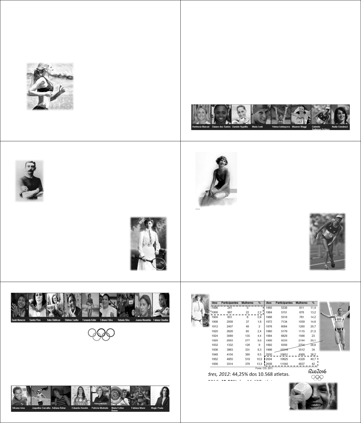 Tríade da Mulher Atleta Nutrição Esportiva - Aula 6 Profa Alessandra Lucca A mulher sempre participou de competições? Não! Historicamente não havia encorajamento da participação feminina em jogos esportivos, pois presumia-se que a mulher não estava apta fisiologicamente para participar de atividade física de alta intensidade e longa duração. • O ciclo menstrual sempre foi ligado a superstições. • Preocupação se a "delicadeza" das mulheres não poderia ser prejudicada pelos músculos que ganhariam. Quando houve a primeira participação das mulheres em olimpíadas? Em 1896, em Atenas, as mulheres eram proibidas de disputar provas olímpicas. “Mulheres tem apenas um papel, que é o de coroar os vendedores” – Barão Pierre de Coubertin, fundador do COI. Organizadores descreviam a inclusão da mulher como “impraticável, desinteressante e incorreta”. Somente em Paris, em 1900 permitiu-se a participação feminina nas Olimpíadas. Foram 22 atletas inscritas no tênis, vela, críquete, hipismo e golfe → 2,21% do total de competidores naquela edição. 1984, Los Angeles: primeira maratona olímpica feminina, após 90 anos de exclusão e discriminação. 50 mulheres de 28 países disputaram. Vencedora foi americana, mas a imagem da prova foi a da suíça, Gabriele Andersen. 1924, Paris - A nadadora Sybill Bauer ganha o ouro nos 100 m de costas. Foi a 1ª mulher da história a quebrar um recorde masculino. Até 1960 só era permitido à mulher correr até 800 metros (Mantoanelli et al., 2002). Nos últimos 20 anos... • A participação em competições esportivas e o número de mulheres atletas, em particular, tem aumentado consideravelmente. • A participação feminina cresceu cerca de 600% abrangendo um total de mais de 1,9 milhões de mulheres atletas (Pardini, 2001). Londres, 2012: 44,25% dos 10.568 atletas. Rio 2016: 45,29% dos 11.437 atletas Foi o maior percentual já registrado! Maureen Maggi – 1º ouro individual feminino Com o aumento da participação feminina no esporte, notaram- se os seus benefícios: efeitos fisiológicos: prevenção de CA de mama e de osteoporose; efeitos psicológicos: como a aceitação melhor do corpo e maior auto-estima; efeitos sociais: evitando a gravidez na adolescência e o envolvimento com drogas e ocasionando maior assiduidade na escola. No entanto, apesar dos benefícios, quando se trata de modalidade competitiva, pode haver riscos de injúrias e fraturas ou problemas relacionados à saúde (Callahan, 2000). Baixa Ingestão Energética (com ou sem desordem alimentar) Baixa Densidade Mineral Óssea Disfunção menstrual Estresse psicológico/competitivo Tríade da Mulher Atleta Baixa ingestão energética (com ou sem desordem alimentar) • A ingestão energética insuficiente, mesmo sem atividade física, é um dos fatores que contribuem para a disfunção menstrual. • A redução de energia ingerida não está relacionada com o aparelho reprodutor feminino, porém a desnutrição aguda, provocada por essa restrição, está associada ao surgimento da amenorreia. • Eumenorreia: precisa consumir cerca de 45kcal/kg de massa magra/dia 2a Guerra Mundial: falta de alimento � mulheres tornaram-se amenorreicas (<30kcal/kg de mm/dia) • Restabelecimento do acesso à alimentação � volta dos ciclos menstruais (Beznos, 1993). Desordens Alimentares Até 70% dos atletas de elite que competem em esportes de categoria de peso (masculino e feminino) faz alguma dieta e tem algum tipo de distúrbio alimentar com o objetivo de reduzir o peso antes da competição. Prevalência de TA entre atletas de elite feminino (16% a 47%) prevalência em não atletas: Homens (0,5%); mulheres (10%) Desordens Alimentares Gama de comportamentos alimentares irregulares, variam desde restrição de alimentos, passando por exageros alimentares e purgação (vômito induzido), não são necessariamente os mais graves como anorexia nervosa (AN) e a bulimia nervosa (BN), mas pode evoluir para estes. Comportamentos incentivados por uma imagem corporal específica idolatrada pelos treinadores, colegas de treino, próprias atletas e mídia. Baixa Densidade Mineral Óssea (DMO) Osteopenia ou osteoporose • Massa óssea reduzida e maiores taxas de perda óssea. Prevalência de osteopenia: 22% a 50% em atletas mulheres Prevalência de osteoporose: até 13% Prevalência de osteopenia e osteoporose na população normal: 12% e 2,3%. DMO significantemente menor em atletas amenorreicas se comparada à atletas eumenorreicas. Atletas com amenorreia têm 2 a 4 vezes mais chances de fraturas que atletas eumenorreicas Por que atletas sofrem redução da massa óssea? Em geral, existem 2 causas principais para perda de tecido ósseo na mulher atleta: - deficiência de estrogênio decorrente de amenorreia; - ingestão inadequada de cálcio em razão dos transtornos alimentares. Mas o treinamento físico não atenua a perda óssea? Sim, mas não consegue reverter completamente o processo, devido a hipoestrogenia. Baixa DMO Tríade da Mulher Atleta Disfunções menstruais Amenorreia • Amenorréia é ausência de 3 ou mais ciclos menstruais consecutivos após a menarca. – Primária: atraso na menarca (nenhuma menstruação na idade de 15 anos c/ presença das características sexuais normais ou 5 anos após desenvolvimento das mamas) – Secundária: sem menstruação por mais de 90 dias após a menarca Outras Irregularidades Menstruais • anovulação (ausência por desenvolvimento folicular prejudicado); • deficiência da fase lútea (condição assintomática causada por uma fase lútea encurtada ( < 11 dias ) e/ou um baixa concentração de progesterona); • oligomenorreia (intervalo entre ciclos maiores do que 35 dias) Amenorreia Hipotalâmica Funcional (AFH): Amenorreia Hipotalâmica Funcional: tipo mais associado ao exercício e alterações na disponibilidade de energia. Ocorre a supressão do eixo hipotalâmico-pituitário- ovariano sem causa org