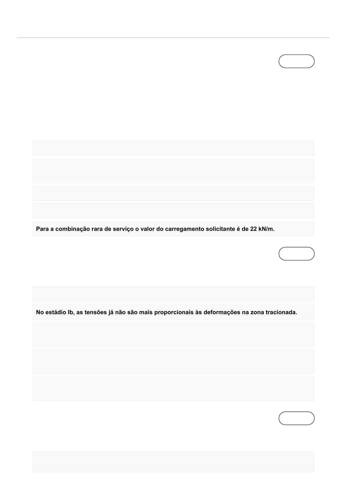 04/08/2020 Visualizar tarefa https://sereduc.blackboard.com/ultra/courses/_31153_1/outline/assessment/_2350411_1/overview/attempt/_8041319_1?courseId=_31153_1 1/5 Avaliação On-Line 4 (AOL 4) - Questionário Conteúdo do teste Pergunta 1 1 ponto Uma viga de um edifício residencial está submetida a um carregamento linear de 20 kN/m. Estima-se que 60% desta carga seja de natureza permanente e 40% acidental. A seção transversal da viga é retangular com bw = 20 cm e h = 40 cm e para o seu peso próprio é considerado um peso específico do concreto armado de 25 kN/m³. Assinale a alternativa correta quanto ao valor de carregamento solicitante a ser considerado nessa viga, conforme a combinação. As ações devem ser consideradas separadamente e com efeito desfavorável. Para a combinação última excepcional o valor do carregamento solicitante é de 27,2 kN/m. Para a combinação quase permanente de serviço o valor do carregamento solicitante é de 18 kN/m. Para combinação normal última o valor de carregamento solicitante é de 30,8 kN/m. Para a combinação frequente de serviço o valor do carregamento solicitante é de 18,8 kN/m. Para a combinação rara de serviço o valor do carregamento solicitante é de 22 kN/m. Pergunta 2 1 ponto Com relação às deformações nos elementos em cada estádio de cálculo, assinale a alternativa correta. No estádio Ia, o elemento não se deforma de maneira elástica em sua zona tracionada. No estádio Ib, as tensões já não são mais proporcionais às deformações na zona tracionada. No estádio II, ocorre a elevação da linha neutra, pois há alongamentos menores na zona tracionada do que na zona não comprimida. No estádio III, as deformações apresentam um diagrama curvilíneo na zona comprimida, caracterizando seu comportamento elástico. Somente no estádio III é que as deformações na zona tracionada não são proporcionais às tensões. Pergunta 3 1 ponto Com relação às principais características de cada estádio de cálculo, assinale a alternativa correta. Valoes Realce Valoes Realce 04/08/2020 Visualizar tarefa https://sereduc.blackboard.com/ultra/courses/_31153_1/outline/assessment/_2350411_1/overview/attempt/_8041319_1?courseId=_31153_1 2/5 No estádio II, formam-se as fissuras na zona comprimida do concreto e as tensões se mantêm proporcionais às deformações nessa zona. O estádio III caracteriza o colapso da estrutura, as tensões não são proporcionais às deformações em nenhuma de suas zonas. O estádio Ia caracteriza o início do carregamento, as solicitações são pequenas e o concreto encontra-se fissurado. No estádio Ib, as tensões já não são proporcionais às deformações na zona tracionada, o que caracteriza o esmagamento do concreto. No estádio III, formam-se as fissuras, por isso é conhecido como estádio de ruptura da seção de concreto armado. Pergunta 4 1 ponto Com relação aos estados limites e aos critérios de segurança das edificações, assinale a resposta correta. Os valores de combinações no estado limite de serviço serão sempre superiores às combinações no estado limite último. Para combinações no estado limite último, o valor característico da resistência do concreto armado deve ser superior ao valor de cálculo das solicitações. As combinações do estado limite de serviço são utilizadas para o dimensionamento das estruturas ao colapso. As deformações são analisadas somente nos estados limites de serviço. Para verificações de estados limites de serviço, o valor de cálculo da combinação das ações deve ser inferior ao valor limite adotado para seu efeito. Pergunta 5 1 ponto Nos estádios I e II, ocorrem proporcionalidades entre as tensões e deformações que facilitam o cálculo das tensões analiticamente. Conforme essa análise, assinale a alternativa correta. As formulações para o estádio Ia também são válidas para o estádio Ib. As formulações para tensão no concreto na borda tracionada se diferenciam apenas pelos diferentes momentos de inércia da seção homogeneizada de cada estádio. A formulação para os valores das tensões no concreto na borda comprimida e na armadura comprimida e tracionada se diferem apenas pelo momento de inércia da seção homogeneizada. Valoes Realce Valoes Realce Valoes Realce 04/08/2020 Visualizar tarefa https://sereduc.blackboard.com/ultra/courses/_31153_1/outline/assessment/_2350411_1/overview/attempt/_8041319_1?courseId=_31153_1 3/5 Os momentos de inércia da seção homogeneizada para os estádios I e II são os mesmos, visto que a seção analisada não muda. O coeficiente αe relaciona o modulo de elasticidade do concreto com a deformação do aço. Pergunta 6 1 ponto Segundo as relações entre os estádios de cálculo e a análise dos estados limites, assinale alternativa correta. O Estádio II é usado como base para o dimensionamento de seções de concreto armado no estado limite último. No estádio Ia, as tensões elásticas geradas pelo carregamento apresentam pouca relevância diante das tensões causadas pela retração do concreto, por isso é utilizado apenas para verificações do estado limite último. No estádio III, pode ocorrer o escoamento excessivo da armadura tracionada ou o esmagamento do concreto na parte comprimida, evidenciando-se estados limites de serviço.comenta: No estádio II, são verificados o estado limite de abertura das fissuras e o estado limite de deformações excessivas, por exemplo. No estádio Ib, não são verificados estados limites de serviço. No estádio II, a seção já está fissurada e, por isso, ela representa as condições de trabalho da seção sob cargas de serviço, ou seja, é possível verificar estados limites de serviço. Pergunta 7 1 ponto Com relação às combinações de ações no estado limite último e no estado limite de serviço e seus coeficientes de ponderação e redução, assinale a alternativa correta. Nas combinações 