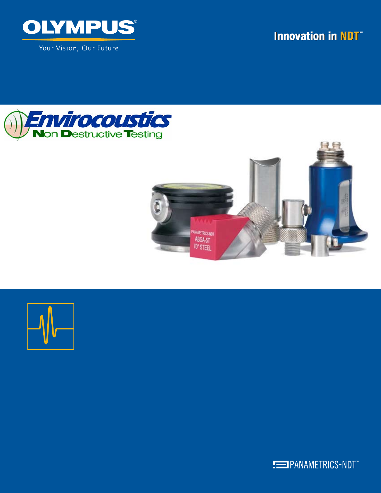 Ultrasonic Transducers for Nondestructive Testing OLYMPUS NDT Olympus NDT is a leading global manufacturer of innovative nondestructive testing instruments that are used in industrial and research applications ranging from aerospace, energy, automotive, and electronics to manufacturing. Olympus NDT instruments contribute to the quality of products and add to the safety of infrastructure and facilities. They include flaw detectors, thickness gages, bond testers, pulser-receivers, transducers, and advanced systems for inline applications. Our leading edge technologies include ultrasound, ultrasound phased array, eddy current, and eddy current array. Olympus NDT offers products and services from several high quality brands: R/D Tech®, Panametrics-NDT™, NDT Engineering, Sonic®, and Nortec®. For many decades these brands have earned excellent reputations for providing cost- effective solutions and excellent support and customer service. Based in Waltham, Massachusetts, USA, the company has sales and service centers in all principal industrial locations worldwide. Visit www.olympusNDT.com for applications and sales assistance near you. PANAMETRICS-NDT TRANSDUCERS Panametrics-NDT ultrasonic transducers are available in more than 5000 variations in frequency, element diameter, and connector styles. With more than forty years of transducer experience, Olympus NDT has developed a wide range of custom transducers for special applications in flaw detection, weld inspection, thickness gaging, and materials analysis. El. Venizelou 7 & Delfon, Metamorfosi 14452 Athens, Greece tel: +30 210 2846 801-4, fax: +30 210 2846 805 sales@envirocoustics.gr, www.envirocoustics.gr �pana@olympusNDT.com Table of Contents Transducer Selection .................................2-3 Part Number Configurations......................... 4 Test and Documentation............................... 5 Contact Transducers..................................6-7 Fingertip .............................................................................. 6 Standard ............................................................................. 7 Magnetic Hold Down .......................................................... 7 Dual Element Transducers ........................8-9 Flush Case .......................................................................... 8 Fingertip .............................................................................. 9 Extended Range .................................................................. 9 Miniature Tip ....................................................................... 9 Angle Beam Transducers and Wedges .�0-�4 Miniature Screw-In .....................................................�0-�� Standard ........................................................................... �2 Integral .............................................................................. �3 Shear Wave Wedges for Aluminum .................................. �3 Contoured Wedges ........................................................... �3 AWS ................................................................................... �4 CDS Wedges ...................................................................... �4 Normal Incidence Shear Wave Transducers ................................................ �5 Delay Line Transducers .........................�6-�7 Replaceable Delay Line and Options ............................... �6 Sonopen® Replaceable Delay Line ................................... �7 Protected Face Transducers ..................�8-�9 Immersion Transducers .........................20-24 Standard ........................................................................... 20 Large Diameter and Slim Line .......................................... 2� Pencil Case, Side Looking Case and XMS ........................ 22 Paintbrush ......................................................................... 23 Reflector Mirrors and Search Tubes ................................ 23 Bubblers and Bubbler Transducers ................................. 24 RBS-� Immersion Tank ..................................................... 24 TOFD Transducers ....................................... 25 High Frequency Transducers .................26-27 Contact .............................................................................. 26 Standard Case Immersion ................................................ 27 SU/RM Case Immersion .................................................... 27 Atlas European Standard Transducers ...........................................28-29 Angle Beam, Dual ............................................................. 28 Contact, Protected Face ................................................... 29 Gage Dual Transducers .........................30-3� Special Transducers ..............................32-33 Test Blocks .............................................34-35 Cables ....................................................36-37 Couplants and Adaptors ............................. 38 Technical Notes .....................................39-48 2 www.olympusNDT.com Note: For sample test forms of transducers that you are interested in purchasing or if you have questions, please contact us via phone, fax, or e-mail. Transducer Selection The transducer is one of the most critical components of any ultrasonic system. A great deal of attention should be paid to selecting the proper transducer for the application. The performance of the system as a whole is of great importance. Variations in instrument characteristics and settings as well as material properties and coupling conditions play a major role in system performance. We have developed three different series of transducers to respond to the need for variety. Each series has its own unique characteristics. Transducer configuration also has an impact on system performance. Consideration should be given to the use of f