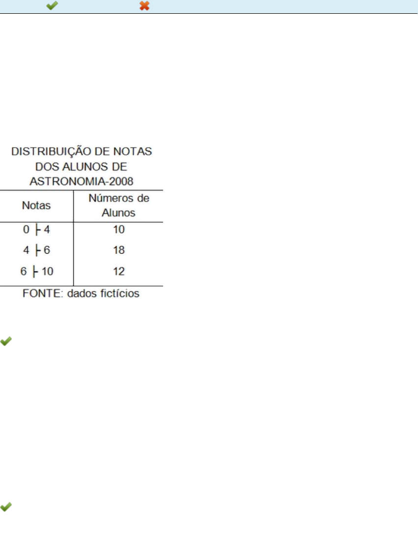 Disciplina: Estatística e Indicadores Sociais Avaliação: Avaliação Final (Objetiva) - Individual Semipresencial Legenda: Resposta Certa Sua Resposta Errada Parte superior do formulário 1. Um professor aplicou uma prova a seus quarenta alunos de Estatística. Os resultados foram organizados conforme tabela a seguir. Com base nos dados da tabela, classifique V para as sentenças verdadeiras e F para as falsas: ( ) A média das notas desses alunos é de 5,15. ( ) O desvio-padrão das notas desses alunos é 0,45. ( ) O coeficiente de variação desses alunos é de 43%. Assinale a alternativa que apresenta a sequência CORRETA: a) F - V - V. b) F - F - V. c) V - F - V. d) V - V - F. 2. Numa determinada instituição de ensino superior, o professor João registrou as idades dos 20 alunos de uma turma da disciplina de Estatística e Indicadores Sociais. As idades (em anos) estão na sequência a seguir: 26 32 36 38 30 30 26 30 25 30 41 36 30 28 26 33 30 35 33 30 Qual é a moda das idades dos alunos dessa turma? a) A moda das idades é 26 anos. b) A moda das idades é 30 anos. c) A moda das idades é 28 anos. d) A moda das idades é 33 anos. 3. Existem muitos indicadores sociais, porém existem indicadores que não divulgam seus dados. Qual das entidades e instituições públicas ou privadas que produzem informações sobre os indicadores econômicos, e que muitas vezes não têm divulgação pública? a) CENSO. b) COFINS. c) BNDES. d) Pesquisas operacionais. 4. No âmbito social e demográfico, a estatística se destaca por levantamentos, tendo como base a coleta de informações junto às famílias e à realidade social vivenciada, contribuindo para o entendimento da dinâmica da população, a fim de propor ações referentes a gastos no âmbito da saúde e assistência social. Classifique V para as sentenças verdadeiras e F para as falsas: ( ) No cenário nacional, podemos contar o índice de Amostragem de Domicílios, o qual identifica as condições de habitação da população. ( ) Para ampliar o universo social, o índice de pesquisa identifica as condições de empregabilidade da população, contudo, esse índice desconsidera a empregabilidade feminina. ( ) Como fonte de informações sociodemográficas, as pesquisas são fundamentadas em registros administrativos, no Registro Civil, de Assistência Médico-Sanitária e a Pesquisa Nacional de Saneamento Básico. ( ) A Pesquisa de Orçamentos Familiares (POF), de periodicidade quinquenal, não apresenta conteúdo a fim de ter maior conhecimento da estrutura de rendimentos e da despesa das famílias. Agora, assinale a alternativa que apresenta a sequência CORRETA: a) V - F - F - F. b) F - V - F - V. c) V - F - V - F. d) V - F - V - V. 5. O gráfico de barras anexo exibe a distribuição de frequência das notas obtidas em uma prova de Serviço Social. Com relação ao gráfico, assinale a alternativa CORRETA que apresenta a quantidade de alunos que fizeram a prova e a quantidade que obteve nota superior a 5, respectivamente: a) 55 e 32. b) 55 e 6. c) 25 e 14. d) 25 e 16. 6. Para o serviço social, a estatística é importante, pois determina a análise de dados que afetam de forma direta e indireta a vida de todos, pois os indicadores sociais são base de uma pesquisa com enorme base de dados. Assim, a coleta de dados: a) Favorece apenas os interessados no dados de um aspecto específico. b) É somente o processo final da organização dos dados. c) Define a apresentação e a caracterização da informação. d) São dados relativos a uma amostra da população. 7. Na atualidade, as chamadas ciências investigativas tornaram-se importantes, pois apresentam as taxas de referências para a atuação de diversas categorias profissionais. No caso do assistente social, a atuação prática diária são taxas utilizadas. Assinale a alternativa CORRETA que apresenta algumas dessas taxas: a) Taxa per capita, Taxa de vulnerabilidade social, Taxa de analfabetismo. b) Taxa de Negociação Salarial, Taxa de controle da mortalidade. c) Taxa de Seguro Desemprego, Taxa de contribuição sindical. d) Taxa de Imposto de Renda, Taxa de IPTU, Taxa de Saneamento. 8. O assistente social elaborou uma intervenção destinada à melhora da qualidade de vida dos funcionários de uma empresa. O trabalho deu-se de maneira multidisciplinar através do levantamento da realidade social: elencando as pessoas que se encontram em vulnerabilidade social. A partir dos dados brutos, realizou-se uma análise comparativa da estrutura existente e a efetividade das políticas de atendimento existentes. Com essa pesquisa, foi possível identificar os recursos existentes no local, bem como identificar as novas necessidades. A partir desse pressuposto, quanto à perspectiva de planejamento, analise as opções a seguir: I- Diagnóstico social. II- Mobilização da comunidade. III- Qualificação da equipe. IV- Implementação do plano. Agora, assinale a alternativa CORRETA: a) As opções III e IV estão corretas. b) As opções I, II e III estão corretas. c) Somente a opção IV está correta. d) Somente a opção I está correta. 9. As políticas públicas vêm se fortalecendo à medida que são identificadas suas atribuições específicas e o trabalho multidisciplinar passa a compreender a dimensão mais ampla da realidade social. Nesse sentido, os indicadores sociais assumem papel importantíssimo no processo de reconhecimento da realidade social no campo do planejamento das políticas sociais. A partir desse pressuposto, analise as sentenças a seguir: I- O papel dos indicadores sociais é fornecer dados agregados da realidade social definidos por variáveis baseadas na experiência. II- O papel dos indicadores sociais é fornecer informações para descrição da realidade social como caráter operacional. III- O papel dos indicadores sociais é fornecer informações desiguais, não relacionadas à realidade social. IV- O papel dos indicadores sociais é anali