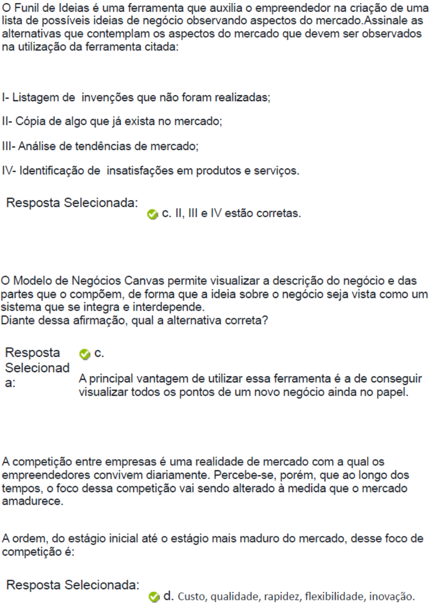 O autor Nakagawa (2013) destaca que o plano de negócios pode se utilizado também para uso interno da empresa. Verifique o quadro a seguir e escolha a alternativa correta: Para que o processo empreendedor aconteça são necessárias algumas premissas como: Capital humano, conhecimento, profissionais, entre outras. Assinale a alternativa que apresentas as premissas corretas que completam o processo empreendedor. Segundo Koulopoulos (2011, p.10): “Grandes mudanças são acompanhadas por um contexto de incertezas em que inúmeras forças interagem simultaneamente desafiando a capacidade humana de projetar como o caos irá evoluir. Diferentemente do impacto de um míssil o choque causado por importantes inovações não é previsível – ao contrário se apresenta como uma terrível tempestade de areia”. Com relação à citação acima, avalie as afirmações abaixo: I. Para um empreendedor, os impactos da inovação na sociedade poderão ser previstos, pois houve um estudo prévio de informações de mercado e clientes; II. O ambiente externo da empresa é dinâmico e imprevisível, a inovação pode encontrar um ambiente não muito favorável e trazer novos resultados não previstos; III. Toda invenção é previsível, senão não seria invenção; IV. A citação de Koulopoulos é aplicável apenas nas inovações incrementais (pequenas melhorias). Ao desenvolver o plano de negócios, alinhando sua aplicação para um público externo à empresa, e ao analisar o quadro a seguir, é correto afirmar que: USO EXTERNO Objetivo: captação de recursos, parcerias, vencer concursos de plano e negócio Orientação: como atender aos requisitos dos leitores Abordagem: documento de venda Principal Técnica: verba persuasiva Leitores: investidores, futuros parceiros e membros de bancas de avaliação De uma forma geral, as empresas estão procurando empreendedores para trabalhar em seus processos internos. Este profissional é chamado de intraempreendedor. Considerando o texto, avalie as seguintes asserções e a relação proposta entre elas. I. É necessário ter funcionários que corram riscos, possuam o desejo de mudar os processos, sejam criativos, tenham visão de futuro e sejam empreendedores. Porque II. As empresas buscam acompanhar o mercado, as tendências, e capturar as oportunidades. A respeito dessas asserções, assinale a opção correta: Muitos profissionais de sucesso vão além da consolidação da carreira profissional, eles associam a realização pessoal e ainda criam um mundo melhor, eles querem fazer mais e melhor. Existe um teste de realidade desenvolvido pela metodologia Empreender Endeavor (2010, p. 6) que define três círculos e da junção deles ou intersecção surgirá as possíveis carreiras ou negócios que você poderá atuar dentro desta perspectiva. Estes três círculos são: Resposta Selecionada: Os complexos produtivos de empresas e serviços, que tem como base o conhecimento científico tecnológico, são conhecidos como Parques Tecnológicos, as empresas ao ingressarem podem ter acesso:Assinale a resposta correta: Para a utilização do Modelo de Negócios Canvas é necessário preencher [..........] componentes básicos. Esses componentes auxiliam na demonstração da lógica de como uma organização pretende gerar valor para cliente, organização e sociedade. Assinale a alterativa correta, que complete a sentença: “Todo empreendedor ou intraempreendedor deve gerar soluções em produtos, serviços ou processos pensando no nível de benefícios que esta inovação irá proporcionar aos clientes, comunidade, sociedade, estes benefícios estão distribuídos em níveis, são eles: benefício central, básico, esperado, ampliado e potencial.” É um título adequado ao texto apresentado acima: Resposta Selecionada: a. A inovação gerando valor agregado em vários níveis de benefícios. Inovação organizacional: São os métodos para redução de custos administrativos, desperdícios, de suprimentos, envolve também a gestão das pessoas, gestão estratégica e envolvem todas as partes interessadas. Estas partes interessadas são: I. Funcionários envolvidos no processo, não importando o nível em que se encontram; II. Proprietários, suas famílias e acionistas do negócio; III. Mercado e concorrentes; IV. Fornecedores e parceiros do negócio que participam da inovação organizacional. É correto o que se afirma: d. I e IV. Empreendedor é aquele que apresenta resultados nas mais diversas frentes. Com relação às “frentes”, assinale a alternativa correta: a. Introduz um novo bem, produto ou serviço; um novo método trabalho; novas formas de produzir e entregar algo; um novo mercado. Sobre a propriedade intelectual Jungmann (2010, p. 27) afirma que o “sistema de propriedade intelectual não apenas protege os frutos derivados da atividade criativa, mas também os investimentos que são feitos para levar esses frutos ao mercado”, onde “Detentores de direitos de propriedade intelectual são protegidos por leis específicas contra o uso não autorizado de seus trabalhos, produtos, processos, marcas e serviços”. Adaptado de: Instituto Nacional da Propriedade Industrial (INPI). Especialistas debatem desafios e oportunidades de exportar bens de PI. Ministério do Desenvolvimento, Indústria e comércio Exterior. Disponível em: < http://www.inpi.gov.br/noticias/inpi-firjan-e-cni-promovem-seminario-sobre-pi-e- lancam-guia-do-exportador>. Acesso em jan. 2017. Com relação a proteção intelectual, avalie as afirmações abaixo: I. Para ter exclusividade sobre o nome de um serviço ou produto, ou ainda um logotipo que o identifique, você precisa registrar uma marca; II. Se você desenvolveu um novo programa de computador, pode solicitar o registro de seu código-fonte ou código-objeto; III. Se você inventou uma nova tecnologia, seja para produto ou processo, pode buscar o direito a uma patente junto ao INPI; IV. Branding consiste na 