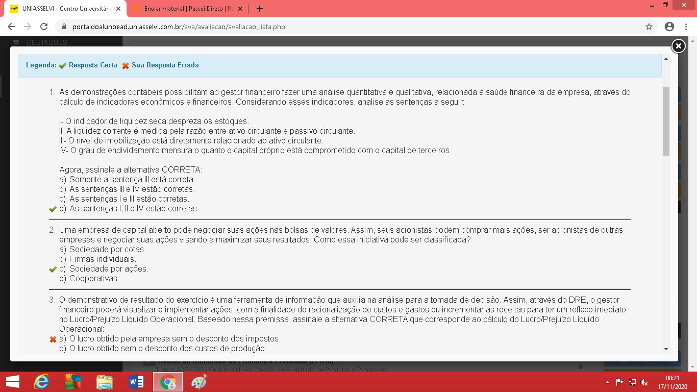 As demonstrações contábeis possibilitam ao gestor financeiro fazer uma análise quantitativa e qualitativa, relacionada à saúde financeira da empresa, através do cálculo de indicadores econômicos e financeiros. Considerando esses indicadores, analise as sentenças a seguir: Agora, assinale a alternativa CORRETA: I- indicador de liquidez seca despreza os estoques. II- A liquidez corrente é medida pela razão entre ativo circulante e passivo circulante. III- nível de imobilização está diretamente relacionado ao ativo circulante. IV- grau de endividamento mensura o quanto capital próprio está comprometido com capital de terceiros. a) Somente a sentença III está correta. b) As sentenças III e IV estão corretas. c) As sentenças I e III estão corretas. d) As sentenças I e IV estão corretas.