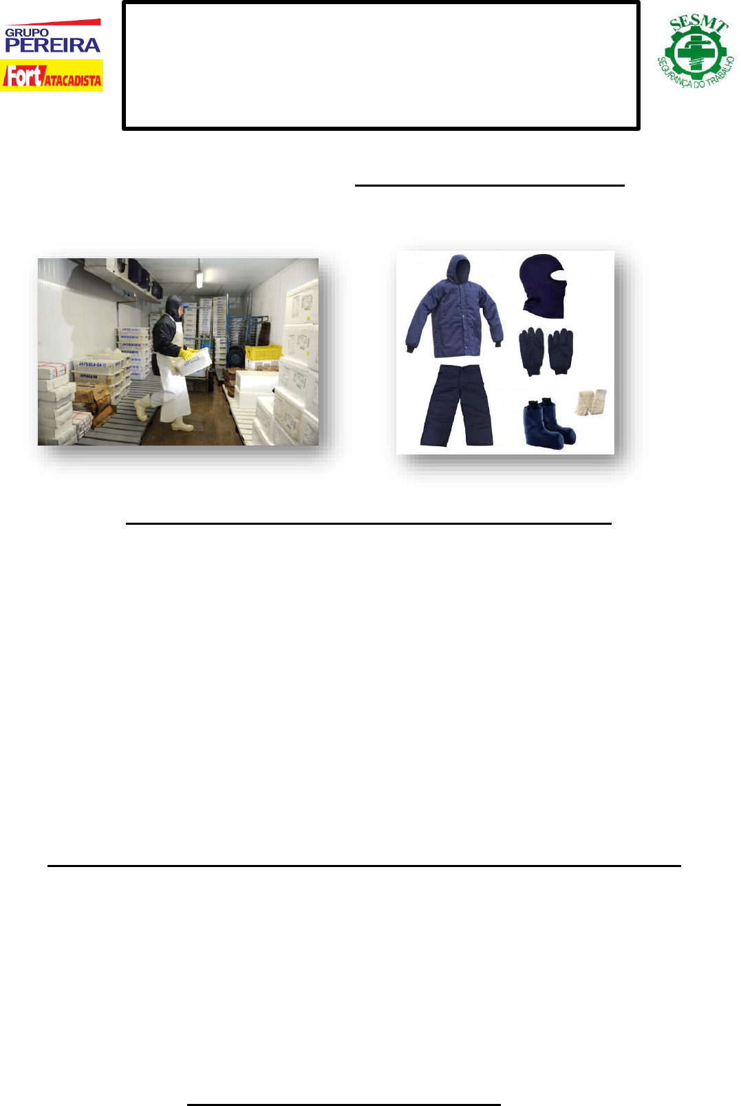 TREINAMENTO. TEMA: USO DOS EPI’S NA CÂMARA FRIA TREINAMENTO Declaro ter participado do Treinamento para ADENTRAR AS CÂMARAS FRIAS, bem como ratifico, através da assinatura abaixo, estar ciente sobre a importância de sua aplicabilidade. PROCEDIMENTOS PARA TRABALHAR NAS CÂMARAS FRIAS 1. Antes de entrar na câmara fria, coloque todos os Epi’s de proteção contra o frio (luva térmica, jaqueta térmica, calça térmica, botina térmica, meias térmicas e balaclava); 2. Preencher o documento de controle de tempo de exposição todas as vezes que solicitado ao entrar nas câmaras frias; 3. A cada 1 h e 40 min dentro da câmara fria, será feito repouso de 20 min; 4. De acordo com art. 253 da CLT, em relação ao frio. É considerada temperatura artificialmente fria, na grande Florianópolis, abaixo de 12°. Sendo assim, uso obrigatório de epi’s, inclusive na antecâmara; 5. Qualquer irregularidade dos Epi’s, comunicar imediatamente ao técnico de segurança. 6. Obrigatório o uso de luvas térmicas para manusear todos os produtos congelados existentes na loja; 7. Cada funcionário deverá levar seu Epi consigo mesmo durante a jornada de trabalho. Não podendo mais ser pendurada no cabide; 8. O funcionário que desrespeitar qualquer norma de segurança do trabalho, estará passível a punição. RESPONSABILIDADES DO FUNCIONÁRIO QUANTO AO USO DOS EPI’S (NR06) 1. Responsabilizar-se pela guarda e conservação; 2. Comunicar ao empregador qualquer alteração que o torne impróprio para uso; e, 3. Cumprir as determinações do empregador sobre o uso adequado. Lembre-se que sua colaboração é muito importante para evitar acidentes de trabalho por exposição ao frio e a segurança de todos depende da cada um! SESMT SERVIÇOS ESPECIALIZADOS DE ENGENHARIA DE SEGURANÇA E EM MEDICINA DO TRABALHO TREINAMENTO. TEMA: USO DOS EPI’S NA CÂMARA FRIA Data: Local: FORT ATACADISTA LOJA 379 Tempo/duração: Nº Loja MATRICULA NOME COMPLETO ASSINATURA 1 379 2 379 3 379 4 379 5 379 6 379 7 379 8 379 9 379 10 379 11 379 12 379 13 379