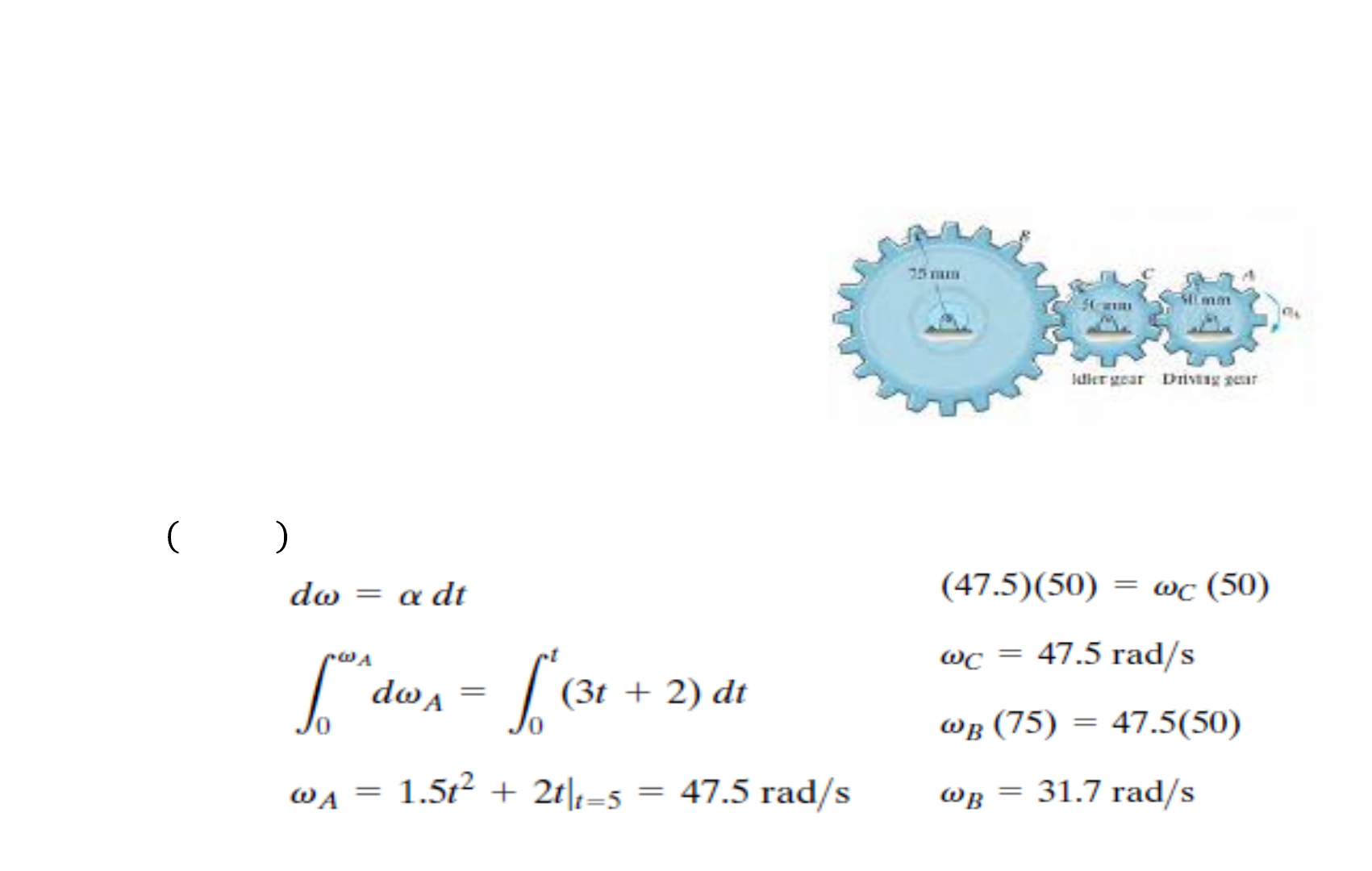 Quando apenas duas engrenagens estão engrenadas, a engrenagem motriz A e a engrenagem movida B sempre girarão em direções opostas. A fim de fazer com que elas girem na mesma direção, uma engrenagem intermediária C é usada. No caso mostrado, determine a velocidade angular da engrenagem B quando t = 5 s, se a engrenagem A parte do repouso e tem uma aceleração angular de 𝛼𝐴 = 3𝑡 + 2 𝑟𝑎𝑑/𝑠² , onde t é dado em segundos. Exemplo onde a aceleração angular é variável: Movimento plano geral, Velocidade absoluta e relativa Tema 7 Movimento plano geral • Pode ser sempre considerado como a soma de uma translação e de uma rotação. Considere, por exemplo, uma roda que rola sobre uma pista reta. Durante um certo intervalo de tempo, dois pontos dados, A e B, se moverão de A1 até A2 e de B1 até B2 respectivamente • Na figura o deslocamento das partículas A e B de uma placa pode ser dividido em duas partes: Translação - as partículas movem-se até A2 e B’1, com a linha AB mantendo a mesma direção; Rotação em torno de A - B move-se até B2, enquanto A permanece fixo. Movimento plano geral Velocidade absoluta e velocidade relativa A velocidade 𝑣 𝐴 corresponde à translação da placa junto com A, 𝑣 𝐵 é a velocidade absoluta de uma partícula B da placa, 𝑣 𝐵 𝐴 é a velocidade relativa associada à rotação da placa em torno de A . Velocidade absoluta e velocidade relativa • A velocidade absoluta 𝑣 𝐵 é obtida a partir da soma vetorial: 𝑣 𝐵 = 𝑣 𝐴 + 𝑣 𝐵 𝐴 • Representando por 𝑟 𝐵 𝐴 o vetor de posição de B relativo a A e por 𝜔𝑘 a velocidade angular da placa em relação aos eixos de orientação fixa, temos: Velocidade absoluta e velocidade relativa 𝑣 𝐵 𝐴 = 𝜔𝑘 × 𝑟 𝐵 𝐴 𝑣𝐵 𝐴 = 𝑟𝜔 Exemplo de aplicação Exemplo de aplicação a) Velocidade angular da engrenagem 𝑣𝐴 = 𝜔𝑟𝐴 → 1,2 = 𝜔. 0,15 → 𝜔 = 8 𝑟𝑎𝑑/𝑠 A engrenagem se desloca para a direita, logo ela gira no sentido horário. Pela regra da mão direita: 𝜔𝐴 = −(8 𝑟𝑎𝑑/𝑠)𝑘 Exemplo de aplicação b) As velocidades da cremalheira superior R e do ponto D da engrenagem 𝑣 𝑅 = 𝑣 𝐵 = 𝑣 𝐴 + 𝑣 𝐵 𝐴 = 𝑣 𝐴 + 𝜔𝑘 × 𝑟 𝐵 𝐴 𝑣 𝑅 = 1,2𝑖 − 8𝑘 × 0,1𝑗 = 1,2𝑖 + 0,8𝑖 = (2 𝑚/𝑠)𝑖 Exemplo de aplicação 𝑣 𝐷 = 𝑣 𝐴 + 𝑣 𝐷 𝐴 = 𝑣 𝐴 + 𝜔𝑘 × 𝑟 𝐷 𝐴 𝑣 𝐷 = 1,2𝑖 − 8𝑘 × (−0,15)𝑖 = (1,2 𝑚/𝑠)𝑖 + (1,2 𝑚/𝑠)𝑗 É um sistema de elementos unidos e organizados para transmitir movimento de maneira pré-determinada. A maioria dos mecanismos consiste não só de uma, mas de muitas partes móveis. Quando as diversas partes de um mecanismo estão conectadas por pinos, a análise do mecanismo pode ser efetuada considerando-se cada parte como um corpo rígido Movimento plano geral (mecanismos) Analisando o movimento de um mecanismo dado em uma translação junto com A e em uma rotação simultânea em torno de A. Movimento plano geral (mecanismos) 𝑣 𝐵 = 𝑣 𝐴 + 𝑣 𝐵 𝐴 Ou uma translação junto com B e em uma rotação simultânea em torno de B. Movimento plano geral (mecanismos) 𝑣 𝐴 = 𝑣 𝐵 + 𝑣 𝐴 𝐵 • Notamos que 𝑣 𝐴 𝐵 e 𝑣 𝐵 𝐴 têm a mesma intensidade, mas sentidos opostos. • O sentido da velocidade relativa depende do ponto de referência que tenha sido selecionado. Movimento plano geral (mecanismos) 𝑣 𝐵 = 𝑣 𝐴 + 𝑣 𝐵 𝐴 𝑣 𝐴 = 𝑣 𝐵 + 𝑣 𝐴 𝐵 Pequenas rodas estão fixadas nas extremidades das barras AB e giram livremente ao longo da superfície mostrada na figura. Sabendo que a roda A se desloca para a esquerda com velocidade constante de 1,5 m/s, determina (a) a velocidade da extremidade B da barra, (b) a velocidade angular da barra. Exemplo de aplicação Movimento plano Translação com A Rotação em torno de A Exemplo de aplicação a) a velocidade da extremidade B da barra 𝑣𝐵 𝑠𝑒𝑛 70° = 𝑣𝐵/𝐴 𝑠𝑒𝑛 60° = 1,5 𝑠𝑒𝑛 50° 𝑣𝐵 = 1,84 𝑚/𝑠 𝑣𝐵/𝐴 = 1,696 𝑚/𝑠 b) a velocidade angular da barra 𝑣𝐵 𝐴 = 𝐴𝐵 𝜔𝐴𝐵 1,696 = 0,75𝜔𝐴𝐵 𝜔𝐴𝐵 = 2,26 𝑟𝑎𝑑/𝑠