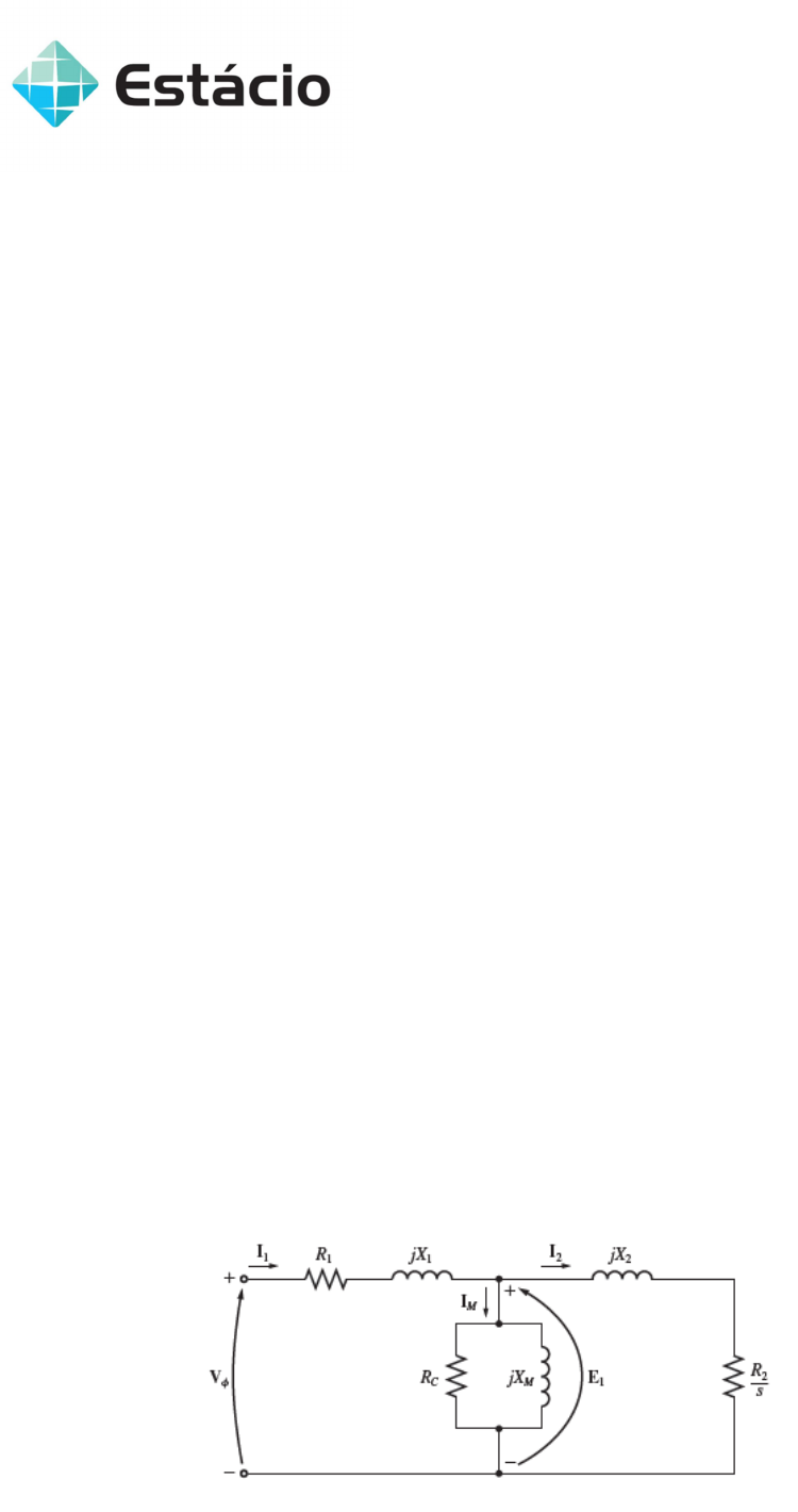 Universidade Estácio de Sá Nota AV2_____ Campos Praça XI Curso de Engenharia Conversão Eletromecânica de Energia – Prof. José Renato Cozzolino Aluno:_____________________________ Turma:________ Data:_______ Obs: A interpretação das questões faz parte da avaliação. Não é permitindo consulta nem empréstimo de material. Avaliação terá como base o desenvolvimento da questão independente resposta estar correta. Resposta final a caneta. Questão 1 – Uma turbina hidráulica conectada em Y aterrado, atende uma carga de 2400kVA com um fator de potência de 0,82 atrasado com uma tensão de 13.8 kV a 60 Hz. Este gerador possui uma reatância síncrona por fase de 1,5 Ohms e uma resistência de armadura 0,2 Ohms. Calcule a tensão interna do gerador: (2,5 pontos) Questão 2 – Um gerador síncrono de 15kV, 75 MVA e 60 Hz conectado em Y cuja reatância síncrona é de 2,8 Ohms e a resistência de armadura é de 0,4 Ohms. Este gerador atende uma carga que consome 60MW com fator de potência de unitário, sendo as perdas por atrito e ventilação de 1 MW e as perdas no núcleo são 1,5 MW. Calcule as perdas na armadura e o rendimento deste gerador: (2,5 pontos) Questão 3 – Um motor de indução de 220 V, oito polos, 60 Hz, ligado em Y possui potência nominal de 15kW. Possui uma impedância de armadura de 0,2 + j0,45Ohm e uma indutância de magnetização de j12Ohms, sendo a impedância equivalente medida do enrolamento do rotor sob a condição de eixo bloqueado igual a 0,05 + j0,4 Ohm. Calcule a potência e o Fator de potência quando este motor opera com um escorregamento igual a 3%. (3,0 pontos)