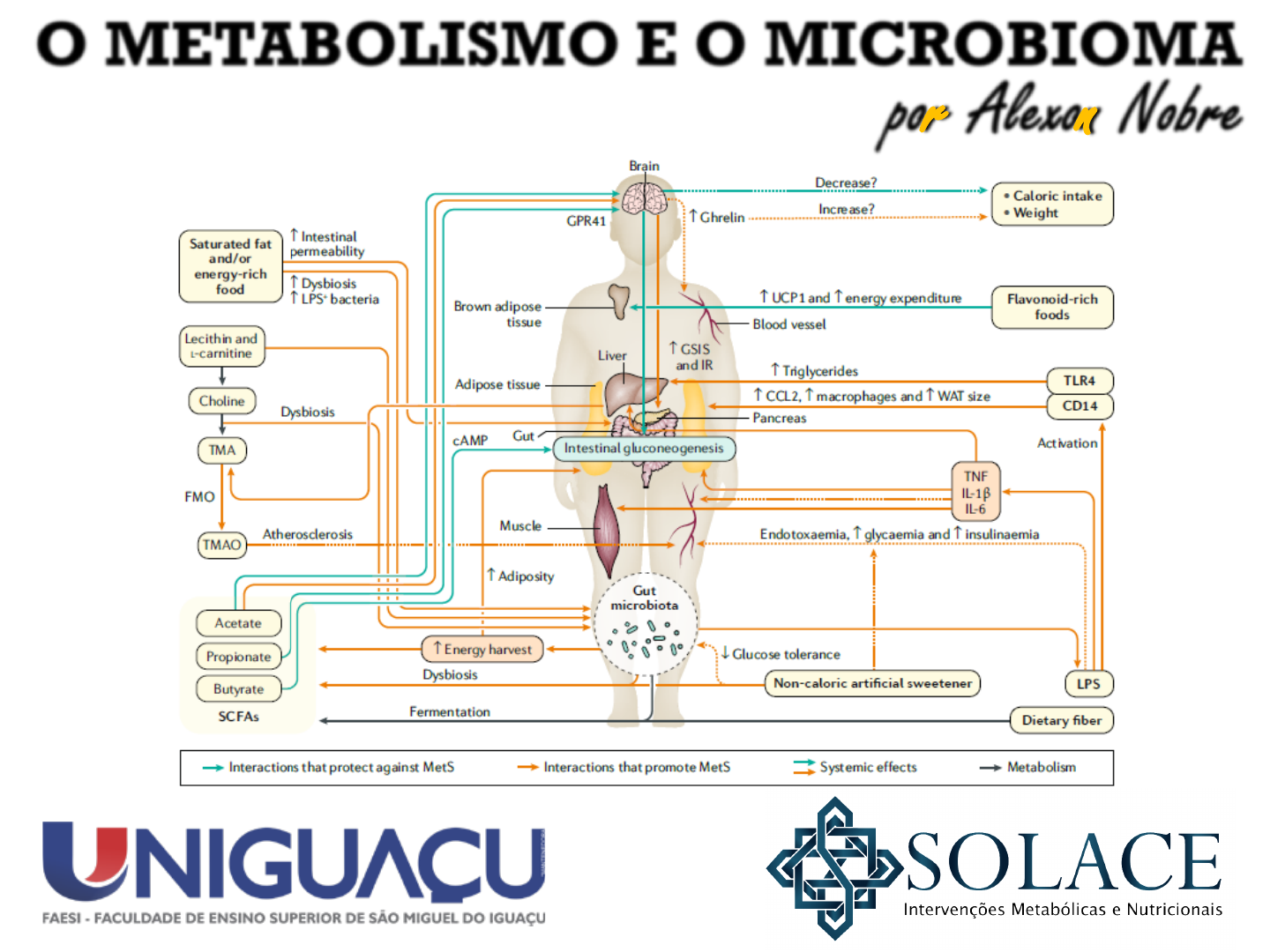 O METABOLISMO E O MICROBIOMA por Alexon Nobre Transporte TRANSCELULAR Transporte PARACELULAR Absorção de Nutrientes Transcitose de Antígenos Produção de Neurotransmissores Produção de Peptídeos Antimicrobianos Produção de Muco Lactobacillus Acidophillus Staphylococcus Aureus Akkermansia Muciniphila Escherichia Coli Indívíduo pesando 175 kgs e com IMC de 58.8 kg/m² possuia 35% de sua Microbiota Intestinal composta pela bactéria Enterobacter Clocae, taxa essa que caiu para 0% após 23 semanas de um protocolo dietético conhecido como WTP, que fez o paciente eliminar 51.4kgs. Indívíduo pesando 175 kgs e com IMC de 58.8 kg/m² possuia 35% de sua Microbiota Intestinal composta pela bactéria Enterobacter Clocae, taxa essa que caiu para 0% após 23 semanas de um protocolo dietético conhecido como WTP, que fez o paciente eliminar 51.4kgs. -Crianças de Burkina Faso consomem centenas de calorias a menos do que as Européias, mas expressam Taxas de Crescimento semelhantes. Isto ocorre por elas possuírem abundância única das espécies Prevotella e Xylanibacter, que possibilitam a digestão de celulose e xilano, aumentando assim a extração de energia a partir de polissacarídeos de vegetais como Sorgo e Painço/Milho Miúdo. -Diferentes microbiomas fornecem diferentes aportes calóricos a indivíduos COM A MESMA DIETA E MESMO BALANÇO ENERGÉTICO. Isto ocorreu por diferenças na liberação de ácidos graxos de cadeia curta, onde maiores concentrações chegavam à corrente sanguínea e eram responsáveis por sinalizar diversos processos que levam ao ganho de peso, como gliconeogênese e lipogênese. O apetite e o aporte calórico são regulados pelo Núcleo do Trato Solitário (NTS) e pelo Hipotálamo. Este segundo “detecta” nutrientes e hormônios presentes na corrente sanguínea e no Flúido Cerebro-Espinhal. O núcleo arqueado (ARC) presente no hipotálamo regula a ingesta ao secretar peptídeos com diferentes ações: Neurônios que expressam POMC e CART: Liberam peptídeos com ação ANOREXÍGENA; redução de Apetite. Neurônios que expressam NPY e AgRP: Liberam peptideos com ação OREXÍGENA; aumento de apetite. -TANTO O NÚCLEO DO TRATO SOLITÁRIO (NTS) QUANTO O NÚCLEO ARQUEADO (ARC) EXPRESSAM RECEPTORES PARA HORMÔNIOS LIBERADOS PELO INTESTINO, COMO O GLP-1, PYY, GRELINA E COLECISTOQUININA. - O EFEITO SACIETÓGENO DAS FIBRAS NÃO SE DÁ PELO SEU “ESTUFAMENTO”, MAS SIM PELO SEU ESTÍMULO À SINTESE DE ÁCIDOS GRAXOS DE CADEIA CURTA RESPONSÁVEIS POR SINALIZAR A LIBERAÇÃO DE GLP-1 E PYY. -AGCC ao serem reconhecidos pelos receptores GPR41 e GPR43 estimulam a liberação dos peps GLP-1 e PYY, que sinalizam SACIEDADE. -Acetato derivado dos colonócitos de roedores atravessa a barreira hemato-encefálica e chega ao hipotálamo, o que aumenta a produção de lactato e GABA, suprimindo o apetite. -AGCC estimulam a secreção de leptina no Tecido Adiposo Branco, além do butirato promover o amarromzamento destes, aumentando o gasto calórico. Exemplo Histológico de uma “CROWN-LIKE STRUCTURE” Roedores knockout para um dos genes responsáveis pela produção de IgA apresentam perturbações na microbiota intestinal, onde a classe Clostridia fica depletada em detrimento a um crescimento desordenado de Desulfovibrio. A classe Clostridia é capaz de prevenir o ganho de peso por diminuir a captação de gordura ao bloquear a expressão do gene CD36. Ratos com depleção de Clostridiums apresentam um ganho de peso muito desproporcional mesmo com dieta igual. Roedores knockout para um dos genes responsáveis pela produção de IgA apresentam perturbações na microbiota intestinal, onde a classe Clostridia fica depletada em detrimento a um crescimento desordenado de Desulfovibrio. A classe Clostridia é capaz de prevenir o ganho de peso por diminuir a captação de gordura ao bloquear a expressão do gene CD36. Ratos com depleção de Clostridiums apresentam um ganho de peso muito desproporcional mesmo com dieta igual. CITOCINAS COMO IL-1B, IL-6 e TNF-alfa ativam SERINA KINASES -Inibição das liases bacterianas responsáveis pela conversão de colina e carnitina em TMA impediu o progresso de aterosclerose em modelos in vitro. -A substância responsável por isso, DMB (DimetilButanol), é encontrada em uvas e azeite de oliva. Bacteroides thetaiotaomicron: Promove a diferenciação de Células de Gobblet e a expressão de genes relacionados à produção de mucina. Faecalibacterium prausnitzii: Produz butirato e consome o acetato que em excesso levaria à uma sobre- produção de muco. A Beta Oxidação de Butirato pelos colonócitos consome OXIGÊNIO, o que mantém o ambiente favorável à espécies anaeróbicas benéficas que ajudam a controlar proteobactérias patogênicas como ESCHERICHIA COLI e SALMONELLA ENTERICA. alexon.nobre clinica.solace