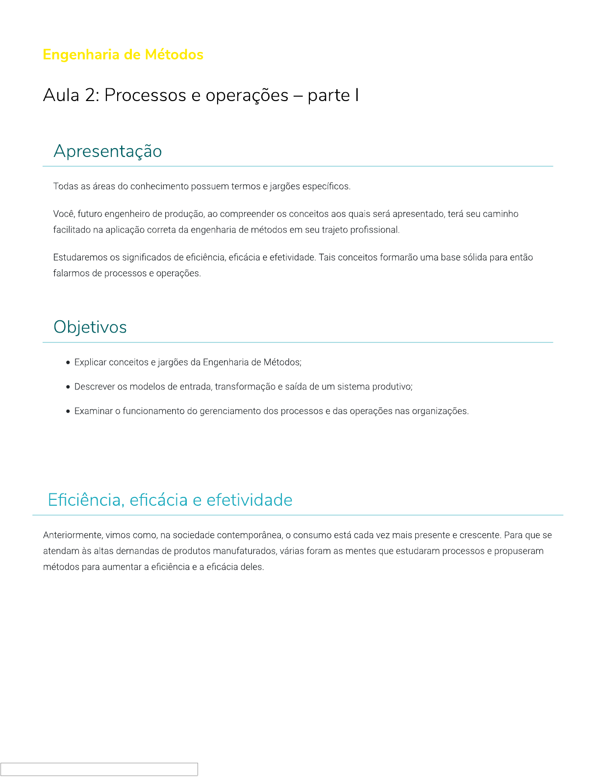Loading [MathJax]/jax/output/HTML-CSS/fonts/TeX/fontdata.js "Efetividade é uma medida de desempenho utilizada em alguns contextos, especialmente na administração pública, como sinônimo de impacto." - Maximiano, 2018. Loading [MathJax]/jax/output/HTML-CSS/fonts/TeX/fontdata.js Figura 2 – Eficiência, eficácia e efetividade. Fonte: (MAXIMIANO, 2018). Loading [MathJax]/jax/output/HTML-CSS/fonts/TeX/fontdata.js Fonte: Shutterstock Atenção! Aqui existe uma videoaula, acesso pelo conteúdo online Loading [MathJax]/jax/output/HTML-CSS/fonts/TeX/fontdata.js Figura 3 – Todas as operações são processos de input – transformação – output. Fonte: (SLACK; BRANDON-JONES; JOHNSTON, 2018). Loading [MathJax]/jax/output/HTML-CSS/fonts/TeX/fontdata.js Loading [MathJax]/jax/output/HTML-CSS/fonts/TeX/fontdata.js Atenção! Aqui existe uma videoaula, acesso pelo conteúdo online Loading [MathJax]/jax/output/HTML-CSS/fonts/TeX/fontdata.js Loading [MathJax]/jax/output/HTML-CSS/fonts/TeX/fontdata.js a) Processamento: é a etapa em que os meios produtivos são empregados para a transformação das entradas (inputs) em saídas (outputs). b) Recursos transformadores: são aqueles que serão convertidos pelo processo produtivo, como as matérias-primas, as informações ou até mesmo os consumidores (clientes). c) Saídas (outputs): dependendo do tipo de atividade comercial praticada pela empresa, podem ser constituídas apenas por produtos, apenas por serviços ou pelos dois (produtos e serviços). d) Entradas (inputs): são os recursos necessários para o suprimento do processo produtivo. Dividem-se em dois tipos de recursos (recursos transformadores e recursos a serem transformados). a) É correta apenas a afirmativa 1. b) É correta apenas a afirmativa 3. c) São corretas apenas as afirmativas 1 e 2. d) São corretas apenas as afirmativas 2 e 3. e) São corretas as afirmativas 1, 2 e 3. Loading [MathJax]/jax/output/HTML-CSS/fonts/TeX/fontdata.js Loading [MathJax]/jax/output/HTML-CSS/fonts/TeX/fontdata.js Figura 4 – Modelo de rede de operações de uma fábrica de suporte para instrumentos musicais. Fonte: Elaborada pelo autor. Loading [MathJax]/jax/output/HTML-CSS/fonts/TeX/fontdata.js Figura 5 – Mapeamento de processo. Fonte: (SLACK; BRANDON-JONES; JOHNSTON, 2018). Loading [MathJax]/jax/output/HTML-CSS/fonts/TeX/fontdata.js Figura 6 – Fluxograma do processo de entrega de um lanche pedido por meio de um aplicativo. Fonte: Elaborada pelo autor. Atenção! Aqui existe uma videoaula, acesso pelo conteúdo online Loading [MathJax]/jax/output/HTML-CSS/fonts/TeX/fontdata.js Figura 7 – Mapeamento de processo. Fonte: (Adaptada de SLACK; BRANDON-JONES; JOHNSTON, 2018). Clique nos botões para ver as informações. Loading [MathJax]/jax/output/HTML-CSS/fonts/TeX/fontdata.js Figura 10 – Transporte de produtos por meio de empilhadeira. Loading [MathJax]/jax/output/HTML-CSS/fonts/TeX/fontdata.js Figura 12 – Espera (de documento). Loading [MathJax]/jax/output/HTML-CSS/fonts/TeX/fontdata.js Figura 13 – Estocagem. Loading [MathJax]/jax/output/HTML-CSS/fonts/TeX/fontdata.js a) Ênfase na melhoria da forma pela qual o trabalho é realizado e priorização das atividades sequenciais. b) Reavaliação anual do negócio e de suas atividades. c) Visão verticalizada da organização. d) Visão geral dos procedimentos sem o detalhamento de cada etapa, a fim de viabilizar uma análise sistêmica. e) Análise das problemáticas relativas à eficiência e à eficácia dos produtos e dos serviços por departamento. a) O mapeamento de processos provê informação necessária para que gestores tomem decisões corretas sobre a alocação de recursos em suas operações de negócio, de forma a atingir os objetivos estabelecidos pela organização. b) A representação simplificada de um processo de negócio, seja ele existente ou proposto, é o produto da modelagem de processos. c) Em ambientes competitivos e de incerteza, as organizações modelam seus processos visando otimizá-los por meio da situação proposta, pois a situação atual já se mostra insuficiente, devendo ser descartada pelo gestor de processos. d) A gestão de processos de negócio representa um conjunto de iniciativas que implicam projetos ou ações de melhoria no redesenho ou ajuste de processos, tais como Seis Sigma e Lean. Loading [MathJax]/jax/output/HTML-CSS/fonts/TeX/fontdata.js Loading [MathJax]/jax/output/HTML-CSS/fonts/TeX/fontdata.js