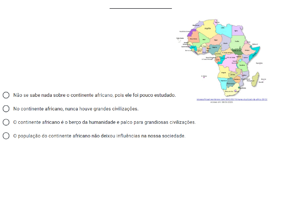 NOME:_______________________________________________________________ TURMA:________________________________________DATA:_________________ 6º ANO HISTÓRIA - PET 03 – SEMANA1,2,3,4 ATIVIDADES COMPLEMENTARES 04 E 05 PROFESSORA: Vanessa Pereira Silva - Outubro de 2020 HABILIDADES: (EF06HI07X) Identificar aspectos e formas de registro das sociedades antigas na África, Ásia, no Oriente Médio e nas Américas, distinguindo alguns significados presentes na cultura material e imaterial na tradição oral dessas sociedade. (EF06HI08) Identificar os espaços territoriais ocupados e os aportes culturais, científicos, sociais e econômicos dos astecas, maias, incas e dos povos indígenas de diversas regiões brasileiras. PET 03 - SEMANA 01 QUESTÃO 01 - Todos nós sabemos que o continente africano protagonizou o surgimento da humanidade. Lá foram encontrados os fósseis mais antigos do planeta e todas as pesquisas apontam para lá como o lugar onde tudo começou. Para além da origem da humanidade, a África também foi palco da construção de grandes civilizações. Em seguida, marque a alternativa que responda corretamente a seguinte questão: a) O que você sabe a respeito do continente africano? (Uma resposta correta) QUESTÃO 01.1 -Repare na Imagem ao lado. Observe que o Egito Antigo era composto por desertos e que em sua geografia ganha destaque o Nilo, que é o rio mais extenso do mundo. No contexto do Egito Antigo, qual seria a importância do rio Nilo e das comunidades se desenvolverem em volta dele? (Uma resposta correta) QUESTÃO 02 - A sociedade do Egito Antigo era organizada em classes de pessoas que se agrupavam de acordo com a função que desempenhavam. Abaixo, temos uma pirâmide com a representação social de cada grupo. Relacione as colunas e preencha os parênteses com a letra de cada classe social. (Uma resposta correta para cada linha) FUNÇÃO NA SOCIEDADE EGÍPCIA ( ) - Responsáveis pela arte egípcia, nas paredes dos palácios e pirâmides, vasos de cerâmicas, jóias e esculturas. ( ) - Era considerado o representante de deus na terra, tinha poder absoluto sobre o Egito Antigo. ( ) - Maior parte da população egípcia, sustentavam a sociedade com sua mão-de-obra, na agricultura, obras públicas e outros serviços. ( ) - Responsáveis por vender as mercadorias dos egípcios, assim como trazer produtos que egípcios não tinham ( ) - Sabiam ler e escrever, eram responsáveis pela contabilidade e registros importantes sobre o reinado do Faraó. ( ) - Responsável por proteger e enfrentar guerras em nome no Faraó. ( ) - Davam conselhos ao Faraó, ficavam com parte dos impostos cobrados, eram responsáveis pela religião e seus costumes. CLASSE SOCIAL A – FARAÓ B - OFICIAIS, NOBRES E SACERDOTES. C – EXÉRCITO D – ESCRIBAS E – COMERCIANTES F - ARTESÃOS G - CAMPONESES E ESCRAVOS. QUESTÃO 03 - A religião na sociedade egípcia era politeísta, ou seja, eles acreditavam em vários deuses. Existia o deus do Sol, da Agricultura, dos Mortos, entre tantos outros. Cada cidade-Estado do Egito Antigo tinha o seu deus protetor. Pesquise no livro didático ou na internet e, em seguida, preencha a tabela listando quais eram os principais deuses do Antigo Egito e sua função dentro da sociedade. (Uma resposta correta para cada linha) PET 03 - SEMANA 02 PARA RESPONDER AS QUESTÕES 01, 01,1 E 01.2, OBSERVE A IMAGEM E A LEGENDA ABAIXO. Nota de venda de um escravizado do sexo masculino e um edifício em Xurupaque, tabuleta suméria, c. 2 600 a.C.. Disponível em: https://pt.wikipedia.org/wiki/Sum%C3%A9ria. Acesso em: 08/06/2020. QUESTÃO 01 - Agora, marque a resposta correta sobre as seguintes questões: Quem eram os escribas e qual o seu papel na sociedade da Mesopotâmia? (Uma resposta correta) QUESTÃO 01.1 - Como se chamava a escrita criada pelos sumérios e como era feita? (Uma resposta correta). QUESTÃO 01.2 - Que tipo de registro está contido na imagem? Qual a importância, para os povos sumérios, do registro por meio da escrita? (Duas respostas corretas) QUESTÃO 02 - Durante o Império Babilônico, logo após a unificação da Mesopotâmia, o imperador Hamurabi ganhou destaque por ter criado um dos primeiros códigos de lei: o Código de Hamurabi. Esse código era composto por centenas de leis, muitas delas baseadas em costumes dos povos sumérios e também em códigos anteriores ao reinado do imperador babilônico. Observe a imagem e marque as alternativas referentes a ela. (Mais de uma resposta correta) QUESTÃO 02.1 - Ainda sobre o Código de Hamurábi, marque as alternativas que respondem corretamente as seguintes questões: Por que o Código de Hamurabi foi tão importante para o sucesso do governo de Hamurabi? O Código de Hamurabi também ficou conhecido por integrar a Lei de Talião, conhecida pela expressão “olho por olho, dente por dente”. O que quer dizer essa expressão? (Mais de uma resposta correta) QUESTÃO 02.3 - Qual a importância de um Código de Leis? Nos dias atuais, qual é o nosso mais importante Código de Leis? ( Uma resposta correta) QUESTÃO 02.4 - Nos dias atuais, as leis funcionam segundo a Lei de Talião? (Uma resposta correta). QUESTÃO 03 - Para além da questão religiosa, os mesopotâmicos fizeram grandes inovações na arquitetura e na escultura, adorando o uso de arcos e os baixos-relevos. Pesquise no livro didático ou na internet MARQUE COM X as principais descobertas dos mesopotâmicos nas áreas listadas abaixo: (Uma resposta correta por linha) INOVAÇÕES ASTRONOMIA MATEMÁTICA ESCRITA Através da observação dos astros, conseguiram dividiram o ano em meses, os meses em semanas, as semanas em sete dias, os dias em vinte e quatro horas, as horas em sessenta minutos e os minutos em sessenta segundos. Grande realização sumeriana, usada pelos assírios, hebreus e persas, surgiu ligada às necessidades de contabilização dos templos. As necessidades do dia-a dia levaram a um certo desenvolvimento da matemática. Os m