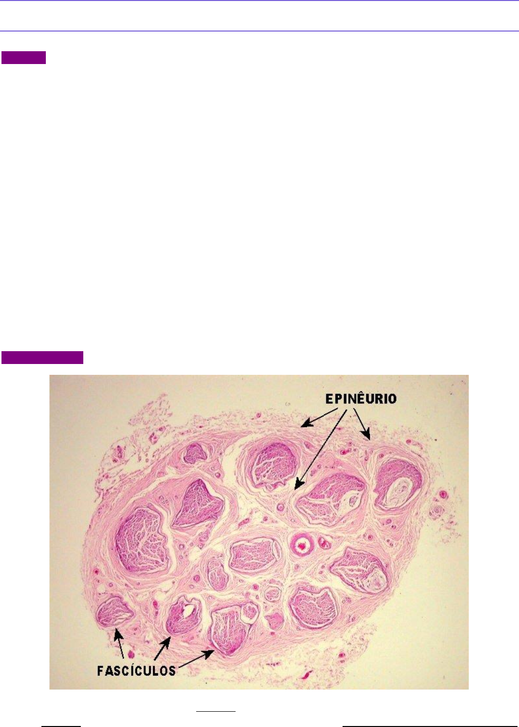 Laura Vieira Gomes de Oliveira – Medicina UNIFG H I S T O L O G I A – N E R V O S Vídeo aula o Nervo – dividido em fascículos e feixes nervosos o Denso não modelado e frouxo = epineuro = reveste externamente mas da suporte/separa os fasciculos o A função do perineuro é separar do interior do fasciculo – onde estão os axonios – do restante do meio ambiente. Isto permite manutenção de condições ionias ideias para a transmição nervosa // Ponto roxo internos = bainha de mielina (formada por gordura) o Em roxo = células de Schawn o Tricrômio de mason = coloração tradicional para tecido conjuntivo (presta-se ao estudo dos nervos pois permite distinguir o colágeno em azul das bainhas de mielina em vermelho, com os núcleos em roxo, os componentes conjuntivos de epinêuro, perinêuro e endonêuro se destacam em azul. o Vermelho = citoplasma fuxina acida Roxo = nucelo hemotocilina Azul = anil fibras colágenas o Local esbranquiçado = concentração de fibras nervosas sem bainha de mielina = nó de ranvier (estrangulamento sem a presença da bainha de mielina) o Coloração por NF = em aumentos fortes, os axônios aparecem com cotorno levemente irregular ou sinuoso, devido (especifico para marcar neurofilamentos em doenças como tumores) Material – unicamp Um nervo periférico é composto por fascículos separados e envolvidos por tecido conjuntivo colágeno, chamado epinêurio. Notar que o epinêurio não somente envolve o nervo por fora. Todas as traves fibrosas entre os fascículos Laura Vieira Gomes de Oliveira – Medicina UNIFG são também epinêurio. Cada fascículo é envolto por uma camada de células especializadas, o perinêurio, e contém axônios mielínicos e amielínicos em meio a tecido conjuntivo frouxo, o endonêurio. O perinêurio é formado por camadas de células pavimentosas, intimamente unidas entre si, constituindo uma barreira que isola o endonêurio e os axônios. A espessura do perinêurio, ou seja, o número de camadas celulares é proporcional ao diâmetro do fascículo. O endonêurio é constituído por fibras colágenas arranjadas longitudinalmente, sintetizadas por fibroblastos do endonêurio. Em meio a elas são observados os axônios mielínicos de vários diâmetros. (Os axônios amielínicos não são visíveis em HE por serem muito finos. São estudados só com microscopia eletrônica). Nos axônios maiores é possível distinguir um ponto central mais denso, que é o axônio propriamente dito, e um anel róseo frouxo em volta, que é a baínha de mielina. As estruturas como mostradas aqui estão alteradas pelos artefatos inevitáveis na inclusão em parafina. Os axônios sofrem retração e adensamento. A mielina esgarça-se dando aspecto finamente reticulado. Em cortes longitudinais podem ser notados nodos de Ranvier, os pontos de encontro entre a mielina sintetizada por duas Laura Vieira Gomes de Oliveira – Medicina UNIFG células de Schwann contíguas (cada gomo de mielina é chamado um internodo). Os núcleos das células de Schwann ficam junto à face externa da mielina. Nesta técnica, a arquitetura geral do nervo é observada em mais detalhe, e recomenda-se objetiva de imersão. Notar as camadas do perinêurio, com seus núcleos alongados. Os axônios mielínicos aparecem como pequenas argolas azuis, que são as baínhas de mielina. O axônio em si é a parte central mais clara. Praticamente não há retração, e o aspecto é mais fiel à realidade in vivo. As rugas que se formam no corte de araldite durante a coloração a quente são um artefato. MICROSCOPIA ELETRÔNICA Material – Junqueira NERVOS Laura Vieira Gomes de Oliveira – Medicina UNIFG Os feixes de fibras nervosas que constituem os nervos são formados por axônios, cada um envolvido por uma sequência de células de Schwann revestidas por uma lâmina basal (ver Figuras 9.30 e 9.32). Devido ao seu conteúdo em mielina e colágeno, os nervos são, macroscopicamente, em geral esbranquiçados. ❖ Organização dos nervos Nos nervos calibrosos as fibras nervosas estão divididas em feixes de diferentes espessuras, separados por lâminas de tecido conjuntivo (ver Figura 9.32). Nervos mais delgados, por outro lado, são constituídos somente por um feixe. Os nervos calibrosos são externamente revestidos por uma faixa de tecido conjuntivo, chamada de epineuro, cuja porção mais superficial (oposta ao nervo) em geral se continua com o tecido conjuntivo das estruturas vizinhas (ver Figura 9.32). Nervos delgados, geralmente posicionados no interior de órgãos, são revestidos pelo tecido conjuntivo que forma o estroma do órgão, isto é, não têm revestimento próprio. O feixe único ou o conjunto de feixes de fibras nervosas de um nervo são diretamente envolvidos por uma delgada bainha chamada perineuro (ver Figura 9.32). Este é formado por algumas camadas de células alongadas que se unem por junções oclusivas, constituindo uma barreira à passagem de macromoléculas e sendo também importante mecanismo de defesa contra agentes agressivos. O epineuro pode se continuar para o interior de nervos muito espessos, separando feixes menores, cada qual com seu perineuro próprio. Entre as fibras nervosas individuais, há uma delicada camada de tecido conjuntivo constituída principalmente por fibras reticulares sintetizadas pelas células de Schwann, chamada endoneuro (ver Figura 9.32). https://jigsaw.minhabiblioteca.com.br/books/9788527732178/epub/OEBPS/Text/cap-09.xhtml#fig9-30 https://jigsaw.minhabiblioteca.com.br/books/9788527732178/epub/OEBPS/Text/cap-09.xhtml#fig9-32 https://jigsaw.minhabiblioteca.com.br/books/9788527732178/epub/OEBPS/Text/cap-09.xhtml#fig9-32 https://jigsaw.minhabiblioteca.com.br/books/9788527732178/epub/OEBPS/Text/cap-09.xhtml#fig9-32 https://jigsaw.minhabiblioteca.com.br/books/9788527732178/epub/OEBPS/Text/cap-09.xhtml#fig9-32 https://jigsaw.minhabiblioteca.com.br/books/9788527732178/epub/OEBPS/Text/cap-09.xhtml#fig9-32 Laura Vieira G
