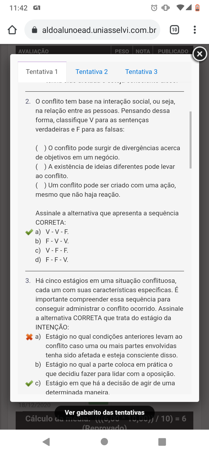 conflito tem base na interação social, ou seja, na relação entre as pessoas. Pensando dessa forma, classifique V para as sentenças verdadeiras e F para as falsas: ( ) conflito pode surgir de divergências acerca de objetivos em um negócio. ( ) A existência de ideias diferentes pode levar ao conflito. ( ) Um conflito pode ser criado com uma ação, mesmo que não haja reação. Assinale a alternativa que apresenta a sequência CORRETA: a) V - V - F. b) F V V. c) V - F F. d) F - F V.