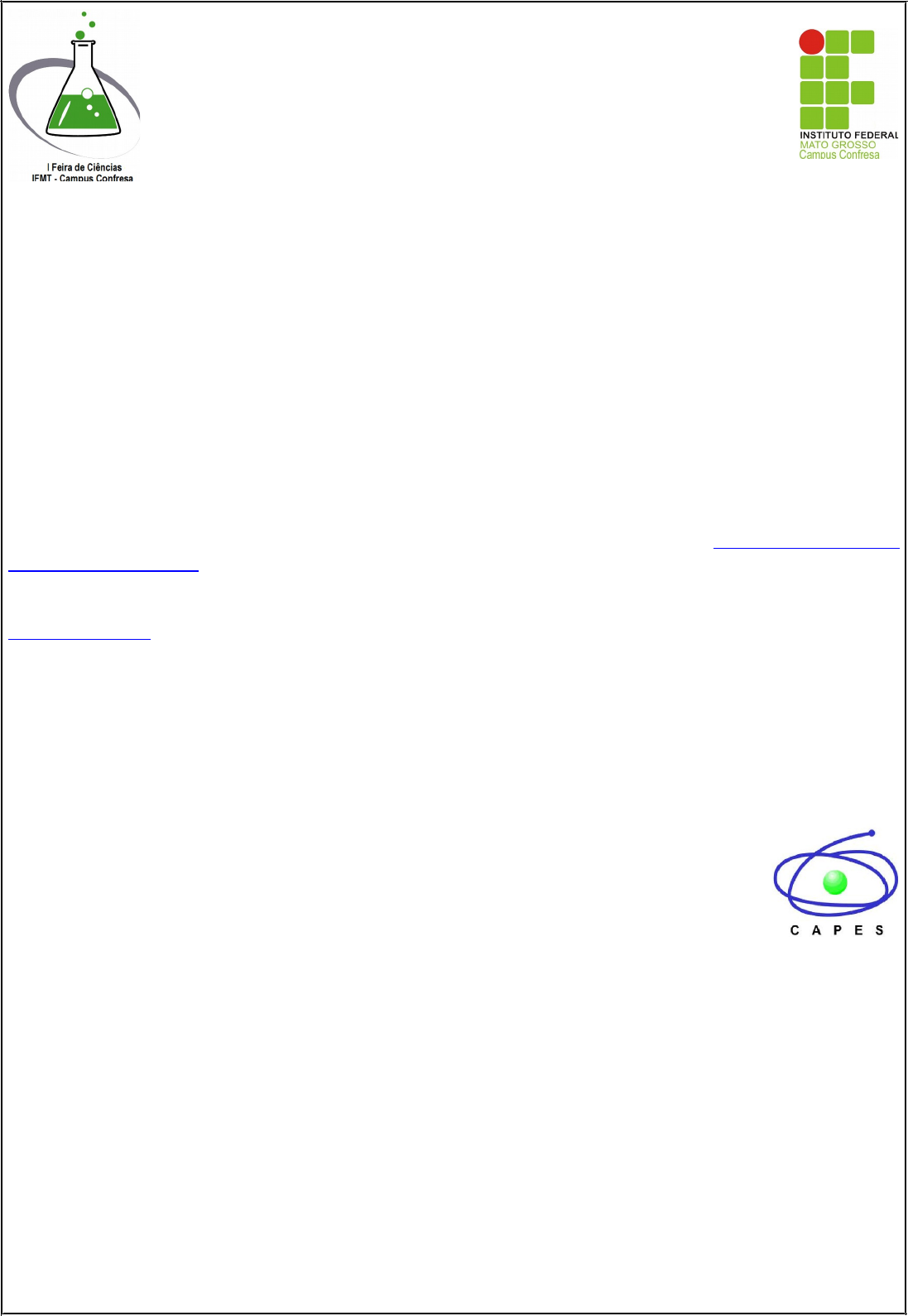 I FEIRA DE CIÊNCIAS DO INSTITUTO FEDERAL DE EDUCAÇÃO, CIÊNCIA E TECNOLOGIA DE MATO GROSSO CAMPUS CONFRESA Aplicação dos conhecimentos de ciências dos professores de educação básica no contexto escolar TÍTULO (Arial Narrow 12, centralizado no espaçamento simples) Nome e Sobrenome do(s) autor(es)(1); (Arial Narrow tamanho 12, centralizado no espaçamento simples) (1)Institutição ou Escola / e-mail (Arial Narrow tamanho 10, justificado no espaçamento simples) Eixo temático: (Arial Narrow tamanho 12, justificado no espaçamento simples) RESUMO Este modelo de resumo simples devidamente readequado deve ser enviado até a data 10/05/2013 à Comissão Científica do evento por meio do e-mail andre.silva@cfs.ifmt.edu.br. Os autores devem atentar para as orientações seguintes: o resumo simples deve conter um único parágrafo com no máximo 400 palavras (fonte Times New Roman - tamanho 12 - espaço simples). Deve constar o objeto de pesquisa e sua justificativa, os objetivos, a metodologia, os resultados da pesquisa. O idioma oficial do simpósio será o português. Para cada resumo simples deverão ser confeccionados pôster. Esses serão de responsabilidade dos próprios autores de acordo com o modelo disponível no site IFMT – Campus Confresa. A publicação dos resumos simples aprovados será no dia 27 de Junho de 2013 nos Anais do evento. A Comissão Científica não se responsabiliza por revisões ortográficas, portanto faça uma minuciosa revisão gramatical. Para submissão dos resumos simples será necessário fazer previamente a inscrição no evento pelo site www.cfs.ifmt.edu.br. A Comissão Organizadora do I Feira de Ciências do Instituto Federal de Educação, Ciência e Tecnologia de Mato Grosso - Campus Confresa terá autonomia de selecionar os resumos simples pertinentes em qualidade de produção acadêmica. O horário das apresentações será disponibilizado no site posterior a aprocação dos resumos simples. Os eixos temáticos são: agronomia, alimentos, física, geografia, matemática, meio ambiente, português, química e sociologia. Palavras - chave: No; Máximo; Quatro; Palavras. Apoio
