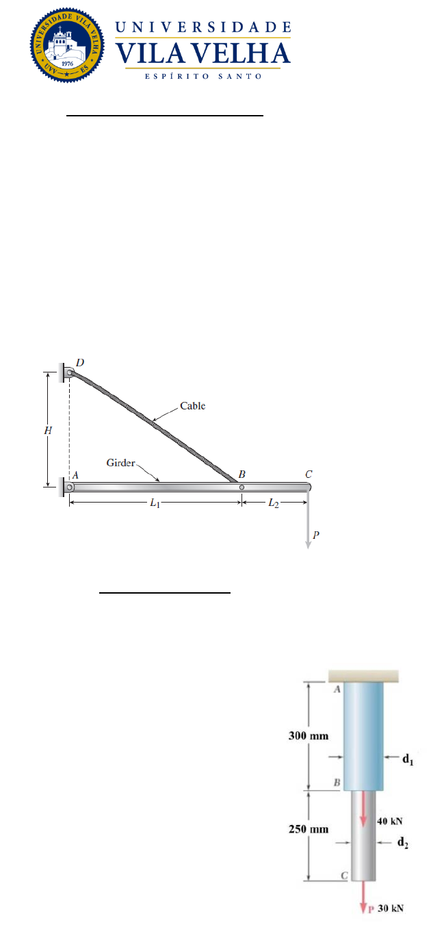 CAPÍTULO 2 – DEFORMAÇÃO 1. Um fio de nylon está submetido à força de tração de 58,5 N. Sabendo que E = 3,3 GPa e que o comprimento do fio é incrementado em 1,1%. Determine: a) O diâmetro do fio. b) A tensão no fio. 2. Um guindaste de carregamento formado por uma viga ABC sustentada por um cabo BD é submetido à carga P. O cabo tem uma área de seção transversal efetiva A = 481 mm2. As dimensões do guindaste são H = 1,6 m, L1 = 3,0 m e L 2 = 1,5 m. a) Se a carga P = 32 kN, qual é o valor da tensão média do cabo? b) Se o cabo sofrer um estiramento de 5,1 mm, qual é a deformação média? Capítulo 1 – TENSÃO 3. Duas barras cilíndricas cheias AB e BC são soldadas uma à outra em B e submetidas a um carregamento conforme mostra a figura. Sabendo que d1 = 50 mm e d2 = 30 mm, calcule a tensão normal no ponto médio: a) Da barra AB. Valor: (1,25) pontos. b) Da barra BC. Valor: (1,25) pontos. 4. A junta está submetida à força de 6000 N do elemento axial. Determinar a tensão normal média que atua nas seções AB e BC. Supor que o elemento é plano e tem 1,5 m de espessura. 5. As hastes AB e CD são feitas de aço cuja tensão de ruptura por tração é ζ rup = 510 MPa. Usando um fator de segurança FS = 1,75 para tração, determine o menor diâmetro das hastes de modo que elas possam suportar a carga mostrada. Considere que a viga está acoplada por pinos em A e C. Capítulo 5 – TORQUE 6. Quatro engrenagens presas a um eixo circular transmitem os torques ilustrados na figura abaixo. a) A tensão de cisalhamento admissível no eixo é de 70 MPa. b) Qual é o diâmetro exigido d do eixo se ele tem uma seção transversal circular maciça? 7. A barra de alumínio AB com módulo de cisalhamento do aço de 27 GPa está ligada a barra de latão BD com módulo de cisalhamento igual a 39 GPa. Sabendo que a parte CD da barra é vazada e tem um diâmetro interno de 40 mm. Determine o ângulo de torção em A. 8. Um eixo escalonado ABCD consistindo de segmentos circulares sólidos está submetido a três torques, como ilustrado na figura. Os torques tem magnitudes 3000,0 N.m, 2000,0 N.m, 800,0 N.m. O comprimento de cada segmento é 0,5 m e os diâmetros dos segmentos são 80 mm, 60 mm e 40 mm. O material é feito em aço com módulo de elasticidade de cisalhamento G = 80 GPa. Determine: a) A máxima tensão de cisalhamento τmax no eixo. b) O ângulo de Torção ΦD. CAPÍTULO 3 – PROPRIEDADES MECÂNICAS 9. A viga é sustentada por um pino em C e por um cabo de ancoragem AB de aço A-36. Se o cabo tiver diâmetro de 5 mm, determine quanto ele estica quando um carregamento distribuído w = 1,5 kN/m agir sobre o tubo. O material permanece elástico. 10. A haste plástica de acrílico tem 200 mm de comprimento e 15 m de diâmetro. Se uma carga axial de 300 N for aplicada a ela, determine a mudança em seu comprimento e em seu diâmetro. Ep = 2,70 GPa, ν = 0,4. 11. Em um ensaio de tração padrão, uma barra de alumínio de 20 mm de diâmetro está submetida a uma força de tração de P = 30 kN. Sabendo que ν= 0,35 e E = 70 GPa, Determine: a) O alongamento da barra em um comprimento de referência de 150 mm. b) A variação no diâmetro da barra. FORMULÁRIO ∈ = 𝛿 𝐿 ∈ = ∆𝑆′ − ∆𝑆 ∆𝑆 ∆𝑆′ = (1+ ∈). ∆𝑆 𝛾 = 𝜋 2 𝜃 ; 𝛿 = 𝑃𝐿 𝐴𝐸 𝑃 = 𝑇𝜔 = 2𝜋𝑓𝑇 ∅ = 𝑇𝐿 𝐽𝐺 𝛿 = ∑ 𝑃𝐿 𝐴𝐸