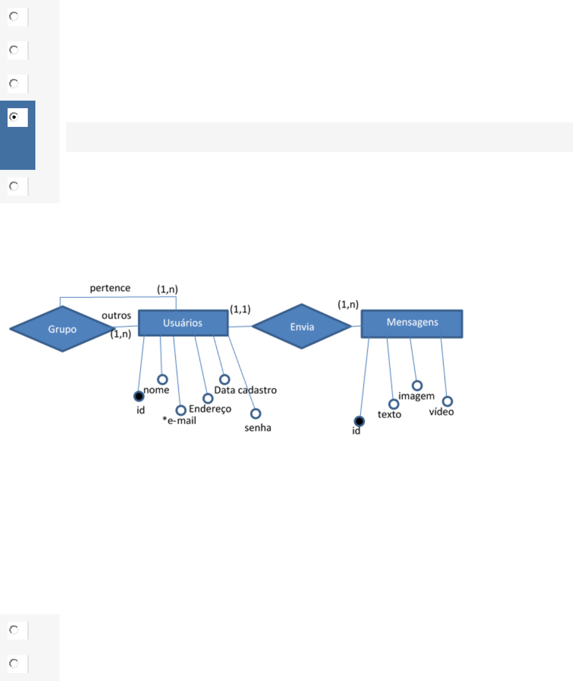 Questão 1/10 - Bancos de dados Uma transação (TCL) primeiramente é realizada em memória e apenas é efetivada fisicamente para o banco de dados após a confirmação de que todas as instruções foram executadas com sucesso. Selecione a alternativa que apresenta os três principais comandos TCL: Nota: 10.0 A BEGIN, SELECT e ROLLBACK. B GRANT, COMMIT e REVOKE. C BEGIN, REVOKE e ROLLBACK. D BEGIN, COMMIT e ROLLBACK. Você acertou! A alternativa correta é a letra C. Caso queira ler o texto integralmente, acesse o material texto na rota de aprendizagem da Aula Teórica 05 – página 14. E GRANT, COMMIT e ROLLBACK Questão 2/10 - Bancos de dados Observe a seguinte parte de um DER. Analise as seguintes sentenças e assinale V para as verdadeiras e F para as falsas, referentes ao diagrama apresentado. ( ) O relacionamento “Envia” deve ser convertido em um campo da tabela Mensagens, na modelagem lógica. ( ) As entidades Usuários e Mensagens devem ser convertidas para tabelas na modelagem lógica. ( ) O relacionamento “Grupo” deve ser convertido em tabela na modelagem conceitual. ( ) O relacionamento “Envia” deve ser convertido em tabela na modelagem lógica. Considerando a solicitação do usuário assinale a alternativa que contém a sequência das afirmativas corretas. Nota: 0.0 A F, F, F, F. B V, F, F, F. C F, V, F, F. D V, V, F, F. (V) O relacionamento “Envia” deve ser convertido em um campo da tabela Mensagens, na modelagem lógica. (V) As entidades Usuários e Mensagens devem ser convertidas para tabelas na modelagem lógica. (F) O relacionamento “Grupo” deve ser convertido em tabela na modelagem conceitual. – ERRADO – Na modelagem conceitual não tem tabela. (F) O relacionamento “Envia” deve ser convertido em tabela na modelagem lógica. – ERRADO – Deve ser um campo na tabela mensagens. E F, F, F, V. Questão 3/10 - Bancos de dados O Sistema Gerenciador de Banco de Dados nos permite executar diversos comandos para realizar pesquisas acerca de um banco. Dentre os diversos comandos, temos um que permite visualizar a estrutura da tabela, com o nome das colunas (Field), os tipos de dados (Types) e tamanhos. Analise as alternativas abaixo e selecione o comando utilizado para visualizar a estrutura de uma tabela. Nota: 10.0 A SHOW TABLES B DESCRIBE Você acertou! A alternativa correta é a letra B. Caso queira ler o texto integralmente, acesse o material texto na rota de aprendizagem da Aula Teórica 03 – página 13. C CREATE TABLE D SHOW DATABASES E SELECT Questão 4/10 - Bancos de dados Observe a seguinte parte de um Diagrama Entidade-Relacionamento. Analise as seguintes afirmativas, referentes ao diagrama apresentado. I. Para converter a entidade apresentada no modelo lógico serão criadas duas tabelas. II. O atributo e-mail, será convertido em uma tabela no modelo lógico. III. O atributo e-mail é um atributo multivalorado e será uma tabela com chave estrangeira para a tabela usuario. IV. Atributo endereço também é multivalorado e será uma tabela no modelo lógico. Considerando a solicitação do usuário assinale a alternativa que contém a sequência das afirmativas corretas. Nota: 10.0 A Estão corretas somente as alternativas I, II e III. Você acertou! I. Para converter a entidade apresentada no modelo lógico serão criadas duas tabelas. - CORRETO - II. O atributo e-mail, será convertido em uma tabela no modelo lógico.- CORRETO - III. O atributo e-mail é um atributo multivalorado e será uma tabela com chave estrangeira para a tabela usuario.- CORRETO - IV. Atributo endereço também é multivalorado e será uma tabela no modelo lógico.- ERRADO – Não há indicativo de multivalorado. B Somente estão corretas as alternativas II e III. C Estão corretas as afirmativas III e IV. D Estão corretas as afirmativas II e IV. E Está correta a afirmativa IV. Questão 5/10 - Bancos de dados Observe a seguinte parte de um Diagrama Entidade-Relacionamento: Analise as seguintes afirmativas e a relação entre elas. I. O relacionamento “Grupo” será convertido em uma tabela na modelagem relacional. Porque II. Um usuário pode pertencer a um grupo com outros usuários e estes outros usuários podem pertencer a outros grupos com usuários que já pertence a outros grupos. A respeito dessas assertivas e das representações, assinale a opção correta. Nota: 10.0 A Ambas assertivas estão corretas, mas não se complementam. B As assertivas estão certas e se complementam. Você acertou! As assertivas estão corretas e se complementam por descreverem o mesmo contexto envolvendo o relacionamento grupo. C A assertiva I é uma proposição falsa e a II é verdadeira. D A assertiva I está certa e a assertiva II está errada. E Ambas assertivas estão erradas. Questão 6/10 - Bancos de dados Considere que você realizou a pesquisa abaixo no banco de dados: Analise as seguintes sentenças e assinale V para as verdadeiras e F para as falsas considerando os dados armazenados na tabela usuário. ( ) A tabela usuário tem uma chave primária e uma chave estrangeira na coluna id. ( ) Na linha em que consta o id de valor 1 e o nome com valor Pedro formam uma tupla, também conhecida como registro. ( ) Os id 1, 2 e 3 formam um registro. ( ) id e Nome também são referências para coluna. Considerando a solicitação do usuário assinale a alternativa que contém a sequência das afirmativas corretas. Nota: 10.0 A F, F, F, F. B V, F, F, F. C F, V, F, V. Você acertou! (F) A tabela usuário tem uma chave primária e estrangeira na coluna id.- ERRADO – Não tem indicativo explicito de chaves na tabela. (V) Na linha em que consta o id de valor 1 e o nome com valor Pedro formam uma tupla, também conhecida como registro. (F) Os id 1, 2 e 3 formam um registro.- ERRADO – cada coluna possui um valor e todos os valores indicados em um linha formam um registro. Neste caso temos valores de três diferentes registros. (V) id e Nome também são referência par