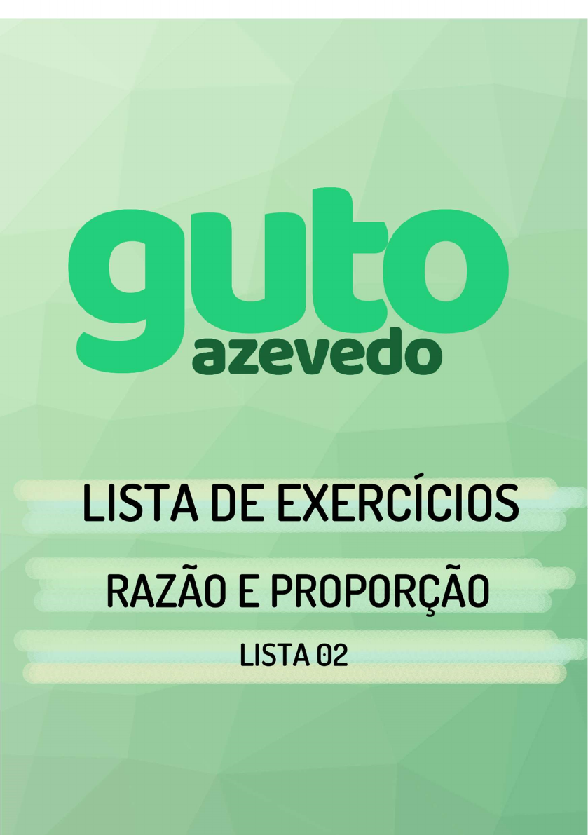 LISTA DE EXERCÍCIOS Razão e proporção | Lista 02 Clique nos ícones a seguir para acessar meu canal no YouTube, minha página no Instagram, Facebook, Pinterest e também para se inscrever no meu canal no Telegram: 1. (UFMG) No ano passado, uma equipe de 13 professores, com um ritmo de trabalho suposto constante, corrigiu 3000 provas em 6 dias. Este ano, o número de provas aumentou para 5500 e a equipe foi ampliada para 15 professores. Para se obter uma estimativa do número n de dias necessários para totalizar a correção, suponha que, durante todo o período de correção, o ritmo de trabalho da equipe deste ano será o mesmo da equipe do ano passado. O número n satisfaz a condição A) n 8. B) 8 < n 10. C) 10 < n 12. D) n > 12. 2. (PUC) Numa prova de Matemática, João ganhou 15 pontos a mais que Pedro. A diferença entre a média aritmética e a média geométrica desses pontos é 2 5 . Então, o número de pontos obtidos Por João, nessa prova, foi A) 20. B) 25. C) 30. D) 35. 3. (UFMG Um investidor aplicou R$ 500.000,00 em poupança. As taxas de juros foram 25% no primeiro mês e 28% no segundo mês. Nessas condições, o valor acumulado ao final desses 2 meses é A) R$ 765.000,00. B) R$781.250,00. C) R$ 800.000,00. D) R$819.200,00. E) R$ 900.000,00. 4. (FUVEST-SP) A cada ano que passa, o valor de um carro diminui 30% em relação ao seu valor no ano anterior. Se V for o valor do carro no primeiro ano no oitavo ano o seu valor será A) (0,7) 2 V. B) (0,3) 8 V. C) (0,7) 7 V. D) (0,3) 7 V. 5. (UFMG-92) Uma firma é constituída por dois sócios A e B, cujos capitais investidos são 200 milhões e 350 milhões de reais, respectivamente. Todo lucro, ou prejuízo, da firma é dividido, entre os dois, proporcionalmente ao capital investido. A firma acusou um prejuízo de 121 milhões de reais. As parcelas do prejuízo, em milhões de reais, correspondentes a cada sócio são, respectivamente A) 20 e 101. B) 40 e 70. C) 44 e 77. D) 79 e 72. E) 100 e 21. 6. (UFMG) Uma empresa tem 750 empregados e comprou marmitas individuais congeladas suficientes para o almoço deles durante 25 dias. Se a empresa tivesse mais 500 empregados, a quantidade de marmitas já adquiridas seria suficiente para um número de dias igual a A) 10. B) 12. C) 15. D) 18. E) 20. 7. (PUC) A média de idade entre João, José, Joaquim e Maria é de 8 anos. Se a média das idades dos meninos é de 9 anos, qual é a idade de Maria? A) 5 B) 7 C) 4 D) 6 8. (UFMG-2003) Um estudante planejou fazer uma viagem de férias e reservou uma certa quantia em dinheiro para o pagamento de diárias. Ele tem duas opções de hospedagem: a Pousada A, com diária de R$ 25,00, e a Pousada B, com diária de R$ 30,00. Se escolher a Pousada A, em vez da Pousada B, ele poderá ficar três dias a mais de férias. Nesse caso, é CORRETO afirmar que, para o pagamento de diárias, esse estudante reservou A) R$300,00. B) R$ 600,00. C) R$350,00. D) R$450,00. 9. (UFMG) Num grupo de jovens, 25% têm estatura superior a 1,80m, 45% medem entre 1,65m e 1,70m e os 12 restantes têm estatura inferior a 1,64. É CORRETO afirmar que o número de jovens que medem entre 1,65m e 1,70m é A) 8. B) 10. C) 16. D) 18. GABARITO 1. B 2. A 3. C 4. C 5. C 6. C 7. A 8. D 9. D
