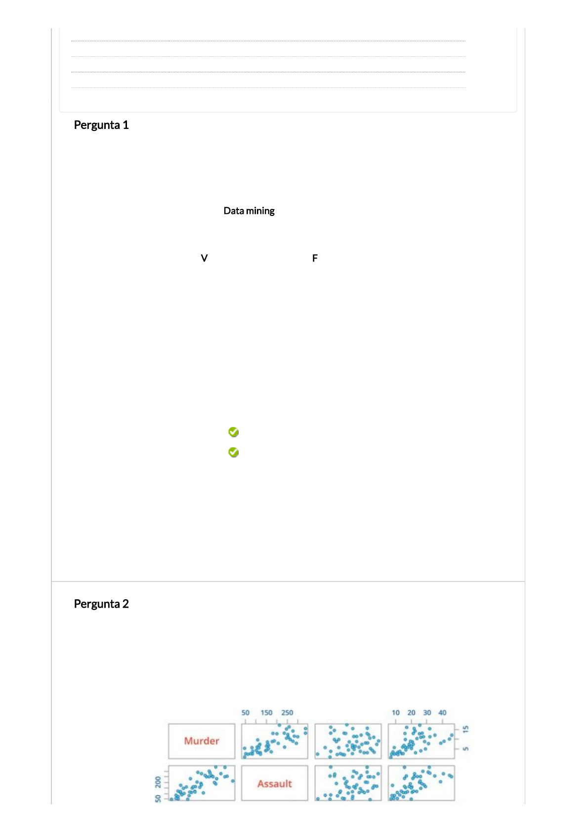 29/11/2020 Revisar envio do teste: ATIVIDADE 4 (A4) – ESTATÍSTICA ... https://anhembi.blackboard.com/webapps/late-Course_Landing_Page_Course_100-BBLEARN/Controller# 1/1 Enviado 29/11/20 19:29 Status Completada Resultado da tentativa 10 em 10 pontos Tempo decorrido 117 horas, 37 minutos Resultados exibidos Respostas enviadas, Respostas corretas, Comentários Pergunta 1 Resposta Selecionada: Resposta Correta: Feedback da resposta: O Margareth H. Duham, em seu livro Data Mining - Introductory and Advanced Topics, informa que tarefas de agrupamento, ou clustering em inglês, vêm sendo aplicadas em muitos domínios, incluindo a biologia, a medicina, a antropologia, o marketing e a economia. DUHAM, Margareth H. Data mining : introductory and advanced topics. Upper Saddle River (NJ): Pearson Education, 2003, p.126. A respeito desses domínios de aplicação de tarefas de agrupamento, analise as a�rmativas a seguir e assinale V para a(s) Verdadeira(s) e F para a(s) Falsa(s). I. ( ) Observar diferentes características de doenças em vários pacientes, e depois formar diferentes grupos de pacientes - por similaridade das características de suas doenças - é uma tarefa de agrupamento. II. ( ) Observar diferentes hábitos de consumo em várias milhares de pessoas, e depois formar grupos de pessoas - por similaridade de seus hábitos de consumo - é uma tarefa de agrupamento. III. ( ) Observar diferentes características das linguagens faladas por membros de aldeias remotas, e depois formar grupos de linguagens - por similaridades das características das linguagens - é uma tarefa de agrupamento. IV. ( ) Observar diferentes característica de insetos em diversos biomas, e depois formar grupos de insetos - por similaridade de suas características - é uma tarefa de agrupamento. V, V, V, V. V, V, V, V. Resposta correta. A sequência está correta. Observar diferentes características de indivíduos, sejam estes indivíduos doenças que se manifestam em pacientes, hábitos de consumos que se manifestam em consumidores, línguas faladas por diferentes povos, ou insetos que habitam diferentes biomas, e depois, para cada um desses exemplos, agrupar as observações feitas em grupos menores por similaridade, são tarefas de agrupamento. Sendo assim, todos os exemplos descritos são tarefas de agrupamento. Pergunta 2 Quando os dados se referem a múltiplas variáveis quantitativas, é possível exibir múltiplos grá�cos de dispersão entre pares dessas variáveis, duas a duas. No software estatístico R, isto pode ser feito com a função grá�ca pairs(). Adiante apresentamos um output típico da função pairs() quando aplicada a quatro variáveis quantitativas de um determinado conjunto de dados. 1 em 1 pontos 1 em 1 pontos