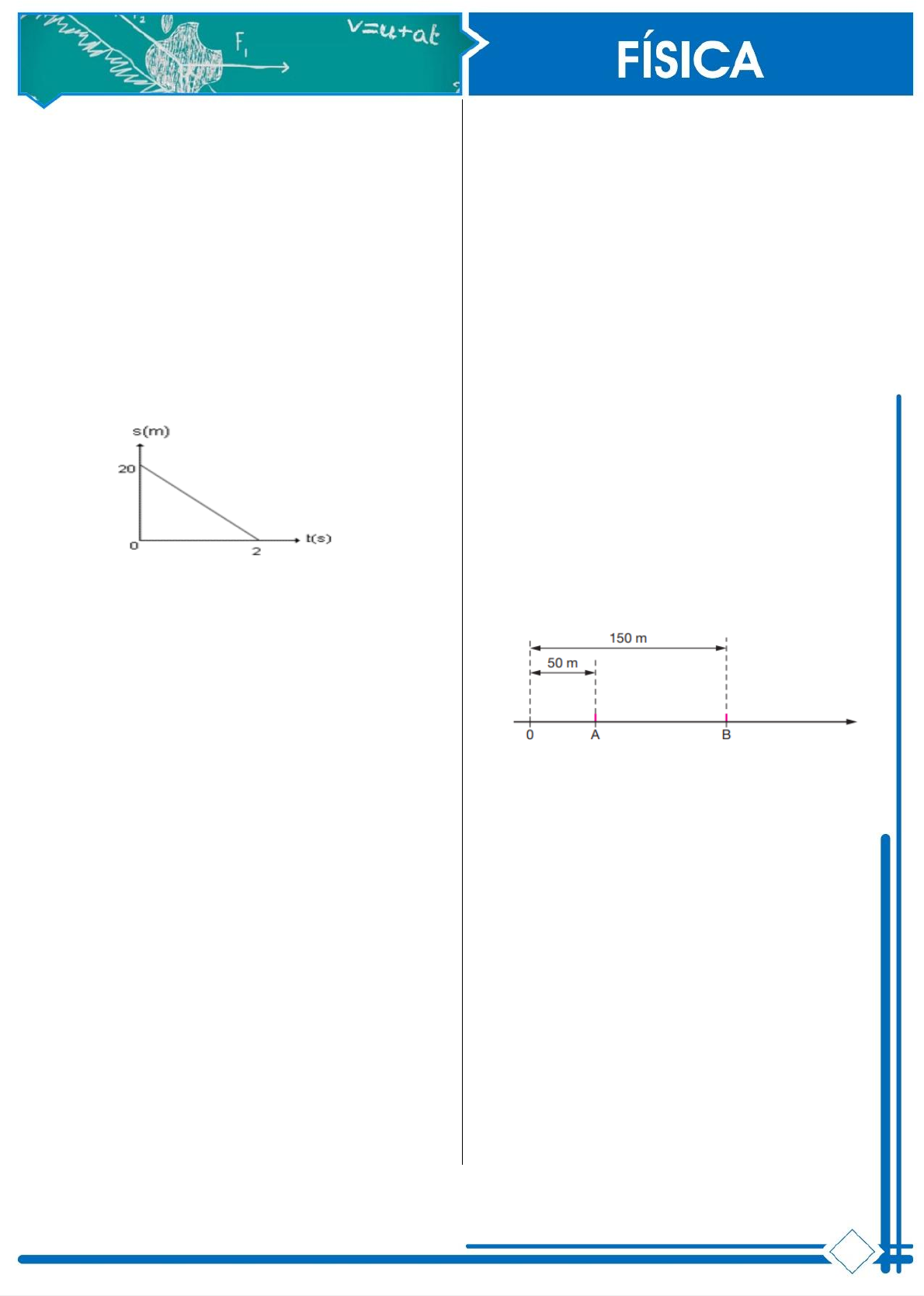 Q.01 - Dois ciclistas que se movem com velocidade constante possuem funções horárias S1 = 20 + 2.t e S2 = - 40 + 3.t; Em relação a um mesmo referencial e com unidades do Sistema Internacional. Pode-se afirmar que o instante de encontro entre eles é: a) 30 s b) 40 s c) 50 s d) 60 s e) 70 s Q.02 - O gráfico posição x tempo abaixo, refere-se a uma partícula que se desloca em movimento uniforme. Pode-se afirmar que a equação horária dos espaços para o movimento dessa partícula, com unidades no sistema internacional é: a) s = 20 + 10.t b) s = 20 + 20.t c) s = 20 – 10.t d) s = 2 + 10.t e) s = 20 – 40.t Q.03 - Um automóvel se deslocando com velocidade constante de 30 m/s está a 600m de outro que se desloca com velocidade de 20 m/s. O tempo decorrido até que o primeiro ultrapasse o segundo é: Dado: considere os automóveis como pontos materiais. a) 30 s b) 60 s c) 90 s d) 100 s e) 120 s Q.04 - Dois móveis cujas funções horárias de suas posições são SA = 10 + 2.t e SB = 4.t (SI) trafegam numa mesma trajetória retilínea. Pode-se afirmar que o instante de encontro entre eles é: a) 2 s b) 3 s c) 4 s d) 5 s e) 9 s Q.05 - Um trem de 100 m de comprimento atravessa uma ponte de 150 m de extensão. Sabendo que a velocidade desse trem é 36 km/h, o tempo gasto que ele gasta para atravessa-la é em segundos: a) 10 b) 20 c) 25 d) 15 e) 30 Q.06 - As funções horárias de dois trens que se movimentam em linhas paralelas são: s1 = k1 + 40t e s2 = k2 + 60t, onde o espaço s está em quilômetros e o tempo t está em horas. Sabendo que os trens estão lado a lado no instante t = 2,0 h, a diferença k1 - k2, em quilômetros, é igual a: a) 30 d) 80 b) 40 e) 100 c) 60 O enunciado seguinte refere-se às próximas duas questões. Dois móveis A e B, ambos com movimento uniforme, percorrem uma trajetória retilínea conforme mostra a figura. Em t = 0, estes se encontram, respectivamente, nos pontos A e B na trajetória. As velocidades dos móveis são vA = 50 m/s e vB = 30 m/s no mesmo sentido. Q.07 - Em qual ponto da trajetória ocorrerá o encontro dos móveis? a) 200 m d) 300 m b) 225 m e) 350 m c) 250 m Q.08 - Em que instante a distância entre os dois móveis será 50 m? a) 2,0 s d) 3,5 s b) 2,5 s e) 4,0 s c) 3,0 s Q.09 - Um móvel se desloca, em movimento uniforme, sobre o eixo x durante o intervalo de tempo de t0 = 0 a t = 30 s. O gráfico representa a posição x, em função do tempo t, para o intervalo de t = 0 a t = 5,0 s. O instante em que a posição do móvel é -30 m, em segundos, é: EXERCICIOS MOV. UNIFORME – AULA 02 a) 10 d) 25 b) 15 e) 30 c) 20 Q.10 - Um trem de 200 m de comprimento, com velocidade escalar constante de 60 km/h, gasta 36 s para atravessar completamente uma ponte. A extensão da ponte, em metros, é de: a) 200 d) 600 b) 400 e) 800 c) 500