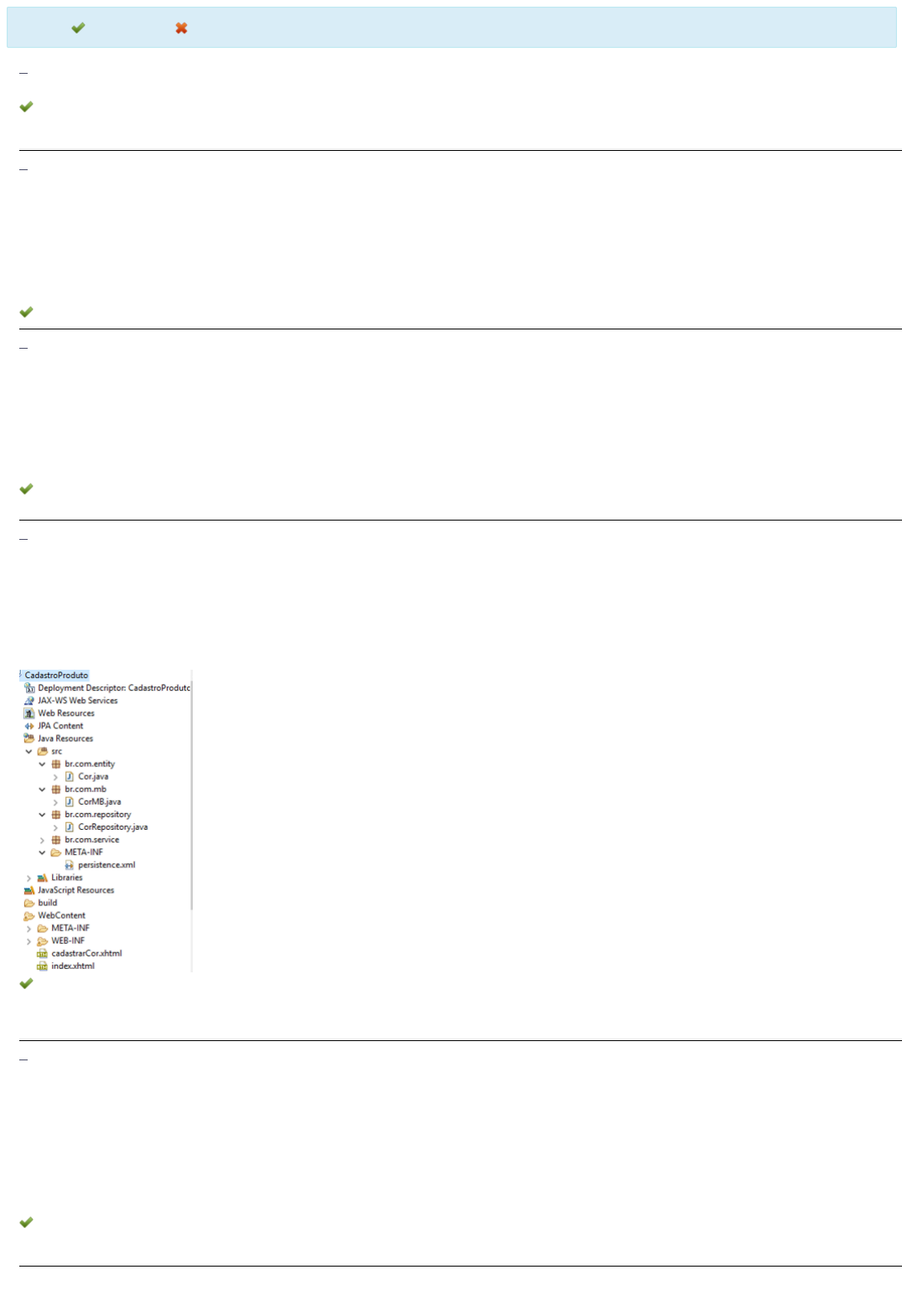Legenda: Resposta Certa Sua Resposta Errada 1. Tem como objetivo principal unir os modelos de componentes do JSF (Java Server Faces) com o EJB, proporcionando um modelo de fácil implementação para aplicações web, além de simplifica aplicação e garantir a flexibilidade no gerenciamento do ciclo de vida dos objetos. A descrição proposta define as características de: a) Expression Language (EL). b) Contexts and Dependency Injection (CDI). c) Web Container. d) Enterprise Java Bean (EJB). 2. O desenvolvimento de software utilizando a linguagem de programação Java disponibiliza muitos recursos que facilitam o trabalho, assim como várias arquiteturas, cada uma delas podendo ser para determinadas aplicações. A respeito da arquitetura EJB, analise as sentenças a seguir: I- Ao utilizar a arquiterura EJB, muitos recursos são administrados pelo servidor da aplicação. II- Na arquitetura EJB, os Stateful Session Beans devem ter seu ciclo de vida controlado pelo desenvolvedor, isto é, a limpeza destes objetos da memória. III- Na arquitetura EJB, existe o suporte para transações distribuídas. IV- Na arquitetura EJB, é necessário implementar a estrutura para autenticação e autorização. Assinale a alternativa CORRETA: a) As sentenças I, III e IV estão corretas. b) As sentenças I e IV estão corretas. c) As sentenças II, III e IV estão corretas. d) As sentenças I e III estão corretas. 3. Uma empresa desenvolveu um site de e-commerce, o qual revende produtos de vestuário. Dentre as principais funcionalidades deste sistema de e-commerce, cita-se a criação de carrinho de co cliente, onde é permitido adicionar, alterar a quantidade dos itens, ou ainda excluir um produto do carrinho. Neste sentido, a funcionalidade de carrinho de compras do sistema de e-commerce de estrutura de classes que permita manter o carrinho de compras em memória, assim como uma estrutura de classes para realizar persistência no banco de dados. Considerando o sistema de e-co apresentado, analise as afirmações a seguir: I- Para manter o carrinho de compras em memória deve ser utilizado um Stateless Session Bean. II- No Stateful Session bean utilizado no carrinho de compras, pode ser utilizada a anotação "@PreDestroy" quando se deseja realizar algum comando antes de eliminar o objeto da memória. III- Para apresentar em uma tela de controle a quantidade de usuários online, pode ser utilizada uma classe definida como Singleton. Assinale a alternativa CORRETA: a) III, apenas. b) I, apenas. c) II e III, apenas. d) I, II e III. 4. A empresa Xyz realiza o desenvolvimento de software sob demanda. Recentemente, um usuário entrou em contato com a empresa solicitando o desenvolvimento de um sistema de cadastro de empresa utiliza o padrão de arquitetura MVC em seus softwares, o que reduz o trabalho de manutenção, pois facilita o desenvolvimento e torna o código-fonte mais compreensível. A figura anex arquitetura inicial de algumas funcionalidades deste novo sistema sendo desenvolvido. Conforme pode ser analisado, no pacote (package) chamado de "mb", são criadas as classes Managed Be (package) chamado de "entity", são criadas as classes que referenciam tabelas do banco de dados; no pacote (package) chamado de "repository", são criadas as classes de persistência e no pa chamado de "service", são criadas as classes que possuem regras de negócio. Com base na arquitetura MVC apresentada na figura, avalie as afirmações a seguir: I- As classes do pacote (package) "entity" fazem parte da camada Controller da aplicação. II- As classes do pacote (package) "mb" fazem parte da camada Controller da aplicação. III- As classes do pacote (package) "service" fazem parte da camada Model da aplicação. IV- As páginas XHTML, dentro do diretório "WebContent", fazem parte da camada model da aplicação. Assinale a alternativa CORRETA: a) I, II e III. b) I, apenas. c) I, III e IV. d) I e IV, apenas. 5. A linguagem de programação Java possui diversos recursos disponíveis para aplicações simples e robustas. Um destes recursos é o sistema de mensagens Java, ou JMS (Java Message Servic possibilita que diferentes aplicações troquem mensagens entre si. A troca de mensagens pode acontecer em uma integração entre sistemas por exemplo, o que pode ser realizado através do uso São definidos os padrões filas e tópicos para o armazenamento de mensagens, e a realização da troca de mensagens pode ser utilizada em projetos de integração de sistemas, assim como em bate-papo. Considerando as informações apresentadas, analise as afirmações a seguir: I- Ambos os tipos de mensagens (filas e tópicos) não precisam estar configurados no middleware. II- Para utilização das filas ou tópicos, é necessário obter uma conexão JMS através das fábricas cadastradas no MOM. III- Através do serviço JNDI pode ser obtida uma fábrica de conexão-padrão. IV- A anotação @Resource marca o Topic. Assinale a alternativa CORRETA: FONTE: Disponível em: <https://www.devmedia.com.br/como-implementar-a-troca-de-mensagens-com-jms/25127>. Acesso em: 17 jul. 2018 (adaptado). a) I, apenas. b) II, III e IV. c) II e III, apenas. d) III, apenas. https://portaldoalunoead.uniasselvi.com.br/ava/notas/request_gabarito_n2.php?action1=RkxYMjI4Mg==&action2=QURTMjc=&action3=NjQ5NzA5&action4=MjAyMC8y&prova=MjY2ODQ3NzM=#questao_1%20aria-label= https://portaldoalunoead.uniasselvi.com.br/ava/notas/request_gabarito_n2.php?action1=RkxYMjI4Mg==&action2=QURTMjc=&action3=NjQ5NzA5&action4=MjAyMC8y&prova=MjY2ODQ3NzM=#questao_2%20aria-label= https://portaldoalunoead.uniasselvi.com.br/ava/notas/request_gabarito_n2.php?action1=RkxYMjI4Mg==&action2=QURTMjc=&action3=NjQ5NzA5&action4=MjAyMC8y&prova=MjY2ODQ3NzM=#questao_3%20aria-label= https://portaldoalunoead.uniasselvi.com.br/ava/notas/request_gabarito_n2.php?action1=RkxYMjI4Mg==&action2=QURTMjc=&action3=NjQ5NzA5&action4=MjAyMC8y&prova=MjY2ODQ3NzM=#questao_4%20aria-label= https://portaldoalu