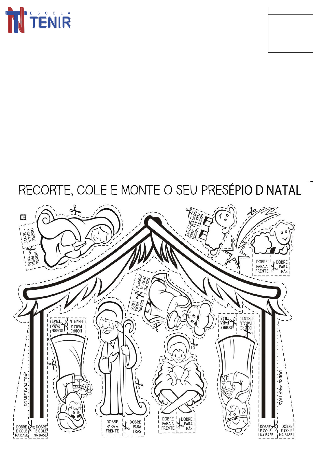 _______________________________________________________________________________________________________________________________________________________________________ Escola Tenir LTDA - Unidade 1 – Rua Cuiabá, 263 – Centro – Corumbá / MS – Cep: 79303-070 - Tel.: 0**(67)3234-3900 – Site: www.escolatenir.com.br – Email: coord.fund1@escolatenir.com.br Corumbá,........ de novembro de 2020. Nota / Visto Aluno (a): Série: 4º Ano do Ensino Fundamental 1 Turma: ........... Professor (a): Simone Aparecida da Silva Barros de Oliveira Atividade Avaliativa de Arte P.2 (4º Bimestre) Obs. As imagens abaixo poderão ser afixadas numa superfície sólida, (placa de isopor, papelão, por exemplo) de modo que elas não fiquem soltas. Siga as orientações: 1- Colorir; 2- Recortar; (ATENÇÃO AS ÁREAS QUE DEVERÃO SER DOBRADAS E NÃO CORTADAS) 3- Colar; 4- Use sua criatividade e capriche na montagem do seu presépio; 5- Tire uma foto sua (aluno) juntamente com o presépio montado. Essa deverá ser enviada no grupo de WhatsApp do 4º ano no dia (01.12 das 08h ás 17h), se possível, na foto, escreva o nome do aluno (a).