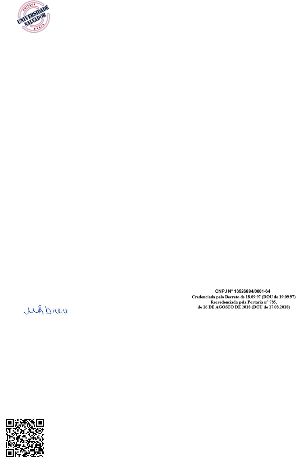 Rua Doutor José Peroba, nº 251, STIEP, CEP 41770-235, Salvador - BA www.unifacs.br ATESTADO Atestamos que KARLIANNE SANTANA DE JESUS matricula nº 167200073 está regularmente matriculado neste período letivo de 20202 no curso de FARMÁCIA nesta UNIVERSIDADE SALVADOR - UNIFACS. 27 de Novembro de 2020.Salvador, Coordenadora da Secretaria Geral Macele Rocha de Abreu null - null Para certificar que esse documento é válido basta ler o qrcode ou acessar o link https://unifacs.proatecnologia.com.br informando o código acima do documento. Documento Autenticado