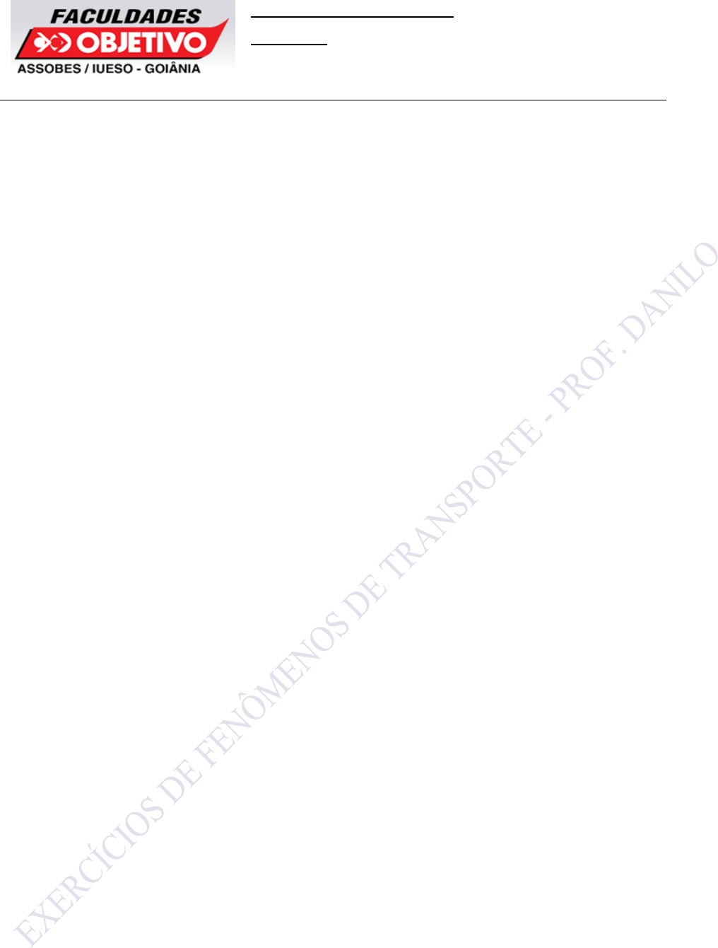 EXERCÍCIOS DE MEMORIZAÇÃO DISCIPLINA: FENÔMENOS DE TRANSPORTE SEMESTRE 2019/1 Página 1 Exercício 1 Classifique os fluidos quanto ao movimento e detalhe o que acontece com a vazão e velocidade em cada tipo de escoamento. Resposta: Ler material de aula já discutido em sala. Exercício 2 Explique o experimento de Reynolds e descreva as características do regime de escoamento lamelar, transição e turbulento. Resposta: Ler material de aula já discutido em sala. Exercício 3 Explique o que é massa específica, densidade e peso específico. Resposta: Ler material de aula já discutido em sala. Exercício 4 Explique o que é tensão de cisalhamento em um fluido Resposta: Ler material de aula já discutido em sala. Exercício 5 Explique o que é viscosidade de um fluido. Detalhe a viscosidade dinâmica ou absoluta e viscosidade cinemática detalhando suas unidade no SI e CGS. Resposta: Ler material de aula já discutido em sala. Exercício 6 Deduza/desenvolva a equação da continuidade, demonstrando o principio da conservação de massa para fluidos incompressíveis e compressíveis. Resposta: Ler material de aula já discutido em sala. Exercício 7 O que é vazão volumétrica, vazão em massa e vazão em peso. Resposta: Ler material de aula já discutido em sala. Exercício 8 Com relação à Classificação Geométrica do Escoamento, explique o que é Escoamento Tridimensional, Bidimensional e Unidimensional. Resposta: Ler material de aula já discutido em sala. Exercício 9 A viscosidade absoluta de um fluido é de 1 P (Poise). Qual a viscosidade dinâmica deste fluido em kg/m.s. Resposta: 0,1 kg/m.s Exercício 10 A viscosidade absoluta de um fluido é de 2,3 Pl (Pouiseuille). Qual a viscosidade dinâmica deste fluido em N.s/cm²? Resposta: 2,3 x 10 -4 N.s/cm² EXERCÍCIOS DE MEMORIZAÇÃO DISCIPLINA: FENÔMENOS DE TRANSPORTE SEMESTRE 2019/1 Página 2 Exercício 11 A viscosidade absoluta de um fluido é de 25,6 dyn.s/m². Qual a viscosidade dinâmica deste fluido no sistema MKS, CGS e SI? Resposta: MKS: 2,56 x 10 -3 kgf.s/m² CGS: 2,56 x 10 -3 dyn.s/cm² SI: 2,56 x 10 -4 N.s/m² Exercício 12 A viscosidade absoluta de um fluido é de 25,6 dyn.s/cm². Qual a viscosidade dinâmica deste fluido no sistema CGS e SI? Expresse também a resposta em poise (P) e pouiseuille (Pl) Resposta: CGS: 25,6 dyn.s/cm² ou g/cm.s SI: 2,56 kg/m.s ou N.s/m² ou Pa.s (que é o mesmo que 25,6 P ou 2,56 Pl) Exercício 13 A viscosidade absoluta de um fluido é de 25,6 dyn.s/cm² e a densidade relativa deste fluido é de 0,89 e a densidade da água vale 1000 kg/m³. Qual a viscosidade cinemática deste fluido no sistema CGS e SI? Expresse também a resposta Stoke (St) Resposta: CGS: 28,76 cm²/s SI: 2,876 x 10 -3 m²/s (que é o mesmo que 28,76 St) Exercício 14 Para a água a 20ºC e 1 atm, tem-se: “”= 1,0030 x 10 -3 N.s/m². Considerando que a densidade da água para estas condições seja de 1 g/cm³, represente “” em centipoise e obtenha o valor da viscosidade cinemática “ʋcn” em Stokes (St) e centistoke. Resposta: = 1,003 centipoise; ʋcn = 1,003 x 10 -6 m²/s (Sistema Internacional de unidades – SI); ʋcn = 1,003 x 10 -2 cm²/s (Sistema métrico – CGS); ʋcn = 1,003 x 10 -2 St (Stokes) ou 1,003 cSt (centistokes). Exercício 15 A viscosidade cinemática de fluido é de 1,8 St (Stokes). Qual a viscosidade deste fluido m²/s e cm²/s ? Resposta: ʋcn = 1,8 cm²/s; ʋcn = 1,8 x 10 -4 m²/s; Exercício 16 A viscosidade cinemática de fluido é de 1,8 St (Stokes). E a massa específica deste fluido é de 987 kg/m³, Qual a viscosidade absoluta deste fluido em Pa.s e em Poise (P)? Resposta: = 0,1776 Pa.s (ou 0,1776 kg/m.s ou N.s/m²) = 1,776 P EXERCÍCIOS DE MEMORIZAÇÃO DISCIPLINA: FENÔMENOS DE TRANSPORTE SEMESTRE 2019/1 Página 3 Exercício 15 Considere duas placas planas e paralelas, com espaçamento de 2 mm. Entre as placas há óleo com viscosidade dinâmica 8,3 x 10-3 N·s/m². Sabendo que a placa superior desloca-se com velocidade de 5 m/s e que a inferior é fixa, determine a tensão de cisalhamento (N/m2) que atuará no óleo. Resposta: 20,75 N/m² Exercício 16 Duas placas de área igual a 25 cm² estão justapostas e paralelas, separadas por uma distância de 5,0x10 -6 m. Seu interior é preenchido com óleo SAE 30. As placas são sujeitas a forças opostas e paralelas a suas faces, de intensidade igual a 0,2 N, e se deslocam uma em relação à outra com velocidade de 1 mm/s. Qual é a viscosidade dinâmica (Pa.s) do óleo? Resposta:0,4 Pa.s Exercício 17 Um óleo tem uma viscosidade cinemática de 1,25 x 10 -4 m²/s e uma massa específica de 800 kg/m³. Qual é sua viscosidade dinâmica (absoluta) em kg/(m.s)? Resposta: 0,1 kg/(m.s) Exercício 18 A viscosidade cinemática de um óleo é de 2,8 x 10 -4 m²/s e a sua densidade relativa é 0,85. Determinar a viscosidade dinâmica no sistema CGS. Resposta: 2,38 P Exercício 19 Para um escoamento sobre uma placa, a variação vertical de velocidade v com a distância y na direção normal à placa é dada por v(y) = ay - by², onde a e b são constantes. Obtenha uma relação para a tensão de cisalhamento na parede (y = 0) em termos de a, b e (viscosidade dinâmica). Exercício 20 Explique o que é um fluido newtoniano? A água é um fluido newtoniano? Resposta: é um fluido cuja tensão de cisalhamento é proporcional à taxa de deformação. A água é um fluido newtoniano. Exercício 21 Uma placa fina move-se entre duas placas planas horizontais estacionárias com uma velocidade constante de 5 m/s. As duas placas estacionárias estão separadas por uma distância de 4 cm, e o espaço entre elas está cheio de óleo com viscosidade de 0,9 N.s/m². A placa fina tem comprimento de 2 m e uma largura de EXERCÍCIOS DE MEMORIZAÇÃO DISCIPLINA: FENÔMENOS DE TRANSPORTE SEMESTRE 2019/1 Página 4 0,5 m. Se ela se move no plano médio em relação às duas placas estacionárias (h1 = h2 = 2 cm), qual é a força, em newtons (N) req