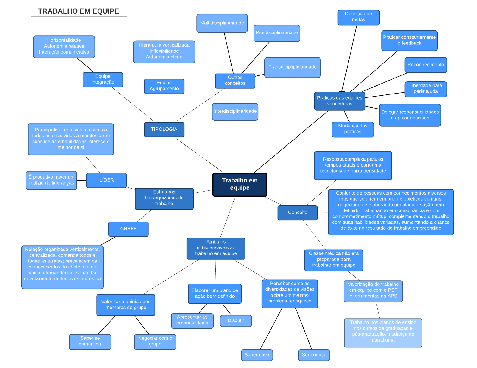 Trabalho em equipe TIPOLOGIA Conceito Estruturas hierarquizadas do trabalho Atributos indispensáveis ao trabalho em equipe Elaborar um plano de ação bem definido Valorizar a opinião dos membros do grupo Perceber como as diversidades de visões sobre um mesmo problema enriquece LÍDER CHEFE Classe médica não era preparada para trabalhar em equipe Conjunto de pessoas com conhecimentos diversos mas que se unem em prol de objeticos comuns, negociando e elaborando um plano de ação bem definido, trabalhando em consonância e com comprometimento mútup, complementando o trabalho com suas habilidades variadas, aumentando a chance de êxito no resultado do trabalho empreendido Resposta complexa para os tempos atuais e para uma tecnologia de baixa densidade Equipe integração Equipe Agrupamento Outros conceitos Valorização do trabalho em equipe com o PSF e ferramentas na APS Trabalho nos planos de ensino nos cursos de graduação e pós-graduação: mudança de paradigma Participativo, entusiasta; estimula todos os envolvidos a manifestarem suas ideias e habilidades, oferece o melhor de si TRABALHO EM EQUIPE Saber se comunicar Negociar com o grupo Apresentar as próprias ideias Discutir Saber ouvir Ser curioso Relação organizada verticalmente, centralizada, comanda todos e todas as tarefas; prevalecem os conhecimentos do chefe; ele é o único a tomar decisões, não há envolvimento de todos os atores na É produtivo haver um rodízio de lideranças Horizontalidade Autonomia relativa Interação comunicativa Hierarquia verticalizada Inflexibilidade Autonomia plena Multidisciplinaridade Puridisciplinaridade Transdicipliplinaridade Interdisciplinaridade Práticas das equipes vencedoras Definição de metas Praticar constantemente o feedback Reconhecimento Liberdade para pedir ajuda Delegar responsabilidades e apoiar decisões Mudança das práticas Mapa mental básico Mapa mental básico