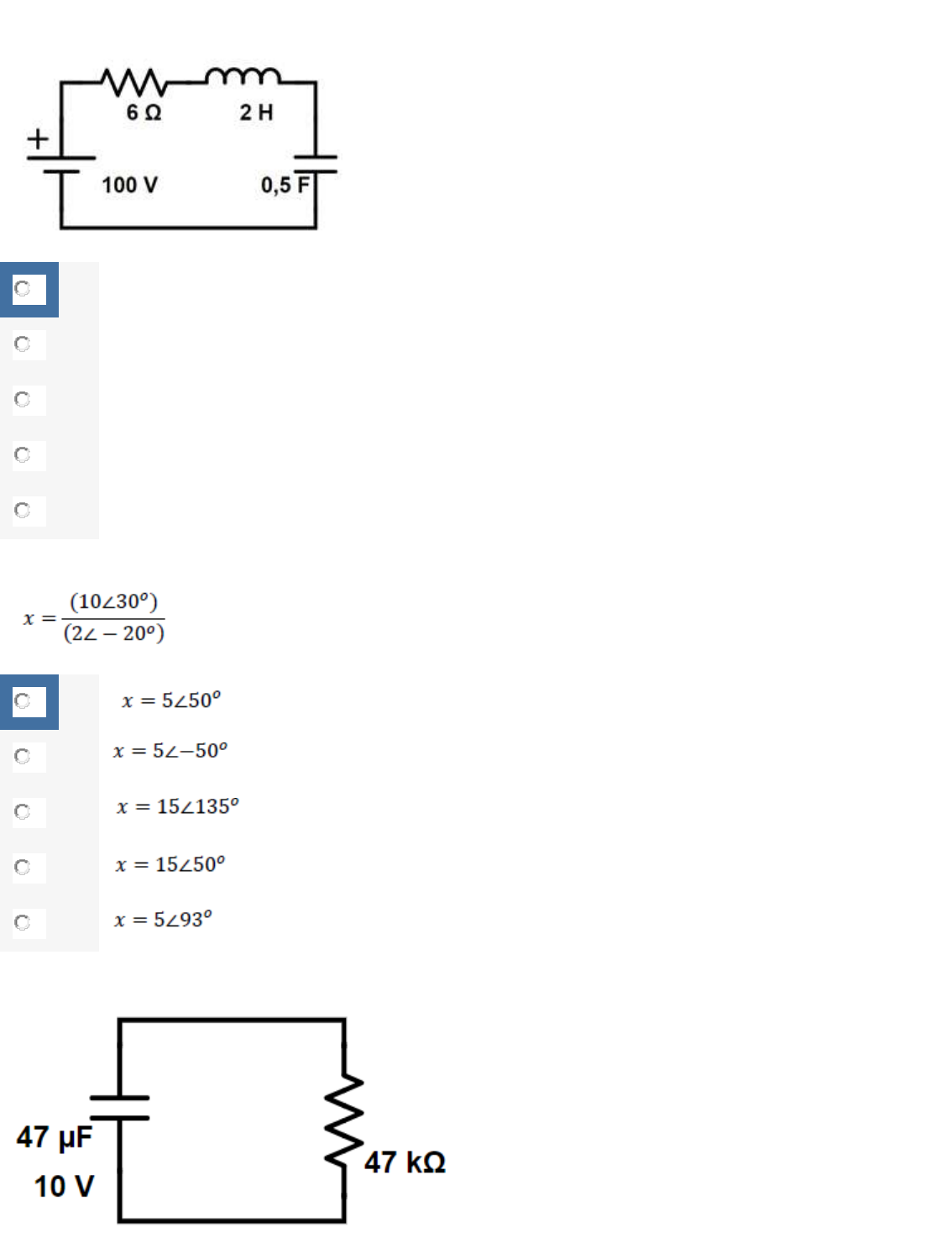 APOL 1 Análise de Circuitos Elétricos 07 2020 Questão 1/10 - Análise de Circuitos Elétricos Seja o circuito RLC abaixo: Indique qual o tipo de resposta do circuito. A Superamortecido B Não amortecido C Criticamente amortecido D Pouco amortecido E Subamortecido Questão 2/10 - Análise de Circuitos Elétricos Dada a operação com números complexos: Calcular o valor de x A B C D E Questão 3/10 - Análise de Circuitos Elétricos Considere o circuito RC sem fonte a seguir: Calcule a tensão no capacitor após 8 segundos, sabendo que o capacitor carregado com 10 V foi conectado ao circuito em 0 segundos. A v(8)=0,267Vv(8)=0,267V B v(8)=1,4Vv(8)=1,4V C v(8)=11,04Vv(8)=11,04V D v(8)=3,62Vv(8)=3,62V E v(8)=2,67Vv(8)=2,67V Questão 4/10 - Análise de Circuitos Elétricos Dada a operação com números complexos: Calcular o valor de x A B C D E Questão 5/10 - Análise de Circuitos Elétricos Dada a operação com números complexos: Calcular o valor de x A B C D E Questão 6/10 - Análise de Circuitos Elétricos Dada a operação com números complexos: Calcular o valor de x A B C D E Questão 7/10 - Análise de Circuitos Elétricos Obtenha a transformada de laplace de f(t)=δ(t)+2u(t)−3e−2t,t≥0f(t)=δ(t)+2u(t)−3e−2t,t≥0. A 2s2+2S+42s(2s+2)2s2+2S+42s(2s+2) B 4s2+4s+444s(4s+2)4s2+4s+444s(4s+2) C s2+44s+4(s+2)s2+44s+4(s+2) D s2+s+4s(s+2)s2+s+4s(s+2) E s2+s+4s Questão 8/10 - Análise de Circuitos Elétricos Considere o circuito RC abaixo, em que o capacitor C1 encontra-se carregado com 50 V. Calcule tempo mínimo em que pode-se considerar o capacitor descarregado. A 1 min e 50 s B 1 min e 10 s C 55 s D 40 s E 22 s Questão 9/10 - Análise de Circuitos Elétricos Para o circuito capacitivo a seguir, calcule a capacitância equivalente. A Ceq = 25 [uF] B Ceq = 20 [uF] C Ceq = 10 [uF] D Ceq = 30 [uF] E Ceq = 35 [uF] Questão 10/10 - Análise de Circuitos Elétricos Circuitos RLC paralelo possuem uma resposta característica. Considere o circuito abaixo com os valores: Tensão inicial do capacitor v(0)=40 V Corrente inicial no indutor i(0)=5 A Is=30 A, R=10 ΩΩ, L=4 H e C=10 mF Calcule a corrente no indutor i(t). A i(t)=10+(2,8+4.t).e-2t B i(t)=30+(-25-115.t).e-5t C i(t)=30+(-25+20.t).e-3t D i(t)=30+(35+5.t).e-5t E i(t)=(-25+35.t).e-5t