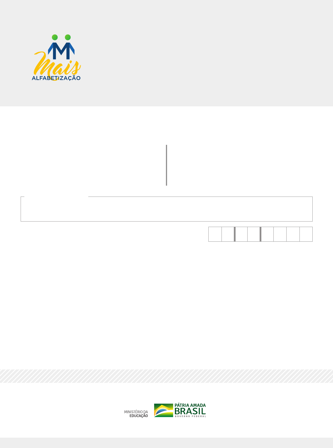 Caderno M0107 MATEMÁTICA 1º ano do Ensino Fundamental Nome do(a) aluno(a) Data de Nascimento do(a) aluno(a) MT1EF APLIC Caro(a) aluno(a), Sua participação no Programa Mais Alfabetização é muito importante para avançarmos na qualidade da educação brasileira. • Hoje, você vai nos ajudar a saber o que podemos fazer para melhorar as atividades de Matemática. • Responda com calma, procure não deixar nenhuma questão em branco. Contamos com você! 2ª AVALIAÇÃO CADERNO DO APLICADOR CADERNO DO APLICADOR EXEMPLO Vamos fazer juntos um exemplo de uma atividade. Aplicador, ler SOMENTE a(s) informação(ões) que apresenta(m) o desenho de um megafone . Observe abaixo a conta que a professora Ana escreveu no quadro. Não deve ser lido. 15 + 4 Qual é o resultado dessa conta? 11 Não deve ser lido. 18 19 55 BL02M01 Aplicador, ler SOMENTE a(s) informação(ões) que apresenta(m) o desenho de um megafone . Questão 01 M011164H6 Observe abaixo a coleção de balões que Aline tem em seu quarto. Quantos balões Aline tem, ao todo, em sua coleção? 3 5 6 7 M0107_APLIC 1 BL02M01 Aplicador, ler SOMENTE a(s) informação(ões) que apresenta(m) o desenho de um megafone . Questão 02 M010039I7 Observe abaixo o gráfico que apresenta a quantidade de balas que alguns estudantes comeram durante um mês. BALAS 35 30 25 20 15 10 5 0 ANTÔNIO LUÍSA JOANA PEDRO ESTUDANTES Q U A N T ID A D E D E B A L A S De acordo com esse gráfico, quem comeu 20 balas? ANTÔNIO. JOANA. LUÍSA. PEDRO. M0107_APLIC 2 BL02M01 Aplicador, ler SOMENTE a(s) informação(ões) que apresenta(m) o desenho de um megafone . Questão 03 M010652H6 Observe a sequência numérica abaixo. 56 – 57 – 58 – 59 – 60 Qual é o segundo número dessa sequência? 60 59 57 56 M0107_APLIC 3 BL02M01 Aplicador, ler SOMENTE a(s) informação(ões) que apresenta(m) o desenho de um megafone . Questão 04 M010728H6 Observe abaixo o desenho de Taís na saída da escola. TAÍS De acordo com esse desenho, o que está à esquerda de Taís? M0107_APLIC 4 BL02M01 Aplicador, ler SOMENTE a(s) informação(ões) que apresenta(m) o desenho de um megafone . Questão 05 M010678H6 Resolva a operação abaixo. 24 + 13 Qual é o resultado dessa operação? 11 24 36 37 M0107_APLIC 5 BL02M01 Aplicador, ler SOMENTE a(s) informação(ões) que apresenta(m) o desenho de um megafone . Questão 06 M020519H6 Observe abaixo as atividades que Marcela fez na manhã de quarta-feira. LIMPOU A CASA TOMOU BANHO TROCOU DE ROUPA PENTEOU O CABELO CORTOU AS UNHAS O que Marcela fez depois que penteou o cabelo? M0107_APLIC 6 BL02M01 Aplicador, ler SOMENTE a(s) informação(ões) que apresenta(m) o desenho de um megafone . Questão 07 M010101I7 Observe abaixo a decomposição de um número. 5 DEZENAS E 2 UNIDADES Essa é a decomposição de qual número? 25 52 502 520 M0107_APLIC 7 BL02M01 Aplicador, ler SOMENTE a(s) informação(ões) que apresenta(m) o desenho de um megafone . Questão 08 M010983H6 Observe abaixo o cofrinho de Paulo. COFRINHO $ $ A forma desse cofrinho lembra qual figura geométrica? M0107_APLIC 8 BL02M01 Aplicador, ler SOMENTE a(s) informação(ões) que apresenta(m) o desenho de um megafone . Questão 09 M010844H6 Gabriela tinha 12 ursos de pelúcia. Ela deu 4 desses ursos para sua prima. Com quantos ursos Gabriela ficou? 8 9 12 16 M0107_APLIC 9 BL02M01 Aplicador, ler SOMENTE a(s) informação(ões) que apresenta(m) o desenho de um megafone . Questão 10 M010994H6 Observe abaixo a tabela com a quantidade de animais disponíveis para venda em uma loja. ANIMAIS QUANTIDADE GATO 6 CACHORRO 9 PÁSSARO 4 PEIXE 7 De acordo com essa tabela, quantos cachorros, no total, estão disponíveis para venda nessa loja? 4 6 7 9 M0107_APLIC 10 BL04M01 Aplicador, ler SOMENTE a(s) informação(ões) que apresenta(m) o desenho de um megafone . Questão 11 M010669H6 Luana, Clara, Fernanda e Júlia participaram de uma festa na escola. Observe abaixo a quantidade de bolinhos que cada menina comeu nessa festa. LUANA CLARA FERNANDA JÚLIA Qual é a ordem dessas meninas, começando pela menina que comeu mais bolinhos até a menina que comeu menos bolinhos? CLARA – FERNANDA – LUANA – JÚLIA. CLARA – LUANA – JÚLIA – FERNANDA. JÚLIA – LUANA – FERNANDA – CLARA. LUANA – CLARA – FERNANDA – JÚLIA. M0107_APLIC 11 BL04M01 Aplicador, ler SOMENTE a(s) informação(ões) que apresenta(m) o desenho de um megafone . Questão 12 M011096H6 Observe abaixo a sequência dos números. Ela segue um padrão. 20 – 25 – 30 – 35 – __ Qual é o número que completa essa sequência? 36 37 40 45 M0107_APLIC 12 BL04M01 Aplicador, ler SOMENTE a(s) informação(ões) que apresenta(m) o desenho de um megafone . Questão 13 M010002I7 Regina faz aniversário no dia 17 de agosto. Ela marcou essa data no calendário abaixo. AGOSTO 2018 DOMINGO SEGUNDA TERÇA QUARTA QUINTA SEXTA SÁBADO 1 2 3 4 5 6 7 8 9 10 11 12 13 14 15 16 17 ANIVERSÁRIO 18 19 20 21 22 23 24 25 26 27 28 29 30 31 De acordo com esse calendário, em que dia da semana será o aniversário de Regina? SEGUNDA TERÇA QUARTA SEXTA M0107_APLIC 13 BL04M01 Aplicador, ler SOMENTE a(s) informação(ões) que apresenta(m) o desenho de um megafone . Questão 14 M010031I7 Observe abaixo a quantia que Paulo gastou no mercado. Qual foi a quantia que Paulo gastou no mercado? 2 REAIS. 10 REAIS. 20 REAIS. 40 REAIS. M0107_APLIC 14 BL04M01 Aplicador, ler SOMENTE a(s) informação(ões) que apresenta(m) o desenho de um megafone . Questão 15 M020527H6 Simone tinha 22 pulseiras e ganhou mais 12 de sua amiga. Com quantas pulseiras Simone ficou no total? 10 22 33 34 M0107_APLIC 15 BL04M01 Aplicador, ler SOMENTE a(s) informação(ões) que apresenta(m) o desenho de um megafone . Questão 16 M011119H6 Observe abaixo o desenho de quatro mulheres. Qual dessas mulheres é a mais baixa? M0107_APLIC 16 BL04M01 Aplicador, ler SOMENTE a(s) informação(ões) que apresenta(m) o desenho de um megafone . Questão 17 M010239I7 Observe abaixo a decomposi