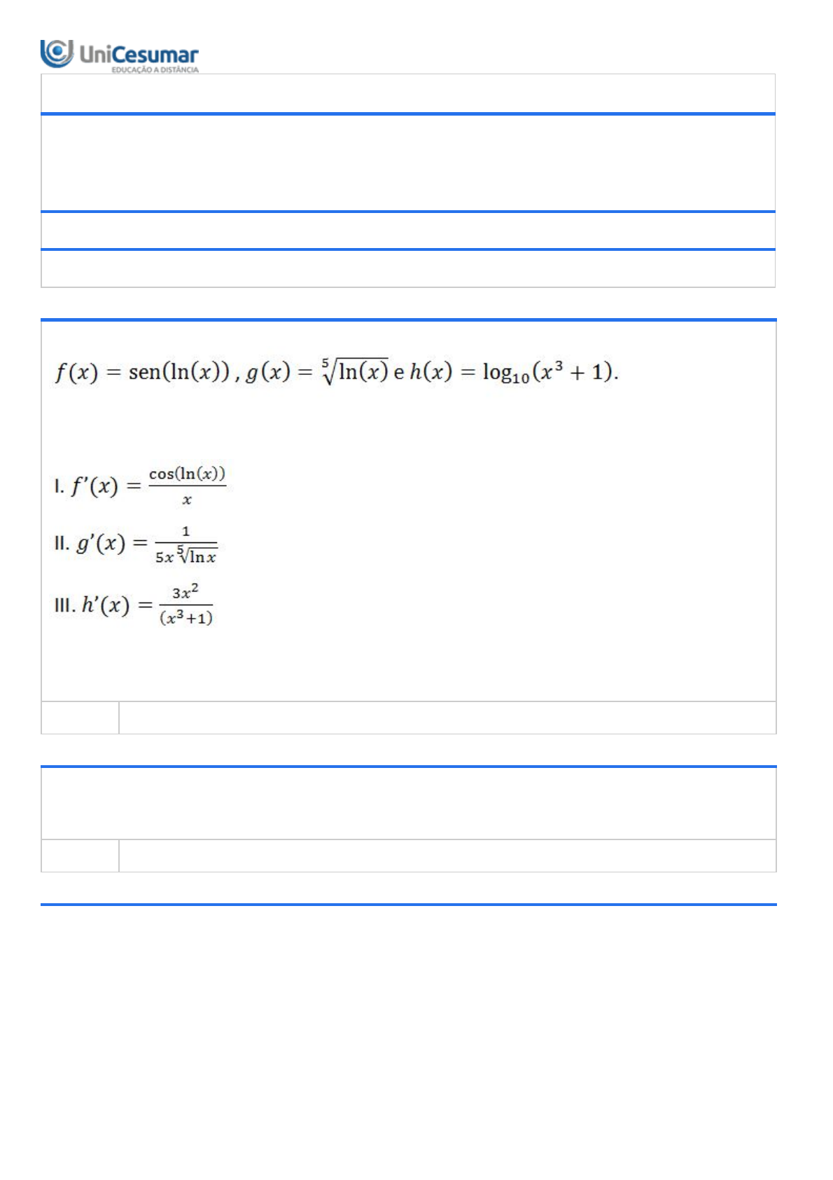 04/12/2020 Unicesumar - Ensino a Distância 1/5 Protocolo de Finalização Nº 000031565753 O aluno CHRISTIAN FERNANDES DA ROSA com RA 1911857-5 finalizou a atividade PROJETO DE ENSINO - AE 1 - OFICINA DE CÁLCULO: TÉCNICAS DE RESOLUÇÃO - 54/2020 em 04/12/2020 09:04:35 PROJETO DE ENSINO - AE 1 - OFICINA DE CÁLCULO: TÉCNICAS DE RESOLUÇÃO - 54/2020 Período:28/09/2020 08:00 a 04/12/2020 23:59 (Horário de Brasília) Status:ABERTO 1ª QUESTÃO Dadas as funções: Analise as afirmativas seguintes. É correto o que se afirma em: RESPOSTA: I apenas. 2ª QUESTÃO Considere as funções dadas por f(x) = x - 4x + 6, g(x) = x (1 - 2x) e h(x) = (3x + 1) . Assim, o valor da função z(x) = f ’(x) + g’(x) + h’(x) é igual a: RESPOSTA:z(x) = -3x + 20x + 2. 3ª QUESTÃO 3 2 2 2 04/12/2020 Unicesumar - Ensino a Distância 2/5 Dadas as funções: Analise as afirmativas seguintes. É correto o que se afirma em: RESPOSTA: I e II apenas. 4ª QUESTÃO Dadas as funções: . Analise as afirmativas seguintes. É correto o que se afirma em: RESPOSTA: I, II e III. 5ª QUESTÃO 04/12/2020 Unicesumar - Ensino a Distância 3/5 Dadas as funções: Analise as afirmativas seguintes. É correto o que se afirma em: RESPOSTA: I, II e III. 6ª QUESTÃO Dadas as funções: Analise as afirmativas seguintes. É correto o que se afirma em: RESPOSTA: I, II e III. 7ª QUESTÃO 04/12/2020 Unicesumar - Ensino a Distância 4/5 Dadas as funções: Analise as afirmativas seguintes. É correto o que se afirma em: RESPOSTA: II apenas. 8ª QUESTÃO Ache os pontos sobre a curva y = 2x + 3x - 12x + 1 onde a tangente é horizontal. RESPOSTA: (-2,21) e (1,-6). 9ª QUESTÃO Dadas as funções: Assim, z(x) = f’(x)+g’(x)+h’(x) é igual a: RESPOSTA: . 10ª QUESTÃO 3 2 04/12/2020 Unicesumar - Ensino a Distância 5/5 Dadas as funções: Analise as afirmativas seguintes. É correto o que se afirma em: RESPOSTA: I, II e III.