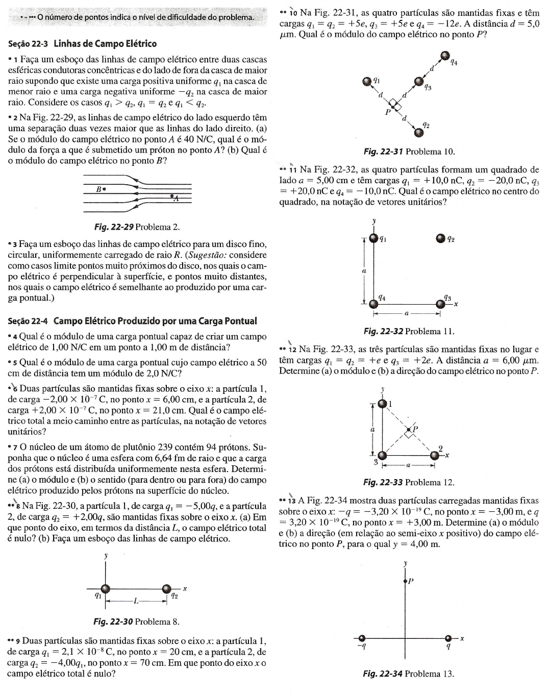 Se~ao22-3 Linhas de Campo Eh!trico • 1 Far;a urn esbor;o das linhas de campo eletrico entre duas cascas esfericas condutoras concentricas e do lado de fora da casca de maior raio supondo que existe uma carga positiva uniforme ql na casca de menor raio e uma carga negativa uniforme -q2 na casca de maior raio. Considere os casos ql > q2, ql = q2 e ql < q2' • 2 Na Fig. 22-29, as linhas de campo eletrico do lado esquerdo tern uma separar;ao duas vezes maior que as linhas do lado direito. (a) Se 0 modulo do campo eletrico no ponto A e 40 N/C, qual e 0 mo- dulo da forr;a a que e submetido urn proton no ponto A? (b) Qual e o modulo do campo eletrico no ponto B? "-ne ~.. e,-- 11./ Fig. 22-29 Problema 2. • 3 Far;a urn esbor;o das linhas de campo eletrico para urn disco fino, circular, uniformemente carregado de raio R. (Sugestiio: considere como casos limite pontos muito pr6ximos do disco, nos quais 0 cam- po eletrico e perpendicular a superffcie, e pontos muito distantes, nos quais 0 canlpo eletrico e semelhante ao produzido por uma car- ga pontual.) Se~ao22-4 Campo Eh!trico Produzido por uma Carga Pontual • 4 Qual e 0 modulo de uma carga pontual capaz de criar urn campo eletrico de 1,00 N/C em urn ponto a 1,00 m de distancia? • 5 Qual e 0 modulo de uma carga pontual cujo campo eletrico a 50 em de distancia tern urn modulo de 2,0 N/C? .'6 Duas partfculas sao mantidas fixas sobre 0 eixo x: a partfcula 1, de carga - 2,00 X 10-7 C, no ponto x = 6,00 em, e a partfcula 2, de carga +2,00 X 10-7 C, no ponto x = 21,0 em. Qual e 0 campo ele- trico total a meio caminho entre as partfculas, na notar;ao de vetores unitanos? • 7 0 llIicleo de urn aromo de plutonio 239 contem 94 protons. Su- ponha que 0 micleo e uma esfera com 6,64 fm de raio e que a carga dos protons estii distribufda uniformemente nesta esfera. Determi- ne (a) 0 modulo e (b) 0 sentido (para dentro ou para fora) do campo eletrico produzido pelos protons na superffcie do micleo. ..'sNa Fig. 22-30, a partfcula 1, de carga ql = -5,00q, e a partfcula 2, de carga q2 = +2,ooq, sao mantidas fixas sobre 0 eixo x. (a) Em que ponto do eixo, em termos da distancia L, 0 campo eletrico total e nulo? (b) Far;a urn esbor;o das linhas de campo eletrico. •• 9 Duas partfculas sao mantidas fixas sobre 0 eixo x: a partfcula 1, de carga ql = 2,1 X 10-8 C, no ponto x = 20 em, e a partfcula 2, de carga q2 = -4,00q I' no ponto x = 70 em. Em que ponto do eixo x 0 campo elerrico total e nulo? "10 Na Fig. 22-31, as quatro partfculas sao mantidas fixas e tern cargas ql = q2 = +5e, q3 = +5e e q4 = -12e. A distancia d = 5,0 /Lm. Qual e 0 modulo do campo eletrico no ponto P? Fig. 22-31 Problema 10. "11 Na Fig. 22-32, as quatro partfculas formam urn quadrado de lado a = 5,00 em e tern cargas ql = + 10,0 nC, q2 = -20,0 nC, q3 = + 20,0 nC e q4 = -10,0 ne. Qual e 0 campo eletrico no centro do quadrado, na notar;ao de vetores unitanos? I---a----l Fig. 22-32 Problema 11., •• 12 Na Fig. 22-33, as tres partfculas sao mantidas fixas no lugar e tern cargas ql = q2 = +e e q3 = +2e. A distancia a = 6,00/Lm. Determine (a) 0 modulo e (b) a direr;ao do campoeIetrico no ponto P. 1,,, :'<1 / , // "2 x 31---a---j Fig. 22-33 Problema 12. •• ~ A Fig. 22-34 mostra duas partfculas carregadas mantidas fixas sobre 0 eixox: -q = -3,20 X 10-19 C, no ponto x = -3,00 m, e q = 3,20 X 10-19 C, no ponto x = + 3,00 m. Determine (a) 0 modulo e (b) a direr;ao (em relar;ao ao semi-eixo x positivo) do campo ele- trico no ponto P, para 0 qual y = 4,00 m. Ismael Oval Ismael Oval Ismael Oval Ismael Oval Ismael Oval Ismael Strikeout , _ Fig. 22-35a mostra duas partfculas carregadas mantidas fi- re 0 eixo x a uma distancia L uma da outra. A razao q/qz _ os ,-alores absolutos das cargas das duas partfculas e 4,00. A - ~ 2.-- -b mostra a componente x, E,ol.X do campo eletrico no eixo _ . 'ta da partfcula 2, em funyao de x. (a) Para que valor de x> . or de E,OL< e maximo? (b) Se a earga da partfcula 2 e -qz = - . qual e 0 valor deste campo maximo? )' x (em) (b) Fig. 22-35 Problema 14. .5 A Fig. 22-36 mostra urn arranjo irregular de eletrons (e) e pro- ) obre urn areo de cireunfereneia de raio r = 2,00 em, com - .s os (JI = 30,0°, (Jz = 50,0°, (J3 = 30,0° e (J4 = 20,0°. Determine _ 0 mOdulo e (b) a direyao (em relayao ao semi-eixo x positivo) do eletrieo no centro do areo. )' Fig. 22-36 Problema 15. 6 A Fig. 22-37 mostra urn anel de phistieo de raio R = 50,0 em. Juas pequenas contas coloridas estao sobre 0 anel: aeonta 1, de carga - 00 jLC, e mantida fixa na extremidade esquerda, e a conta 2, de ga +6,00 jLC, pode ser deslocada ao longo do anel. As duas con- produzem, juntas, urn campo eletrico de modulo E no centro do el. Determine (a) urn valor positivo e (b) urn valor negativo do - gulo (J para que E = 2,00 X 105 N/C? J S~ao 22-5 Campo Eletrico Produzido por um Dipolo Eletrico • 17 Calcule 0 momenta dipolar eletrico de urn eletron e urn proton separados por uma distancia de 4,30 nm . •• 18 As Eqs. 22-8 e 22-9 fornecem 0 valor aproximado do modulo do campo eletrico de urn dipolo eletrieo em pontos sobre 0 eixo do dipolo. Considere urn ponto P sobre este eixo a uma distancia z = 5,OOd do centro do dipolo, onde de a distancia entre as partfculas que formam 0 dipolo. Seja Eapr 0 valor aproximado do modulo do campo no ponto P, dado pelas Eqs. 22-8 e 22-9, e Ever 0 valor verda- deiro do campo. Determine a razao Eap/Ever' •• 19 A Fig. 22-38 mostra urn dipolo eletrieo. Determine (a) 0 mo- dulo e (b) a orientayao (em relayao ao semi-eixo x positivo) do campo eletrico produzido pelo dipolo em urn ponto P situado a uma dis- tancia r ;» d. +qT d/2 6__ r __ ••r p d/2 -q • •• 20 0 campo eletrico de urn dipolo eletrico em pontos sobre 0 eixo do dipolo e dado aproximadamente pelas Eqs. 22-8 e 22-9, obtidas eonsiderando apenas os dois primeiros termos das duas expans6es binomiais que aparecem na Eq. 22-7. Se fosse eonsiderado urn nu- mero maior de termos das expans6es binomiais, qu
