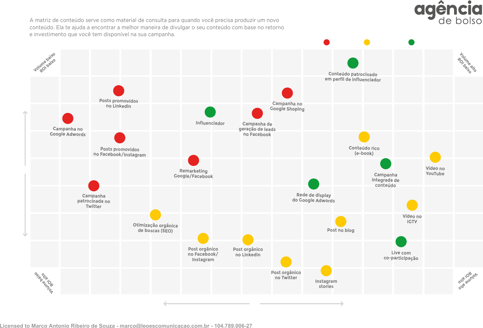 Matriz de conteúdo A matriz de conteúdo serve como material de consulta para quando você precisa produzir um novo conteúdo. Ela te ajuda a encontrar a melhor maneira de divulgar o seu conteúdo com base no retorno e investimento que você tem disponível na sua campanha. Mídia paga Mídia própria Mídia de terceiro M e n o s in ve st im e n to M ai s in ve st im e n to Menor potencial de resultados Maior potencial de resultados Vo lum e b aix o RO I b aix o Vo lu m e ba ixo RO I a lto Posts promovidos no Linkedin Campanha no Google Adwords Posts promovidos no Facebook/Instagram Remarketing Google/Facebook Otimização orgânica de buscas (SEO) Post orgânico no Facebook/ Instagram Post orgânico no Linkedin Post orgânico no Twitter Post no blog Vídeo no YouTube Campanha patrocinada no Twitter Campanha no Google Shoping Volume alto ROI alto Volum e alto ROI baixo Campanha de geração de leads no Facebook Instagram stories Live com co-participação Campanha integrada de conteúdo Rede de display do Google Adwords Influenciador Conteúdo patrocinado em perfil de influenciador Vídeo no IGTV Conteúdo rico (e-book) Licensed to Marco Antonio Ribeiro de Souza - marco@leoescomunicacao.com.br - 104.789.006-27
