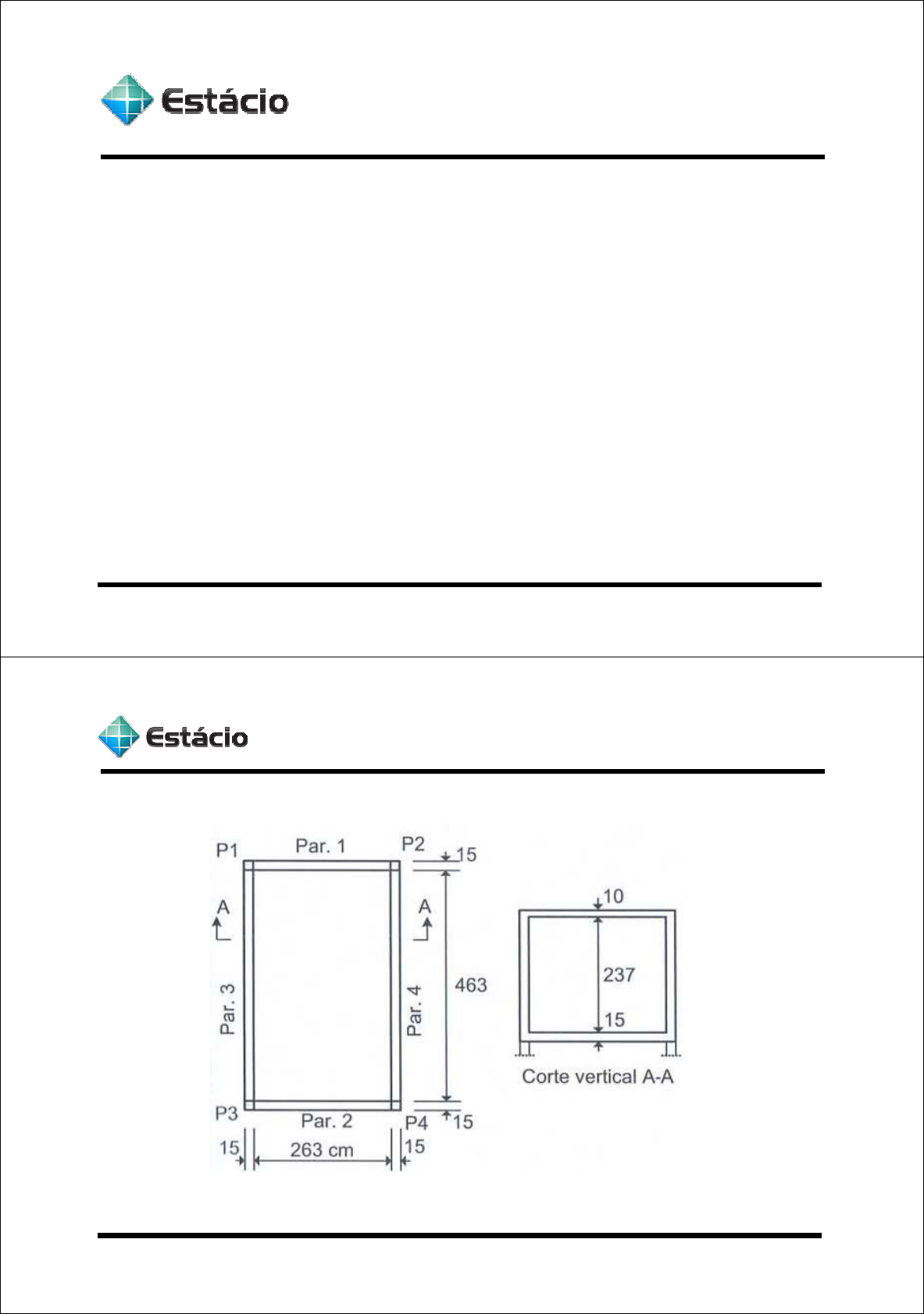 Estruturas de Concreto III – CCE0185 Aula 04 Prof: Jair Gonçalves de Oliveira Borges jair.borges.estacio@gmail.com UNESA – UNIVERSIDADE ESTÁCIO DE SÁ CURSO – ENGENHARIA CIVIL 2Profº Jair Borges Estruturas de Concreto III – CCE0185 Dimensionamento de Reservatório Elevado � Dimensionar o reservatório da figura abaixo 3Profº Jair Borges Estruturas de Concreto III – CCE0185 Dimensionamento de Reservatório Elevado a - Ações atuantes na laje de tampa: peso próprio (0,10 x 25) = 2,5 kN/m2 revestimento adotado = 1,00 kN/m2 sobrecarga NBR 6120 = 0,50 kN/m2 total p1 = 4, 0 kN/m2 b –Calculo das reações e momentos λ=2,78/4,78 = 0,581 ≡ 0,60 Rx = 0,001x267x4,0x2,78=3 kN/m Ry = 0,001x340x4,0x2,78=3,8 kN/m Mx = 0,001x86,9x 4,0x(2,78)2 = 2,70kN.m/m My = 0,001x40,7x 4,0x(2,78)2 = 1,30kN.m/m lx=2,78 ly = 4, 78 1 – Cálculo como lajes 4Profº Jair Borges Estruturas de Concreto III – CCE0185 Dimensionamento de Reservatório Elevado 1 – Cálculo como lajes 5Profº Jair Borges Estruturas de Concreto III – CCE0185 Dimensionamento de Reservatório Elevado a - Ações atuantes na laje de fundo: peso próprio (0,15 x 25) = 3,75 kN/m2 revestimento adotado = 1,00 kN/m2 pressão hidrostática = 2,37x10=23,7 kN/m2 total p2 ≡ 29 kN/m2 b –Calculo das reações e momentos λ=2,78/4,78 = 0,581 ≡ 0,60 Rx = 0,001x244x29x2,78=19,7 kN/m Ry = 0,001x353x29x2,78=28,5 kN/m Mx = 0,001x38,2x 29x(2,78)2 = 8,6 kN.m/m My = 0,001x14,9x 29x(2,78)2 = 3,3 kN.m/m Xx = 0,001x78,4x29x(2,78)2 = 17,6kN.m/m Xy = 0,001x56,2x29x(2,78)2 = 12,6kN.m/m 1 – Cálculo como lajes lx=2,78 ly = 4, 78 6Profº Jair Borges Estruturas de Concreto III – CCE0185 Dimensionamento de Reservatório Elevado 1 – Cálculo como lajes 7Profº Jair Borges Estruturas de Concreto III – CCE0185 Dimensionamento de Reservatório Elevado a - Ações atuantes nas paredes 1 e 2: pressão hidrostática = 2,37x10=23,7 kN/m2 total p3 ≡ 24 kN/m2 b –Calculo das reações e momentos λ=2,50/2,78 = 0,89 ≡ 0,90 Rx = 0,001x122x12x2,50=3,7 kN/m Rxe = 0,001x293x12x2,50=8,8 kN/m Ry = 0,001x325x12x2,50=9,8 kN/m Mx = 0,001x12,9x 24x(2,5)2 = 1,9kN.m/m My = 0,001x10,5x 24x(2,5)2 = 2,0 kN.m/m Xx = 0,001x30,7x24x(2,5)2 = 4,6kN.m/m Xy = 0,001x39,5x24x(2,5)2 = 5,9kN.m/m lx=2,50 ly=2,78 1 – Cálculo como lajes 8Profº Jair Borges Estruturas de Concreto III – CCE0185 Dimensionamento de Reservatório Elevado 1 – Cálculo como lajes 9Profº Jair Borges Estruturas de Concreto III – CCE0185 Dimensionamento de Reservatório Elevado 1 – Cálculo como lajes 10Profº Jair Borges Estruturas de Concreto III – CCE0185 Dimensionamento de Reservatório Elevado a - Ações atuantes nas paredes 3 e 4: pressão hidrostática = 2,37x10=23,7 kN/m2 total p3 ≡ 24 kN/m2 b –Calculo das reações e momentos λ=2,50/4,78 = 0,52 ≡ 0,50 Rx = 0,001x221x12x2,50=6,6 kN/m Rxe = 0,001x434x12x2,50=13 kN/m Ry = 0,001x345x12x2,50=10,4 kN/m Mx = 0,001x9,4x 24x(2,5)2 = 1,4kN.m/m My = 0,001x26x 24x(2,5)2 = 3,9 kN.m/m Xx = 0,001x36,2x24x(2,5)2 = 5,4kN.m/m Xy = 0,001x62,1x24x(2,5)2 = 9,3kN.m/m lx=2,50 ly=4,78 1 – Cálculo como lajes 11Profº Jair Borges Estruturas de Concreto III – CCE0185 Dimensionamento de Reservatório Elevado 1 – Cálculo como lajes • Compatibilização dos momentos fletores entre paredes • Da compatibilização, tem-se o momento fletor final, mk o maior dentre os valores: • (4,6+ 5,4)/2 = 5 kN.m/m ; • 0,8 . 5,4 = 4,32 kN.m/m 12Profº Jair Borges Estruturas de Concreto III – CCE0185 Dimensionamento de Reservatório Elevado 1 – Cálculo como lajes • Compatibilização dos momentos fletores entre fundo e parede 1 e 2 • Da compatibilização, tem-se o momento fletor final, mk o maior dentre os valores: • (12,6+ 5,9)/2 = 9,3 kN.m/m ; • 0,8 . 12,6 = 10,8 kN.m/m 13Profº Jair Borges Estruturas de Concreto III – CCE0185 Dimensionamento de Reservatório Elevado 1 – Cálculo como lajes • Compatibilização dos momentos fletores entre fundo e parede 3 e 4 • Da compatibilização, tem-se o momento fletor final, mk o maior dentre os valores: • (17,6+ 9,3)/2 = 13,5 kN.m/m ; • 0,8 . 17,6 = 14,08 kN.m/m 14Profº Jair Borges Estruturas de Concreto III – CCE0185 Dimensionamento de Reservatório Elevado 1 – Cálculo como lajes • Compatibilização dos momentos fletores positivos no fundo • Mx = 8,6 + (17,6 – 14,08) = 12,1 kN.m/m • My = 3,3 + (12,6 – 10,8) = 5,1 kN.m/m 15 Dimensionamento de Reservatório Elevado 1 – Cálculo como lajes • Esforços finais para dimensionamento (Momentos em kNm/m) • Esforços finais para dimensionamento (Esforços normais em kN/m) Paredes 1 e 2 Paredes 3 e 4 16Profº Jair Borges Estruturas de Concreto III – CCE0185 Dimensionamento de Reservatório Elevado 1 – Cálculo como lajes • Dimensionamento • Classe de agressividade ambiental – II • Cobrimento – 2,5 cm • fck – 25 Mpa • Tampa: b=100cm, h=10cm, d=7cm • Fundo e paredes: b=100cm, h=15cm, d=12cm 17Profº Jair Borges Estruturas de Concreto III – CCE0185 Dimensionamento de Reservatório Elevado 1 – Cálculo como lajes 18Profº Jair Borges Estruturas de Concreto III – CCE0185 Dimensionamento de Reservatório Elevado 2 – Cálculo como viga parede • Cargas 19Profº Jair Borges Estruturas de Concreto III – CCE0185 Dimensionamento de Reservatório Elevado 2 – Cálculo como viga parede • Esforços 20Profº Jair Borges Estruturas de Concreto III – CCE0185 Dimensionamento de Reservatório Elevado 2 – Cálculo como viga parede • Dimensionamento das paredes 1 e 2 21Profº Jair Borges Estruturas de Concreto III – CCE0185 Dimensionamento de Reservatório Elevado 2 – Cálculo como viga parede • Dimensionamento das paredes 1 e 2 Fazendo temos Largura do apoio Então Como temos que garantir 22Profº Jair Borges Estruturas de Concreto III – CCE0185 Dimensionamento de Reservatório Elevado 2 – Cálculo como viga parede • Dimensionamento das paredes 1 e 2 23Profº Jair Borges Estruturas d