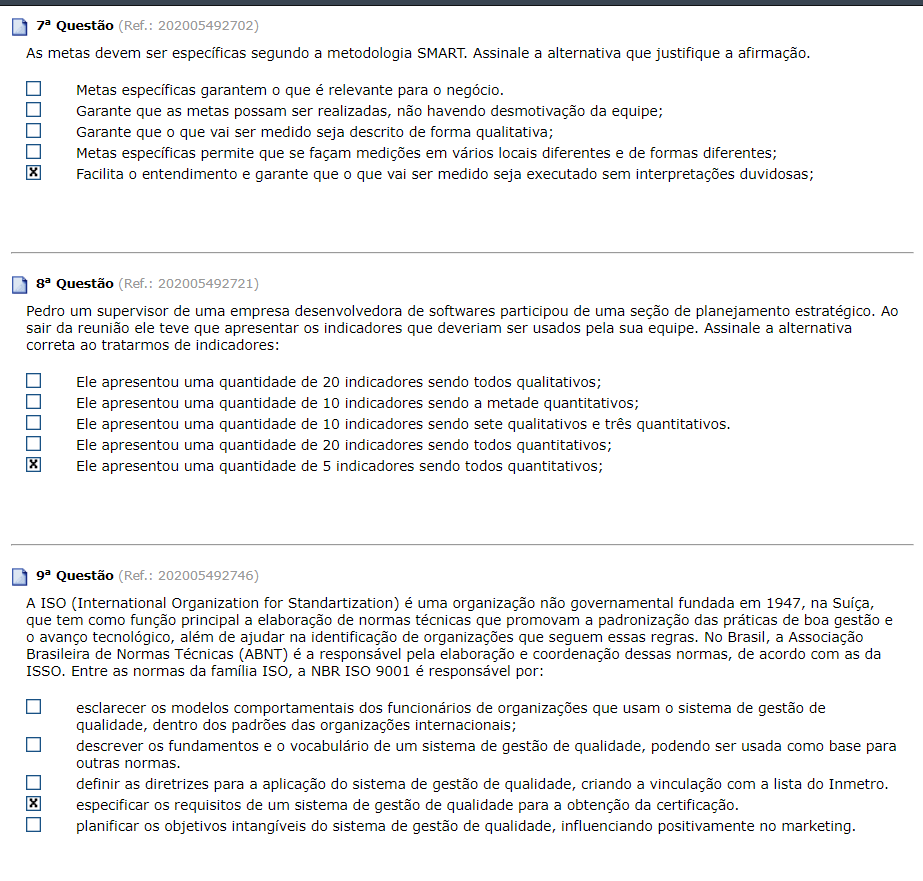 A ISO (International Organization for Standartization) é uma organização não governamental fundada em 1947, na que tem como função principal a elaboração de normas técnicas que promovam a padronização das práticas de boa gestão e o avanço tecnológico, além de ajudar na identificação de organizações que seguem essas regras. No Brasil, a Associação Brasileira de Normas Técnicas (ABNT) é a responsável pela elaboração e coordenação dessas normas, de acordo com as da ISSO. Entre as normas da família ISO, a NBR ISO 9001 é responsável por: esclarecer os modelos comportamentais dos funcionários de organizações que usam o sistema de gestão de qualidade, dentro dos padrões das organizações internacionais. descrever os fundamentos e o vocabulário de um sistema de gestão de qualidade, podendo ser usada como base para outras normas. definir as diretrizes para a aplicação do sistema de gestão de qualidade, criando a vinculação com a lista do Inmetro. especificar os requisitos de um sistema de gestão de qualidade para a obtenção da certificação. planificar os objetivos intangíveis do sistema de gestão de qualidade, influenciando positivamente no marketing.
