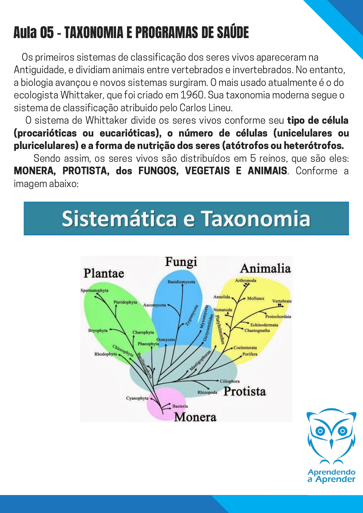Os primeiros sistemas de classificação dos seres vivos apareceram na Antiguidade, e dividiam animais entre vertebrados e invertebrados. No entanto, a biologia avançou e novos sistemas surgiram. O mais usado atualmente é o do ecologista Whittaker, que foi criado em 1960. Sua taxonomia moderna segue o sistema de classificação atribuido pelo Carlos Lineu. O sistema de Whittaker divide os seres vivos conforme seu tipo de célula (procarióticas ou eucarióticas), o número de células (unicelulares ou pluricelulares) e a forma de nutrição dos seres (atótrofos ou heterótrofos. Sendo assim, os seres vivos são distribuídos em 5 reinos, que são eles: MONERA, PROTISTA, dos FUNGOS, VEGETAIS E ANIMAIS. Conforme a imagem abaixo: Aula 05 - TAXONOMIA E PROGRAMAS DE SAÚDE Classificar em biologia é agrupar os Seres Vivos em função de seus parentescos. A classificação criada por Lineu é como uma escala, em que cada categoria faz parte de outra mais ampla. Por isso foi criado então grupos taxonômicos , que são eles: REINO, FILO, CLASSE, ORDEM, FAMÍLIA, GÊNERO e ESPÉCIE. Veja na figura colocada abaixo: Para que cada espécie seja correta e coerentemente identificada por todos, os cientistas convecionaram adotar uma nomenclatura. Conforme essas regras, todo ser vivo é identificado por gênero e espécie, com um modo especial de grafar. Exemplo: Nome cientifico do Mico-leão-dourado Classificação e Nomenclatura O nome do gênero vem antes de tudo e com inicial maiúscula. Leontopithecus rosalia O nome da espécie é escrita em minúscula. Todos os nomes são escritos em Latim e em caracteres itálicos. Lingua Oficial: Latim Espécie tem que ser binominal , escrita em letra cursiva e em destaque. A subespécie é Trinominal, cursiva e também em destaque. Exemplo: Homo Sapiens Exemplo: Homo Sapiens Sapiens Dica para a Enem: As famílias terminadas em - IDAE são animais e as terminadas em - CEAE são plantas. Domínios de Woese Em 1990, quando os conhecimentos de genética davam impulso a biologia molecular, o físico chamado Carl Richard Woese criou outro sistema de classificação depois de descobrir diferenças importantes do RNA ribossômico de vários seres procariontes, que se refletem na bioquímica e no modo de vida de cada tipo de organismo, que por isso não deveriam ser incluidos no Reino Monera. Ele então propôes dividir os organismos desse Reino em dois grandes domínios: BACTERIA (bactérias atuais e cianobactérias) e ARCHAEA ( com as bactérias primitivas). Ele criou, ainda, um outro domínio: EUCARYA, com todos os reinos de eucariontes (protistas, fungos, animais e vegetais). Regras básicas de Taxonomia (classificação) Doença Adquirida: Quando um ser pega (adquiri) ao longo da vida Doença Congênita: Quando a doença é adquirida na barriga da mãe (através da placenta) Doença Hereditaria: É aquela doença que vem escrita nos Genes. Epidemias: Surto em um local específico (Zica, Dengue...) Pandemia: Um surto em escala Global, como é o caso do corona-vírus Endemia: São doenças que se mantém constantes em um determinado local, como por exemplo a malária. Imunização: Além disso, essa imunização pode ser ativa ou passiva. A imunização ativa ocorre quando o indivíduo é responsável por produzir seus próprios anticorpos a partir de contato com o antígeno, gerando memória imune. A vacina é um exemplo de imunização ativa artificial. Vacinas são compostas por antígenos mortos, fragmentados ou enfraquecidos, fornecendo ao corpo contato com os agentes etiológicos de dadas doenças sem fornecer os sintomas que os acompanham, imunizando o corpo contra aquela doença específica. Vale ressaltar que vacinas são medidas preventivas. Na imunização passiva, por outro lado, os anticorpos foram produzidos por outro organismo. Pode ser pela mãe, passando o anticorpo pela amamentação (caso de imunização passiva natural) ou pode ser um soro feito a partir de anticorpos extraídos de dado animal (imunização passiva artificial). O soro, ao contrário da vacina, é curativo, mas NÃO gera memória imunológica. Se o antígeno for contraído uma vez e tratado com soro, a aplicação de soro será necessária em caso de nova infecção, enquanto o mesmo não é válido para as vacinas, já que elas geram memória imune, protegendo contra infecções subsequentes. Conceitos gerais em saúde Doenças: Imunização: Presença de anticorpos contra dado antígeno. Anticorpos: Proteínas de defesa contra um antígeno específico, que pode vir de forma natural (contraindo a própria doença, por exemplo) ou artificial (vacinas e soros, por exemplo). Além disso, essa imunização pode ser ativa ou passiva. A imunização ativa ocorre quando o indivíduo é responsável por produzir seus próprios anticorpos a partir de contato com o antígeno, gerando memória imune. A vacina é um exemplo de imunização ativa artificial. Vacinas são compostas por antígenos mortos, fragmentados ou enfraquecidos, fornecendo ao corpo contato com os agentes etiológicos de dadas doenças sem fornecer os sintomas que os acompanham, imunizando o corpo contra aquela doença específica. Vale ressaltar que vacinas são medidas preventivas. Na imunização passiva, por outro lado, os anticorpos foram produzidos por outro organismo. Pode ser pela mãe, passando o anticorpo pela amamentação (caso de imunização passiva natural) ou pode ser um soro feito a partir de anticorpos extraídos de dado animal (imunização passiva artificial). O soro, ao contrário da vacina, é curativo, mas NÃO gera memória imunológica. Se o antígeno for contraído uma vez e tratado com soro, a aplicação de soro será necessária em caso de nova infecção, enquanto o mesmo não é válido para as vacinas, já que elas geram memória imune, protegendo contra infecções subsequentes.