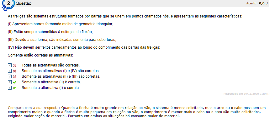 As treliças são sistemas estruturais formados por barras que se unem em pontos chamados nós, e apresentam as seguintes características: Apresentam barras formando malha de geometria triangular, (II) Estão sempre submetidas à esforços de (III) Devido a sua forma, são indicadas somente para coberturas; (IV) Não devem ser feitos carregamentos ao longo do comprimento das barras das treliças; Somente estão corretas as afirmativas: Todas as alternativas são corretas. Somente as alternativas (II) e (III) são corretas. Somente a alternativa (II) é correta. Somente a alternativa (IV) é correta.