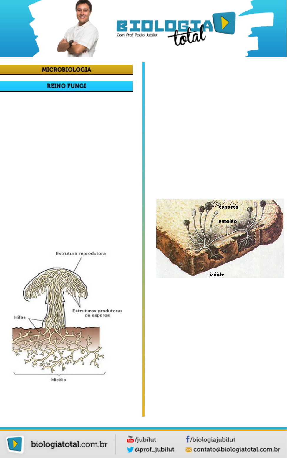 Os organismos pertencentes a esse reino, foram excluídos do Reino Vegetal com base em três características que os diferencia das plantas: os fungos não possuem clorofila ou qualquer outro pigmento que lhes permita fazer fotossíntese e, portanto, são heterótrofos por saprofitismo ou parasitismo. Suas células apresentam parede células com depósito de quitina, não possuindo celulose. A reserva energética desses organismos é feita na forma de glicogênio, substância tipicamente animal. Os fungos podem ser uni ou pluricelulares, sendo encontrados nos mais diversos ambientes, principalmente naqueles onde encontram alto teor de umidade, sombra e calor. Quanto à obtenção de energia, podem ser aeróbicos ou anaeróbicos (fermentativos). O corpo dos fungos está formado por filamentos de células denominados hifas. As hifas agrupam-se formando um emaranhado, o micélio, onde existem hifas encarregadas da nutrição o fungo (hifas vegetativas) e outras responsáveis pela reprodução. Estas últimas podem, em certas espécies, formarem um conjunto organizado denominado corpo de frutificação, como é o caso dos cogumelos. Estrutura de um fungo Os fungos são divididos em mixomicetos e eumicetos. Os mixomicetos são protozoários ameboides que se organizam em grandes massas citoplasmáticas denominadas plasmódios, capazes de emitir pseudópodos e se locomoverem no meio ambiente. São saprófitas, ou seja, vivem à custa de matéria orgânica morta. Durante algum tempo eles eram considerados fungos, porém, bem recentemente os taxonomistas colocaram eles fora do Reino Fungi. Os eumicetos, ou fungos verdadeiros, apresentam a estrutura corporal com hifas e micélio como já foi citado. São divididos em várias classes, entre as quais estão: ZIGOMICETOS Existem espécies microscópicas que podem parasitar plantas e animais inferiores e outras conhecidas por bolores, que atacam alimentos e outros tipos de matéria orgânica, como madeira, couro, etc., da qual se alimentam. Um exemplo conhecido é o bolor negro do pão, causado pelo fungo Rhyzopus stolonifer, que decompõe o amido da massa do pão para obtenção de glicose. Em seu ciclo de vida apresentam tanto reprodução sexuada como assexuada. Podem ser aquáticos e terrestres. Pão mofado por Rhizopus stolonifer ASCOMICETOS A maioria dos fungos pertence a esse grupo. Suas hifas se organizam formando pequenos sacos onde existem as estruturas formadoras de esporos. Neste grupo, temos como exemplo o Saccharomyces sp (fermento do pão), o Penicillium (produtor da penicilina) e o Aspergillus (bolor azulado que ataca frutas, pães e outros alimentos). Sua reprodução pode ser assexuada por brotamento, como por exemplo, no Saccharomyces sp, que é unicelular, ou então através de esporos. Podem também reproduzir-se de forma sexuada. Bolor das frutas (Penicillium sp) BASIDIOMICETOS Aqui estão presentes os cogumelos de chapéu e as orelhas de pau. São fungos mais evoluídos. Os basidiomicetos apresentam a porção vegetativa subterrânea e na superfície observa-se o corpo de frutificação, em forma de chapéu ou píleo que abriga as estruturas produtoras de esporos. Orelha-de-pau Existe ainda um grupo de fungos que não formam zoósporos e cuja fase sexuada não é conhecida. Eles se reproduzem apenas por esporos originados por mitoses, apenas de forma assexuada. São os chamados Deuteromicetos, conhecidos como fungos imperfeitos. Como exemplo, podemos citar o Candida albicans, causador do sapinho e da candidíase. IMPORTÂNCIA DOS FUNGOS 1) Importância agrícola – muitos fungos são prejudiciais para o desenvolvimento das plantas. Podemos citar como exemplo o fungo que ocasiona a chamada ferrugem do café, o carvão, que destrói lavouras de cereais e os bolores que atacam os frutos cítricos. Por outro lado, alguns fungos são capazes de se associar mutualisticamente às raízes de plantas, formando um tipo de relação ecológica de simbiose chamada Micorriza. Algumas espécies podem auxiliar os agricultores. Por volta de 1920, os japoneses descobriram uma espécie de fungo que aumentava o crescimento dos caules nas plantações de arroz. Pesquisas posteriores levaram ao isolamento de uma do fungo Giberella fujikuroi, cujo princípio ativo eliminava o nanismo das plantas. Essa substância hoje amplamente utilizada é o hormônio giberelina que inclusive induz a formação de frutos sem sementes. Não podemos deixar de mencionar a importância dos cogumelos na alimentação humana e dos fungos de ação fermentativa utilizados na fabricação de bebidas, do álcool combustível e do pão. 2) Importância ecológica dos fungos – muitos fungos atuam como saprófagos, juntamente com bactérias, decompondo a matéria orgânica morta dos ecossistemas, cujos minerais são devolvidos ao solo, recompondo a retirada deles pelos vegetais. Temos como exemplo os cogumelos de chapéu e as orelhas- de-pau. Além da ação decompositora, os fungos também se associam às raízes de plantas leguminosas formando as micorrizas, aumentando assim a capacidade de absorção de água e sais pelas raízes. Micorriza (mutualismo entre hifas de fungos e raízes de plantas) 3) Importância médica e farmacêutica – os fungos produzem substâncias que inibem o crescimento de certas bactérias. São eles que fornecem os antibióticos. O mais conhecido é o Penicillium notatum, do qual se extrai a penicilina, primeiro antibiótico descoberto. Outras espécies são parasitas do ser humano, causando micoses como pé-de-atleta e a ptiríase. Temos também nessa categoria os fungos que produzem substâncias tóxicas, como os do gênero Amanita sp, o Claviceps sp, que produz a ergotamina, da qual se extrai o LSD, droga alucinógena. Os índios mexicanos utilizam em seus rituais religiosos o chá do cogumelo da espécie Psilocybe mexicana. Amanita muscaria Psilocybe mexicana (Cogumelos alucinógenos) LIQUENS Liquens são associações mutualísticas entre 