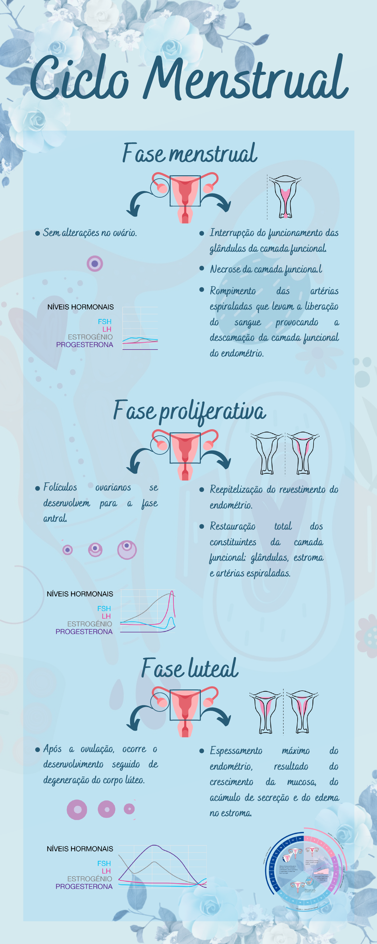 Fase menstrual Fase proliferativa Fase luteal Sem alterações no ovário. Interrupção do funcionamento das glândulas da camada funcional. Ciclo Menstrual Necrose da camada funciona.l Rompimento das artérias espiraladas que levam a liberação do sangue provocando a descamação da camada funcional do endométrio. Folículos ovarianos se desenvolvem para a fase antral. Reepitelização do revestimento do endométrio. Restauração total dos constituintes da camada funcional: glândulas, estroma e artérias espiraladas. Após a ovulação, ocorre o desenvolvimento seguido de degeneração do corpo lúteo. Espessamento máximo do endométrio, resultado do crescimento da mucosa, do acúmulo de secreção e do edema no estroma.