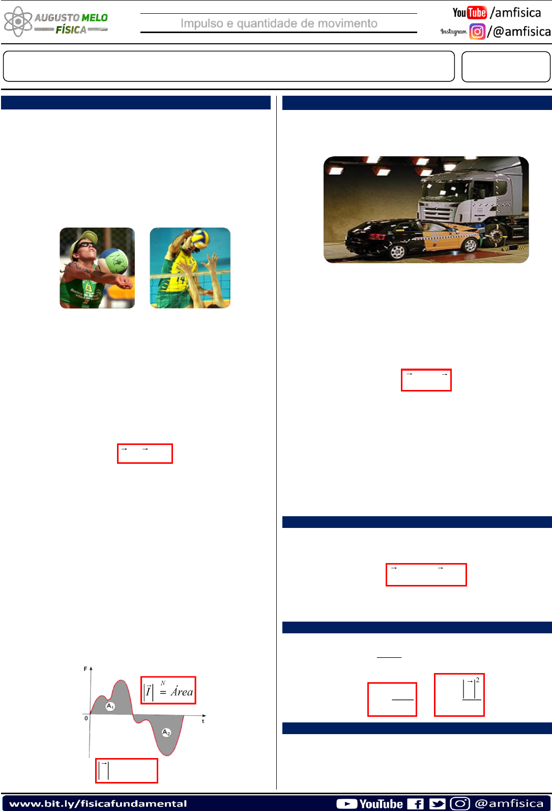 DATA: NOME: Impulso e quantidade de movimento Impulso (�⃗�) O conceito físico Impulso está relacionado com a força aplicada durante um intervalo de tempo. Quando chutamos ou arremessamos uma bola estamos movimentando objetos a partir da ação da mão, do pé ou de um equipamento apropriado, como por exemplo, em uma partida de sinuca. O contato põe a bola em movimento, muda sua trajetória, aumenta ou diminui sua velocidade. Os principais fatores contribuem para o efeito produzido são: a força aplicada e o tempo de sua aplicação. No momento do corte, um jogador de vôlei exerce uma força sobre a bola e modifica seu movimento. A bola interage com a mão do jogador durante um tempo extremamente curto, da ordem de centésimos de segundo, mas como a intensidade da força é bastante grande, o impulso produzido é suficiente para que a bola parta com grande velocidade – dizemos que a bola recebeu um impulso das mãos do jogador. Fisicamente, o impulso é definido como o produto entre a força aplicada num objeto e o intervalo de tempo de sua atuação. I F t= Unidades no SI: I = Impulso [newton x segundo (N.s)] F = Força constante [newton (N)] ∆t = Intervalo de tempo [segundo (s)] O Impulso é uma grandeza que necessita de direção e sentido para sua total caracterização, portanto ela é uma grandeza vetorial. • Módulo: I = F x ∆t • Direção: igual à direção da força. • Sentido: igual ao sentido da força. No caso em que a força aplicada sobre o corpo seja variável, é fornecido um diagrama do valor algébrico da força de direção constante atuante em uma partícula em função do tempo, a área compreendida entre o gráfico e o eixo dos tempos expressa o valor algébrico do impulso da força. 1 2I A A= + Soma algébrica Quantidade de movimento (�⃗⃗⃗�) Imagine uma colisão frontal entre uma carreta carregada e um automóvel, ambos com velocidade instantânea de mesmo módulo. Fica evidente que o automóvel ficará mais danificado que a carreta. Por quê? Se ambos colidiram com velocidade de mesmo módulo? A explicação para isso está na quantidade de movimento. Definimos quantidade de movimento como uma grandeza vetorial, dada pelo produto entre a massa do objeto e sua velocidade vetorial. Q m V= A quantidade de movimento é também chamada momento linear ou ainda momentum. No Sistema Internacional de Unidades (SI) a quantidade de movimento é dada por [Q] = kg.m/s Por ser uma grandeza vetorial temos para a quantidade de movimento: • Intensidade: Q = m x V • Direção: mesma de V. • Sentido: mesmo de V. Princípio da conservação da quantidade de movimento Num sistema mecânico isolado de forças externas, conserva-se a quantidade de movimento total. INICIAL FINALQ Q= Sendo a quantidade de movimento uma grandeza vetorial, não variam módulo, direção e sentido. Quantidade de movimento e energia cinética 2 2 2 c c mV E E mV V= = 2 CEQ m = ou 2 2 c Q E m = Teorema do Impulso O impulso da resultante (impulso total) das forças que agem sobre uma partícula é igual à variação de sua quantidade de movimento: 2 Impulso e quantidade de movimento I F t I m a t V I m t = = = t I m V = I Q= Teorema do Trabalho 2 2 2 2 2 2 0 0 0 2 2 22 0 0 2 2 2 2 2 2 V V V V a S V V ad ad F d m a d V V mVmV m − = + − = = = = − = = − T T T T cE= T Vetor variação de velocidade Colisões Nas colisões ou choques mecânicos entre os corpos, há sempre uma fase de deformação. Uma segunda fase é a restituição, que pode ou não acontecer. Durante o processo de deformação, a energia cinética do sistema pode ser transformada em: • Energia potencial elástica • Energia térmica • Energia sonora • Trabalho nas deformações permanentes, etc. Se ocorrer a fase de restituição, a energia potencial elástica (armazenada na deformação) é retransformada em energia cinética. Pode haver, ainda, mais parcelas de conversão em energias térmica e sonora. As colisões mecânicas podem ser classificadas em: • Perfeitamente elástica: a restituição ocorre fazendo reaparecer toda a energia cinética inicial na forma de energia cinética final. FINAL INICIALC C E E= • Parcialmente elástica: a restituição ocorre com perda parcial de energia cinética. FINAL INICIALC C E E • Perfeitamente inelástica ou anelástica: após a deformação, não ocorre restituição e os corpos permanecem juntos. FINAL INICIALC C E E Coeficiente de restituição (e) Nas colisões frontais, define-se o coeficiente de restituição (e) como sendo: velocidade relativa depois do choque velocidade relativa antes do choque e = • Choque perfeitamente elástico 1e = • Choque parcialmente elástico 0 1e • Choque perfeitamente inelástico 0e = Velocidade relativa Sistemas Exercícios 01. (SSA) Um veículo aéreo não tripulado (VANT), também conhecido como “drone”, percorre, em 2,0 segundos, a trajetória curva entre dois pontos A e B que pertencem a um mesmo plano horizontal. A figura a seguir ilustra a vista superior do movimento. Sabendo que o veículo de 250 g de massa realiza o movimento com altura constante em relação ao solo, é CORRETO afirmar que, entre os pontos A e B, 3 Impulso e quantidade de movimento a) o módulo da velocidade média do veículo foi igual a 6,0 m/s. b) o módulo da força resultante média que produziu essa trajetória foi igual a 0,5 N. c) o módulo do impulso sobre o veículo foi igual a 0,5 Ns. d) o módulo da aceleração média do veículo foi igual a 2(3)1/2 m/s2. e) a força de sustentação média em suas asas foi igual a 25 N. 02. Um jogador de futebol cobra uma falta frontal e acerta o canto superior esquerdo da baliza, marcando o gol do título. Suponha que a bola, com massa de 400 g, tenha seguido uma trajetória parabólica e levado 1,0 s para atingir a meta. Se a falta foi marcada a 20 m de distância da linha de fundo e a bola atingiu o gol à altura de 2,0 m, qual é o vetor força média que o jogador imprim